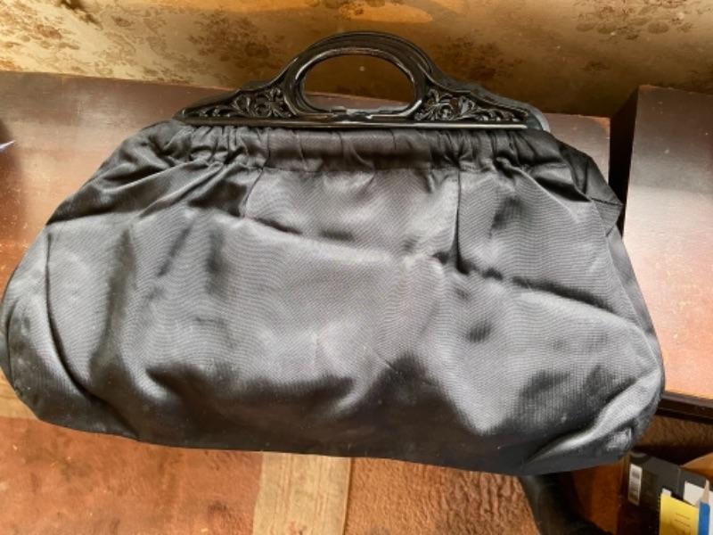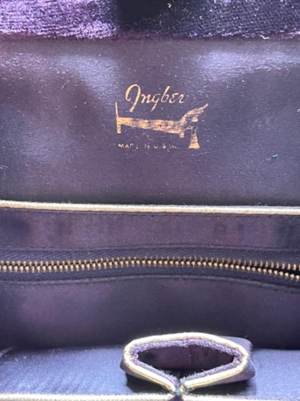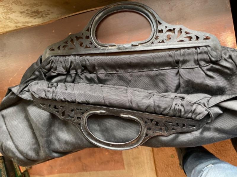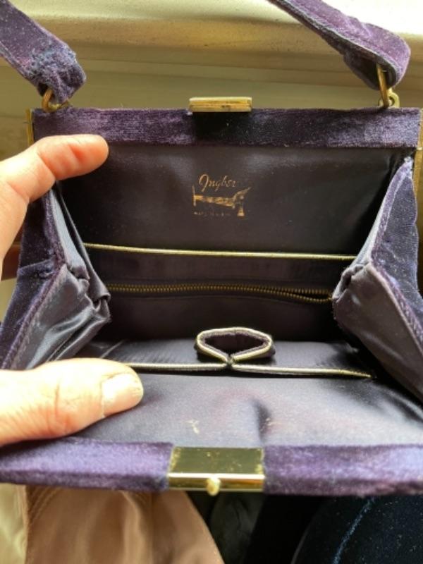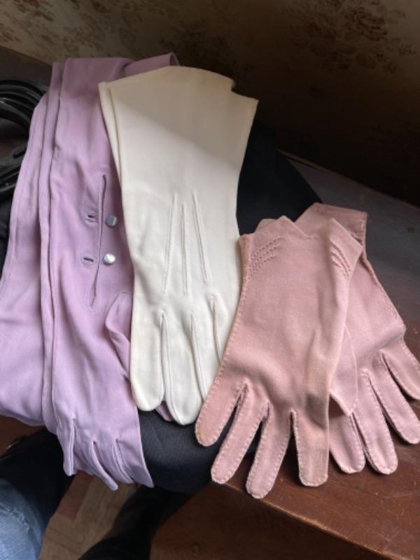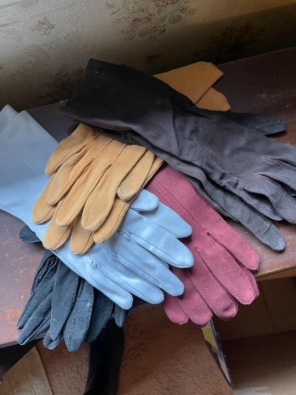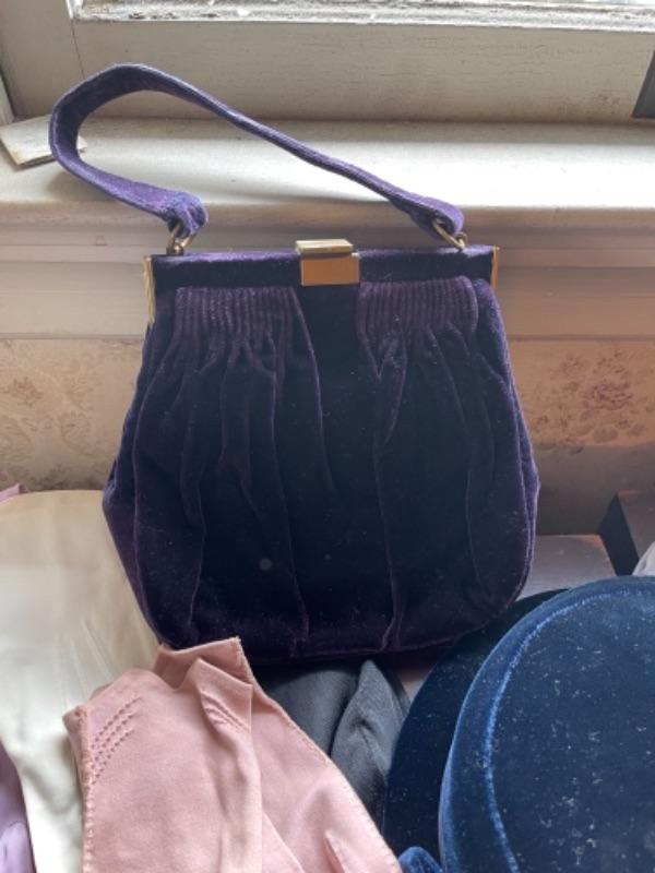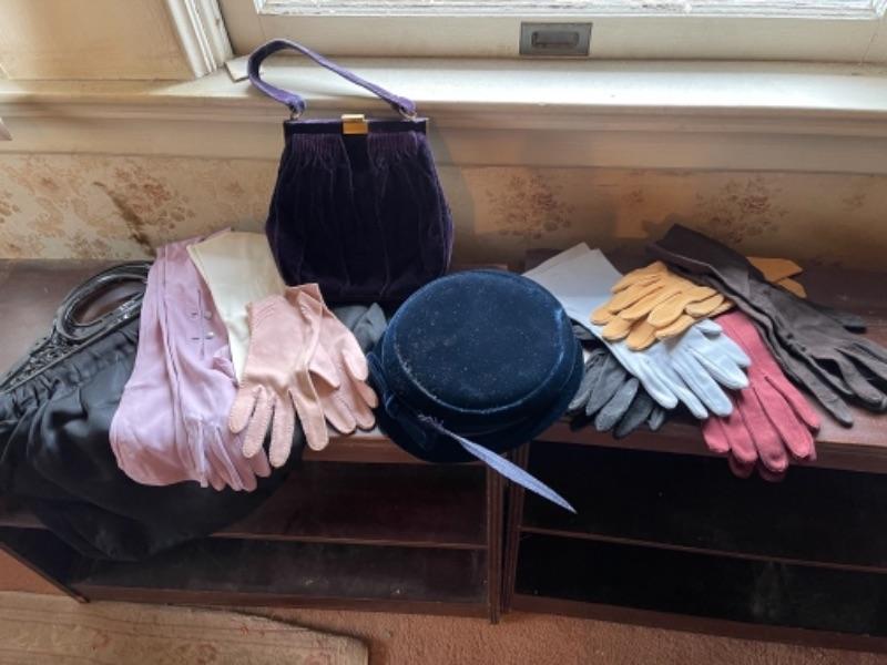 Lot 113B1. Blue velvet hat, purple velvet purse, large assortment of gloves (size 6 to 7), knitting bag--$150
