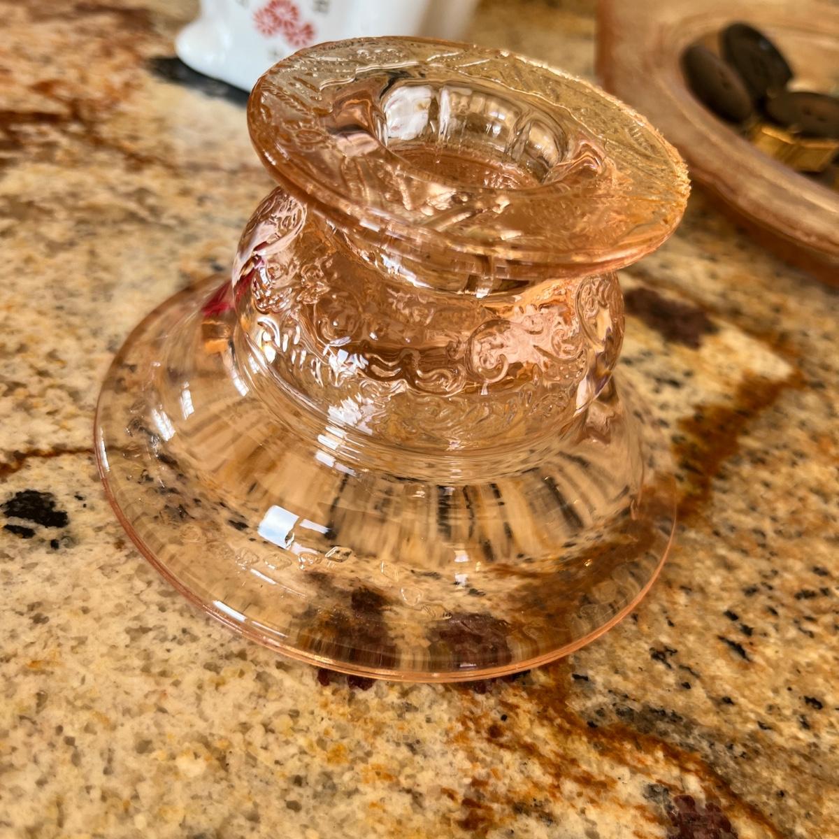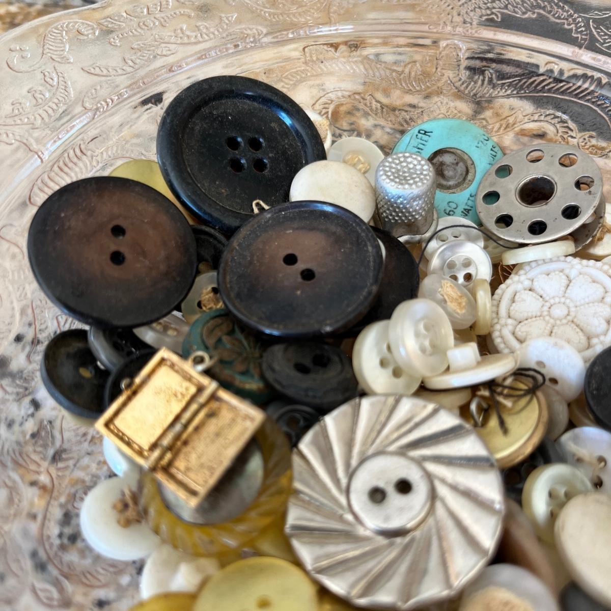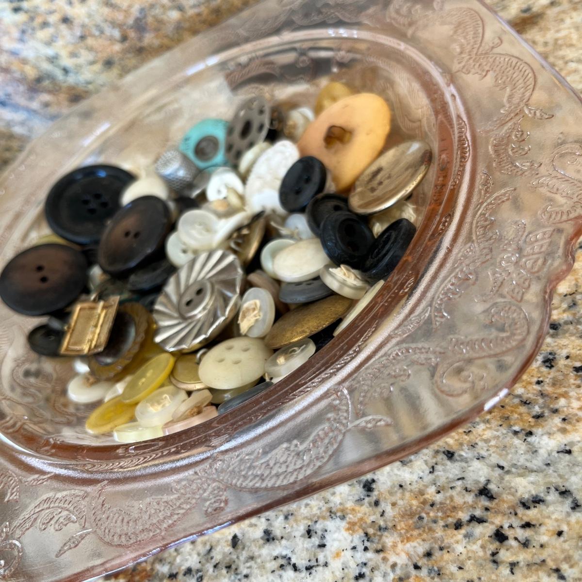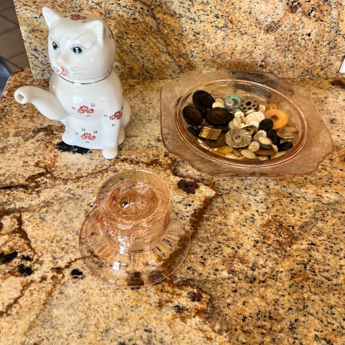 Lot 114 Rose colored glass bowl with buttons and cat teapot