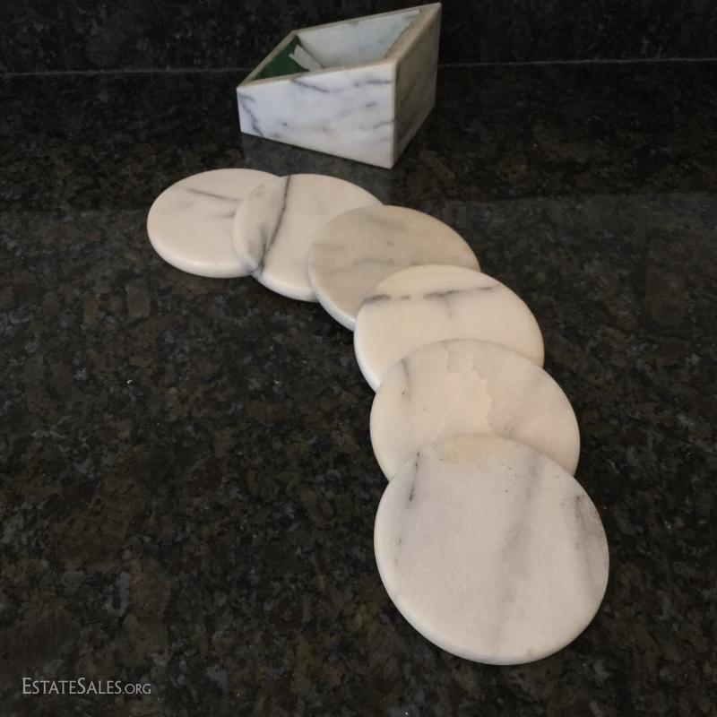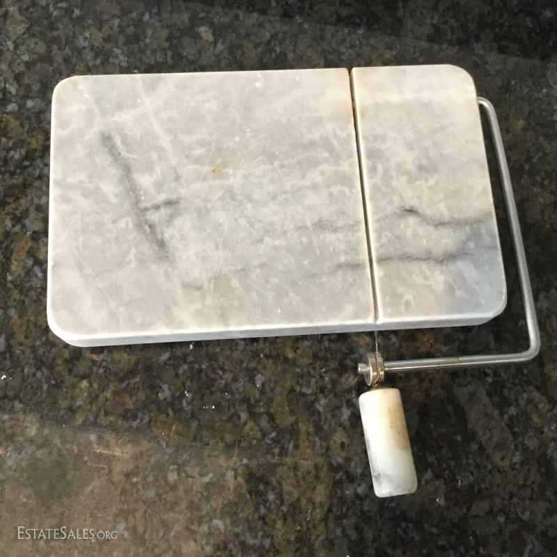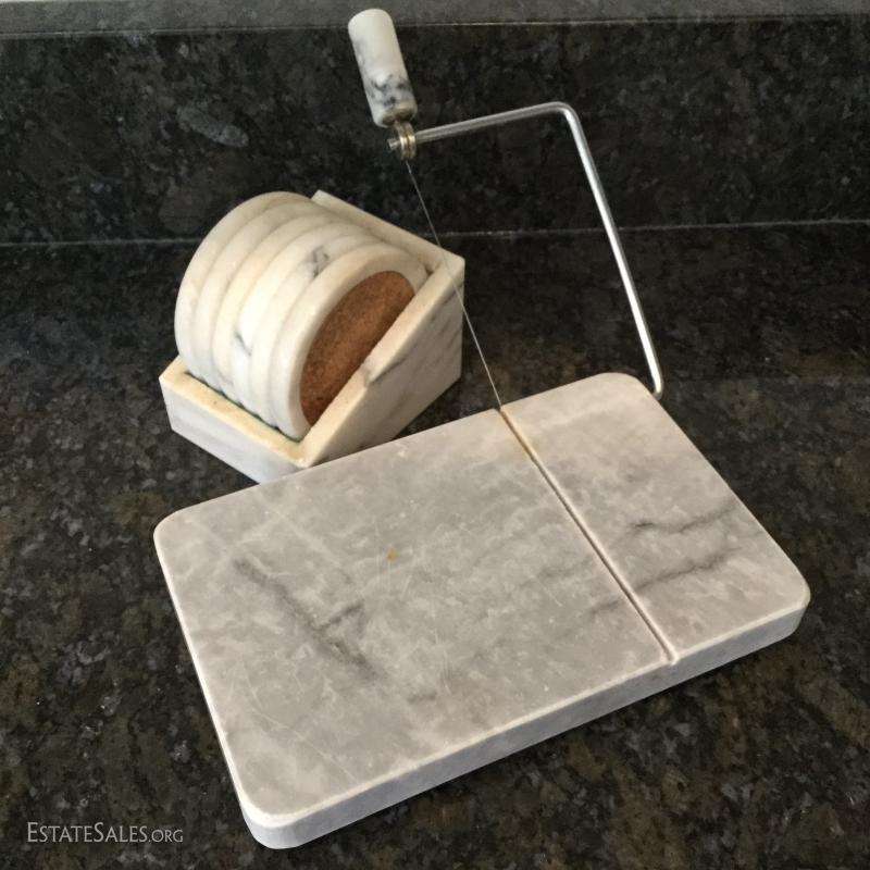 Grey marble cutting board with built-in cheese slicer and matching coaster set in box with 6 coasters. See photos. Shipping available or local pick up in Flat Rock, NC.