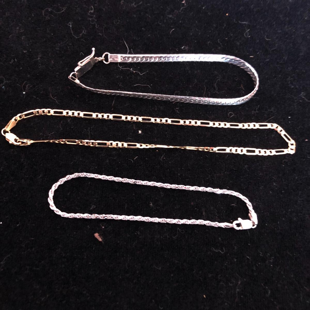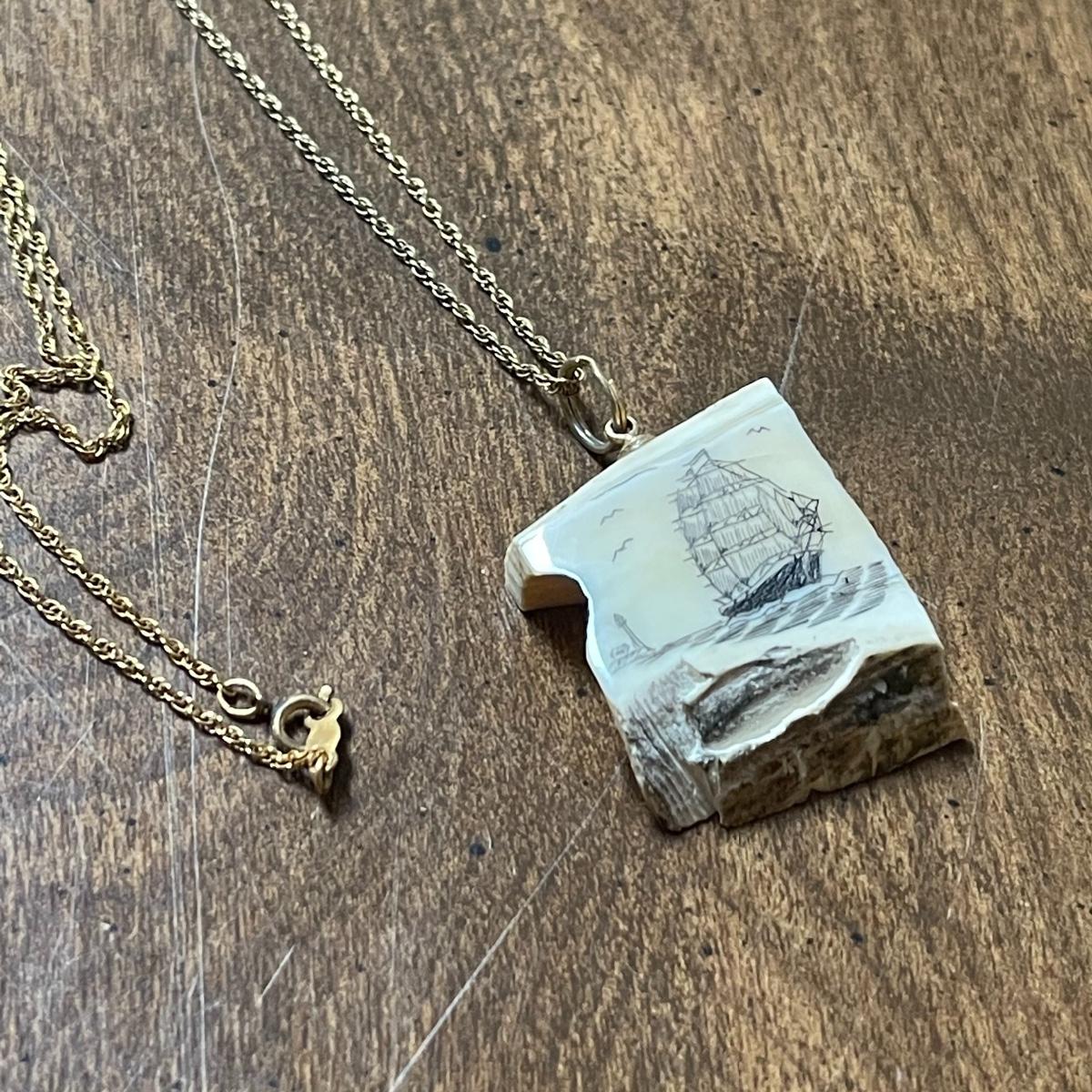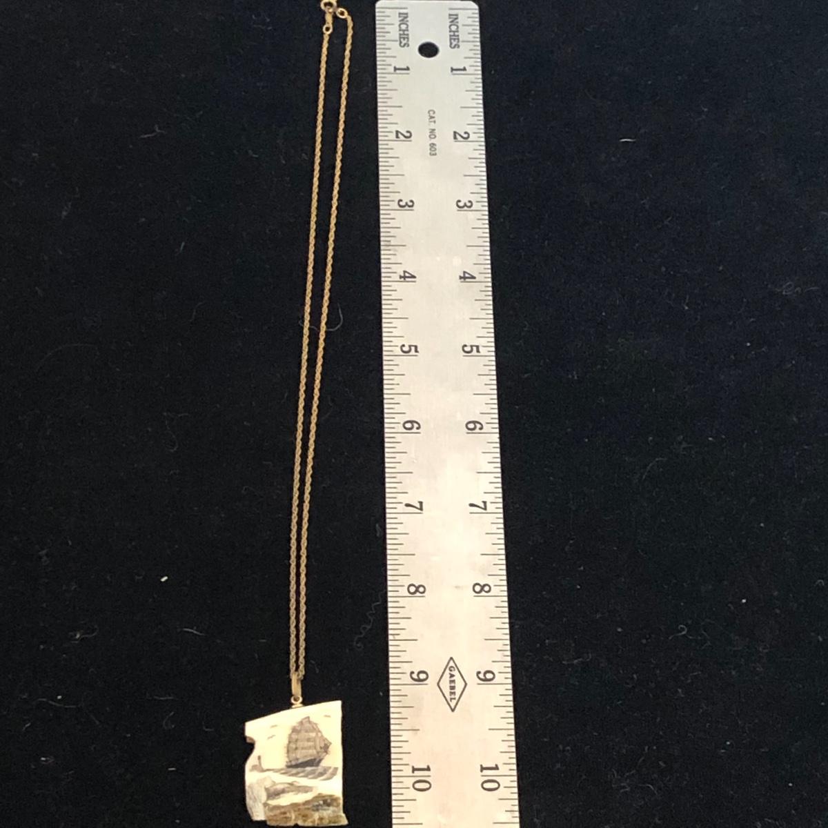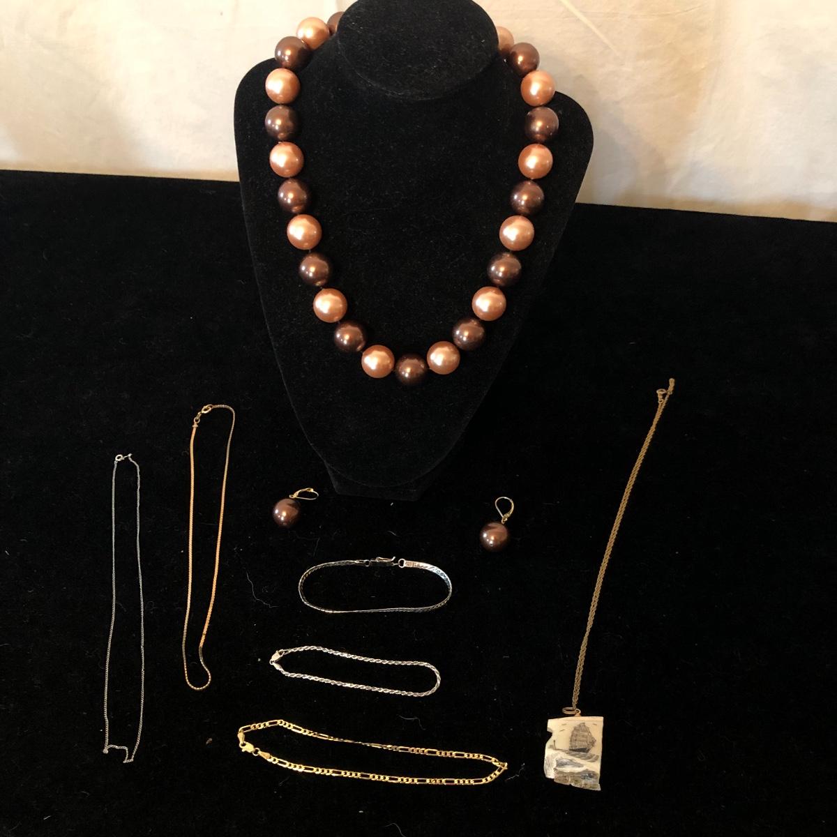 This lot includes 14K jewelry with the exception of the necklace which has a white pendant with a ship scene. There are two chain necklaces, two small bracelets and one anklet that are all 14k. The clasps on the pearl necklace and matching earrings are 14k also. Shipping Available.