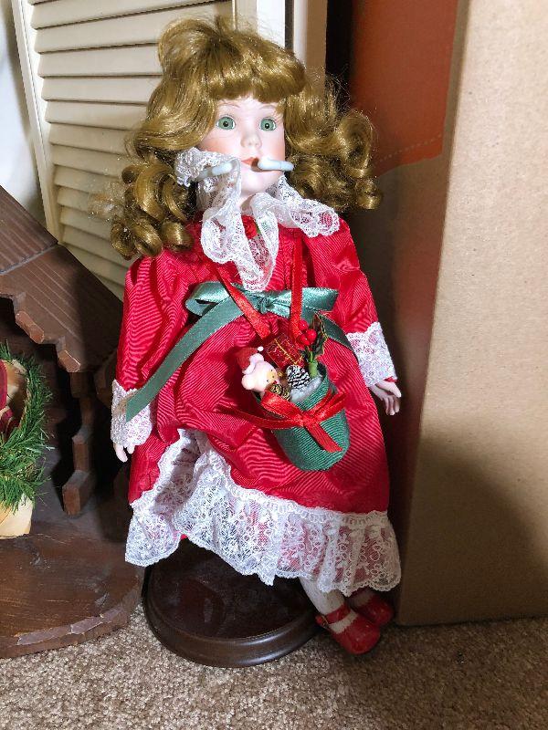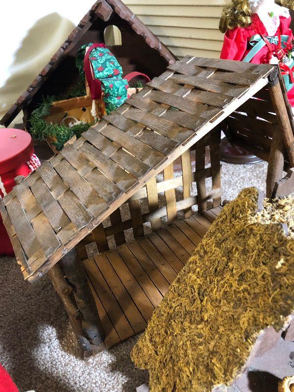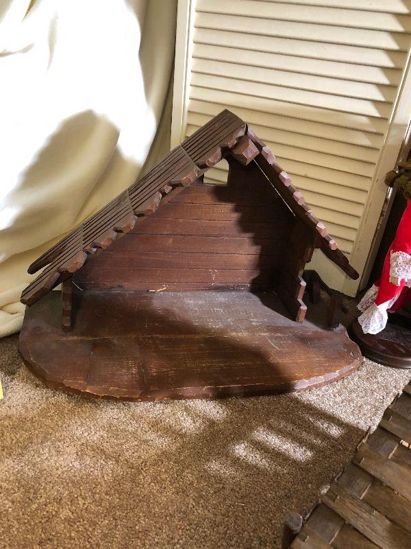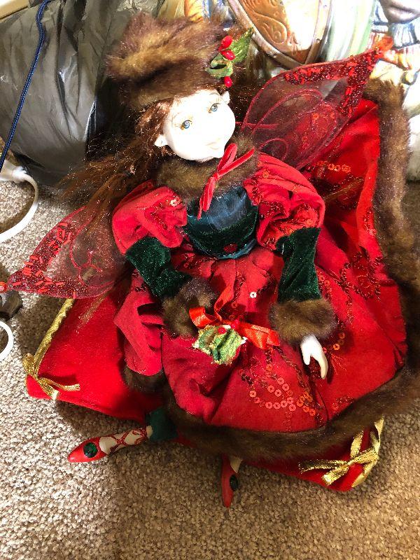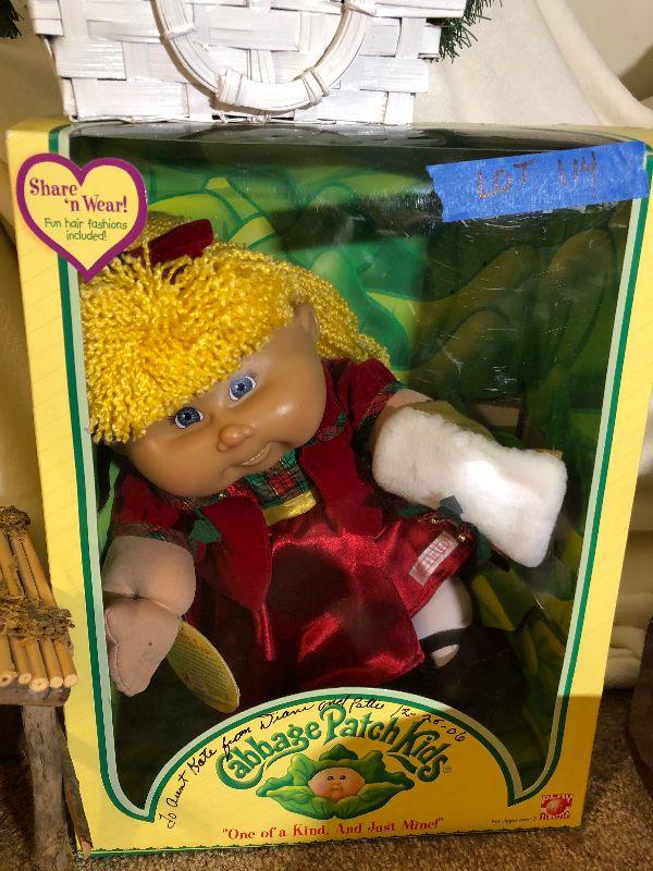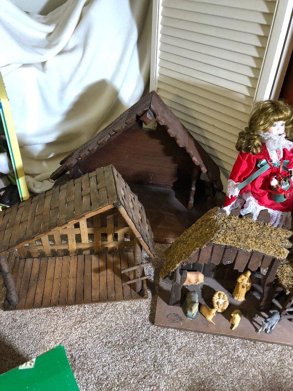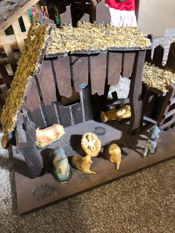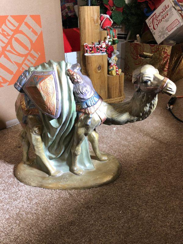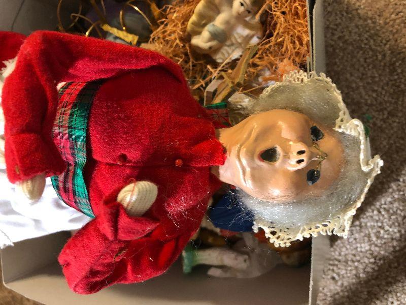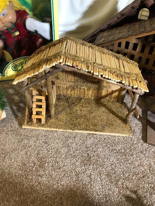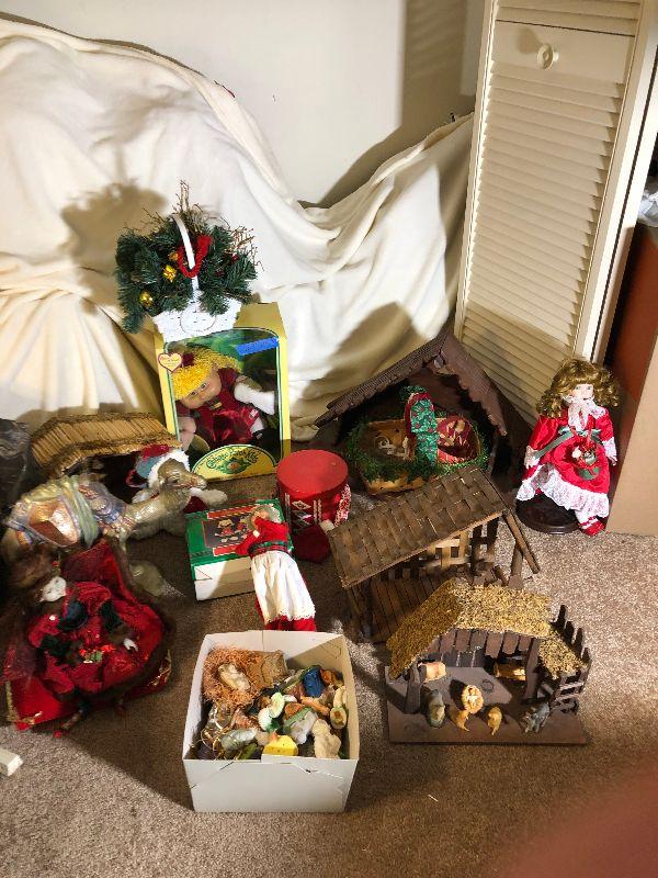 Cabbage Patch Doll in original box, Christmas mangers, dolls including a Christmas Fairy, large camel figurine and other miscellaneous items.