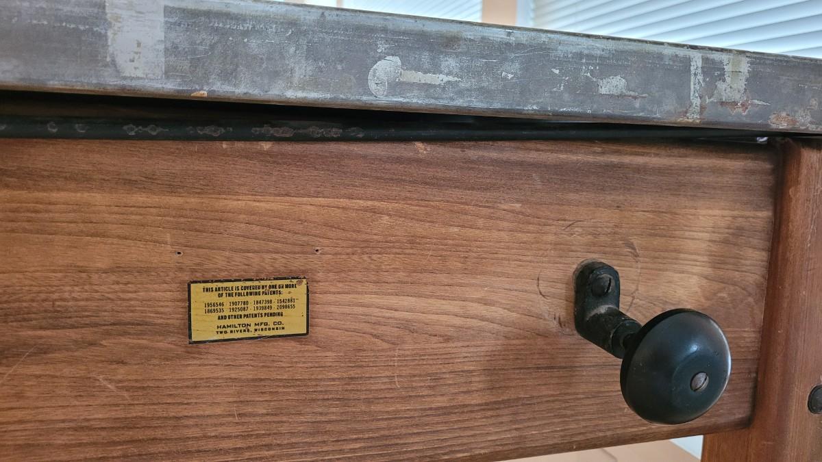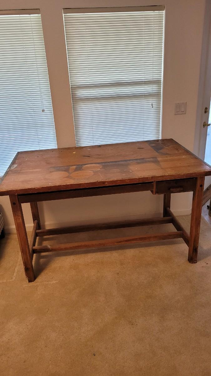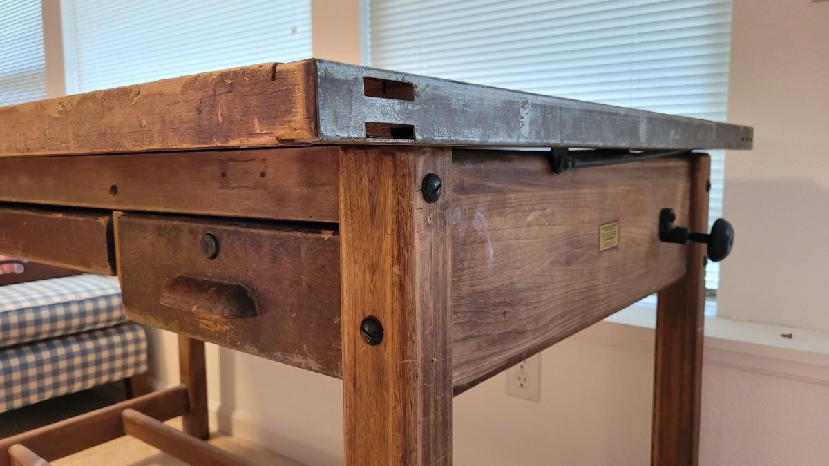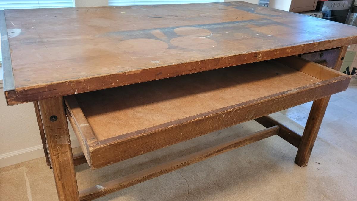 Lot 114: Vintage 2-Drawer Drafting Table / Kitchen Island (top comes off for transport or storage)