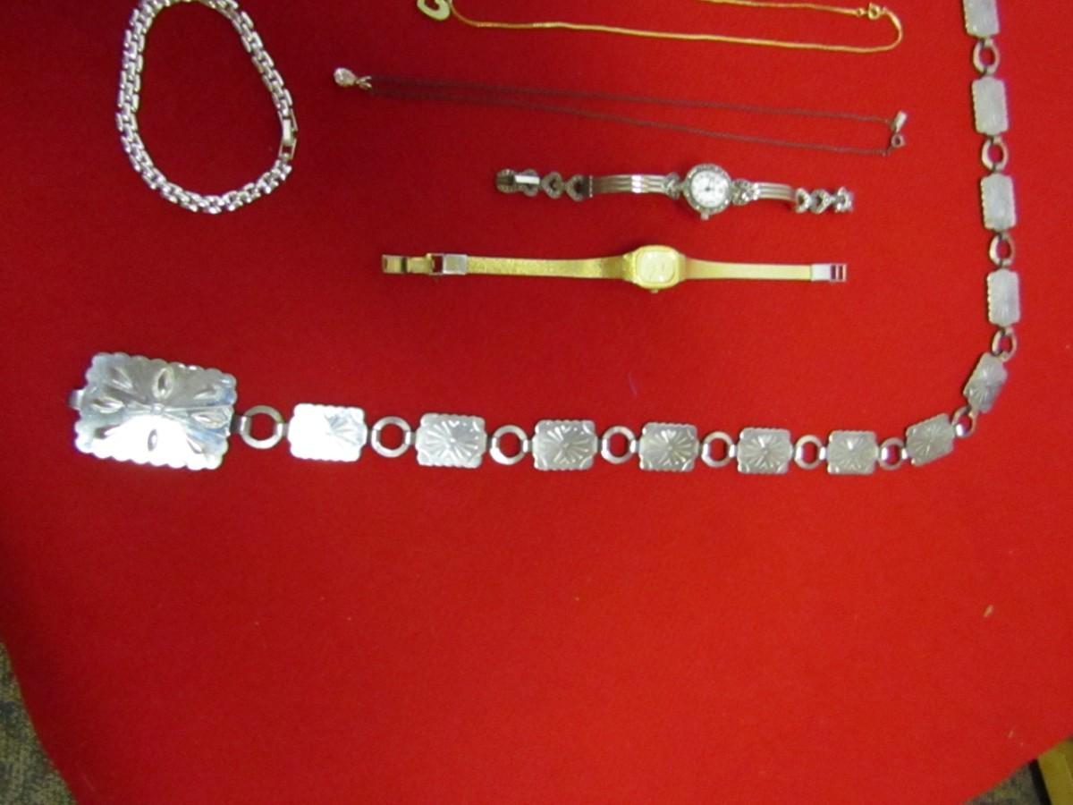 SILVER AND GOLD TONED BRACELETS, NECKLACES, PIERCED EARRINGS, BROOCH, 2 WATCHES THAT NEED NEW BATTERIES AND A CONCHO BELT