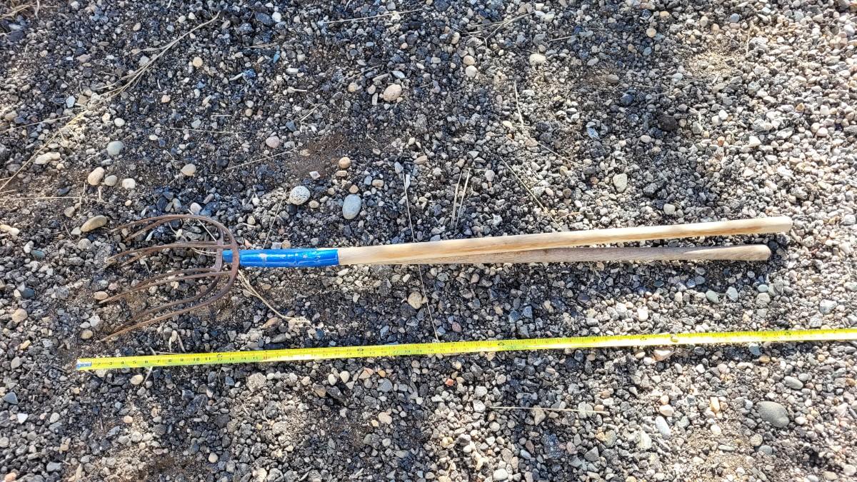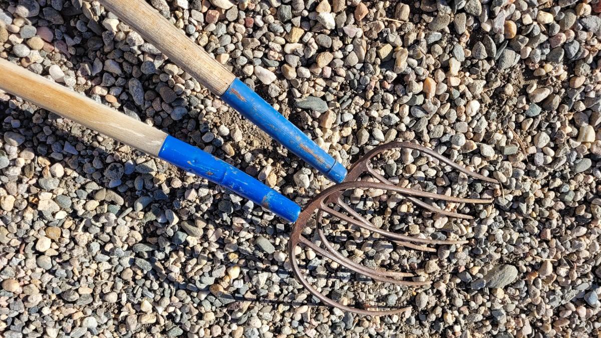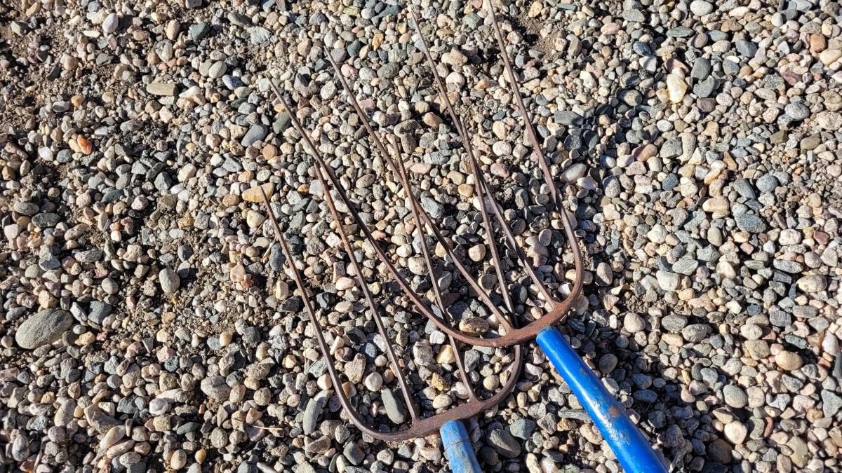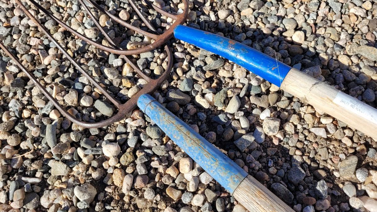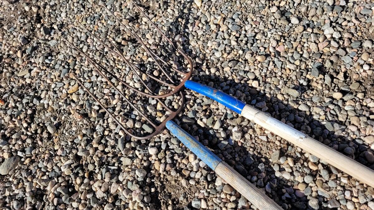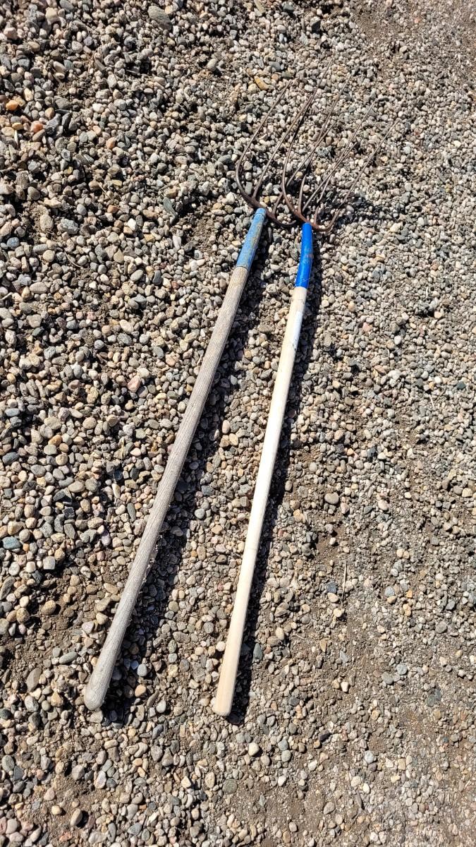 Lot 114: (2) Vintage Blue Accent Pitchforks Farm Garden