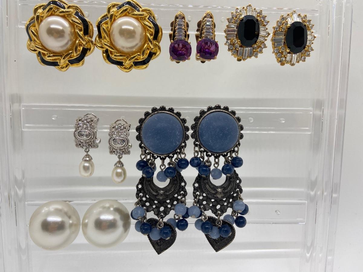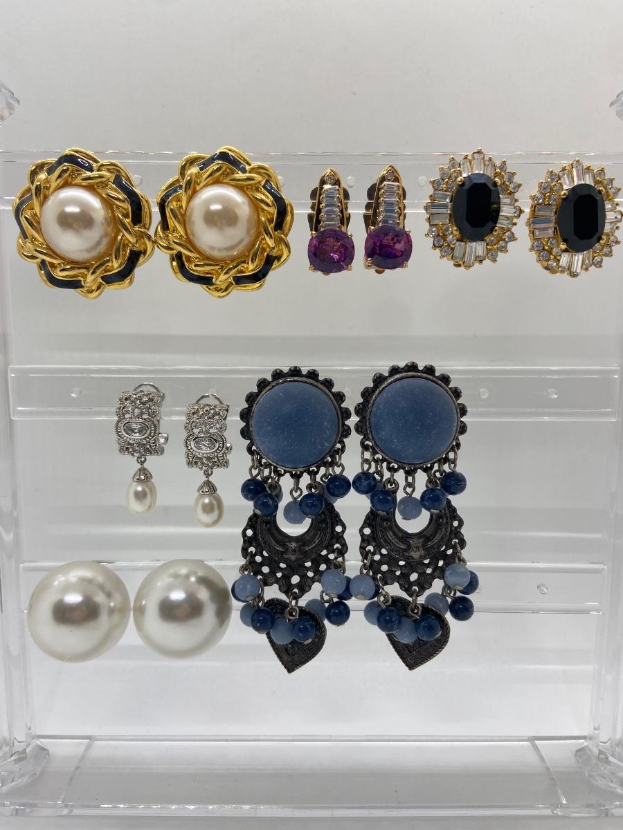 5 pair of vintage clip on earrings along with 1 pair of pierced pearl & rhinestone earrings.