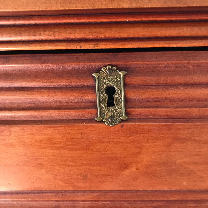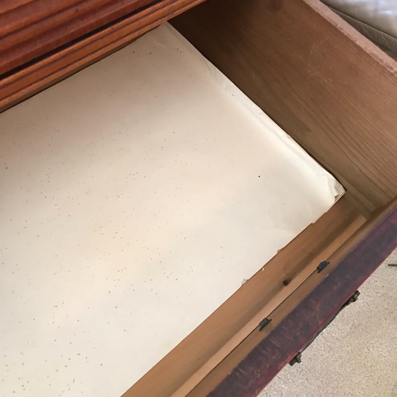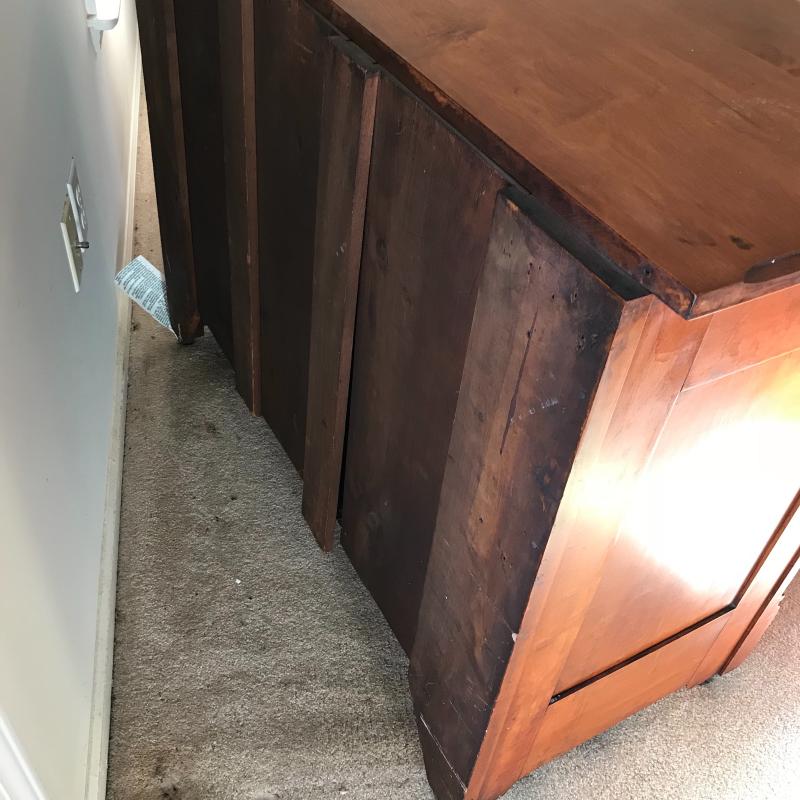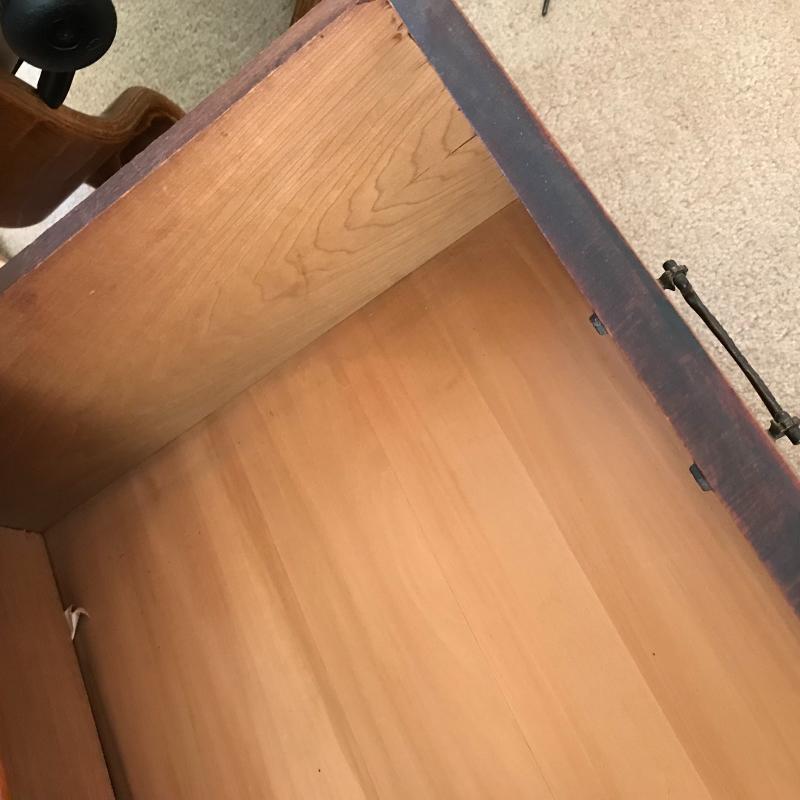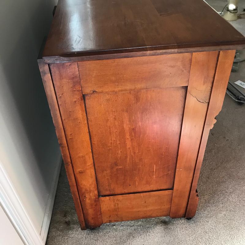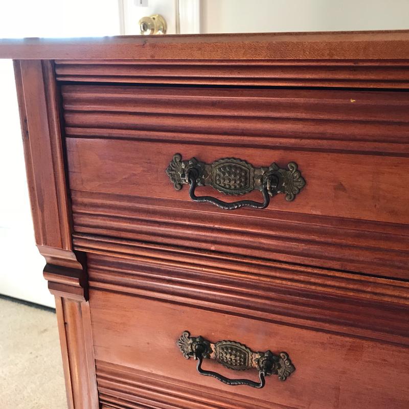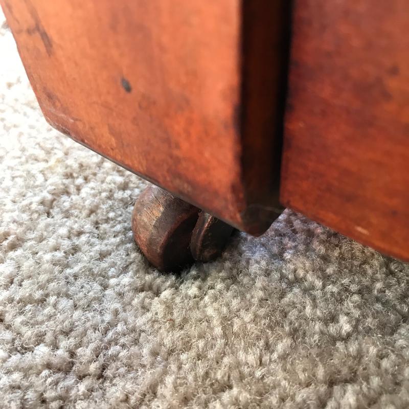 This heavy, sturdy antique dresser is in great shape and sits on casters for easier moving. 43”l x 19.5”w x 33”h.