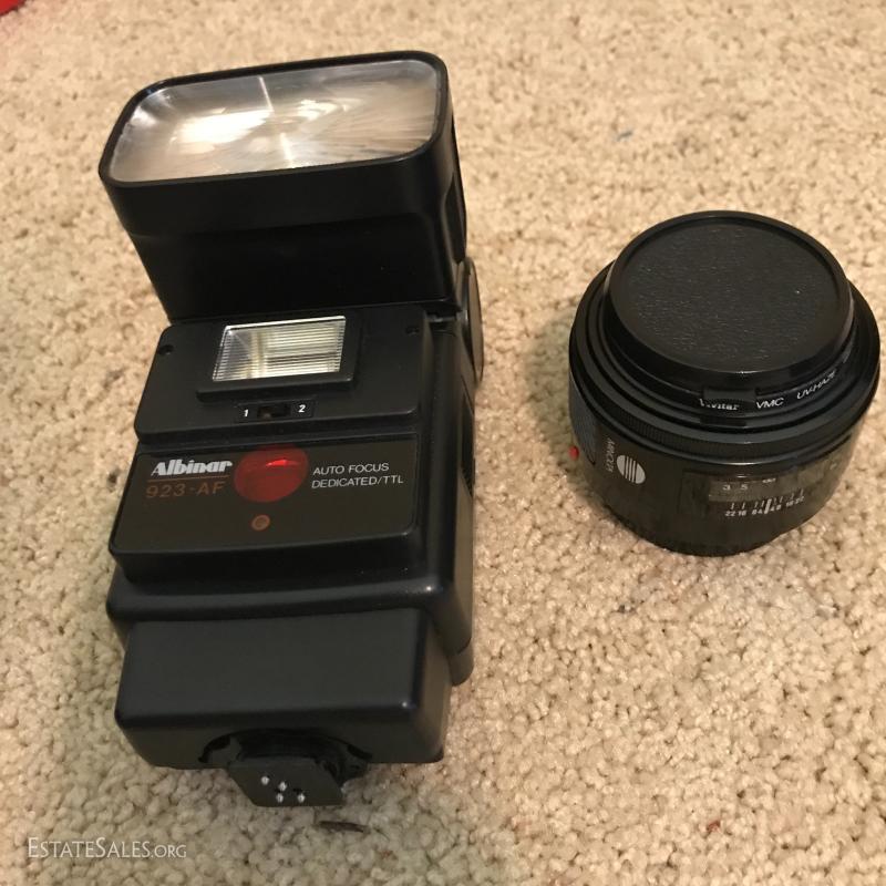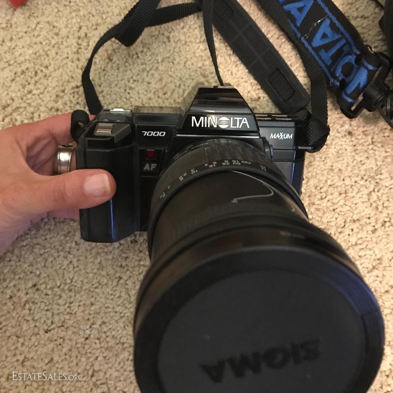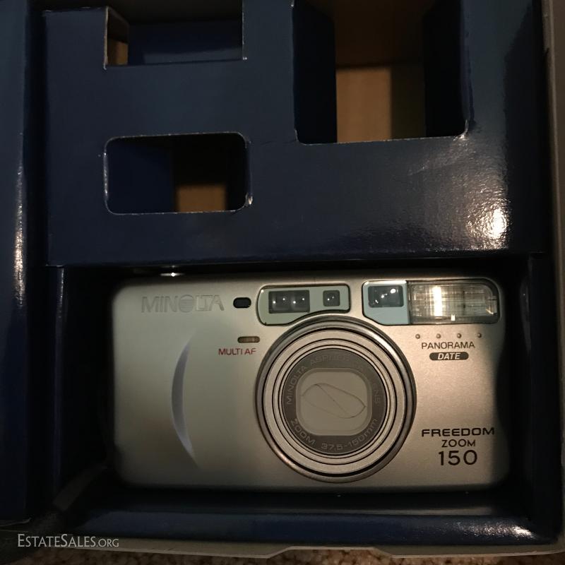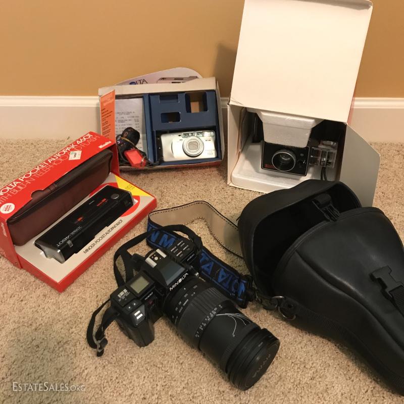 Lot of misc cameras: Polaroid camera, Minolta Freedom Zoom 150, Minolta Pocket Autopak 460T, Albinar Autofocus Flash, Minolta 7000 Maxxum with case and more. Items in this lot are available for local pick up in Hendersonville, NC.