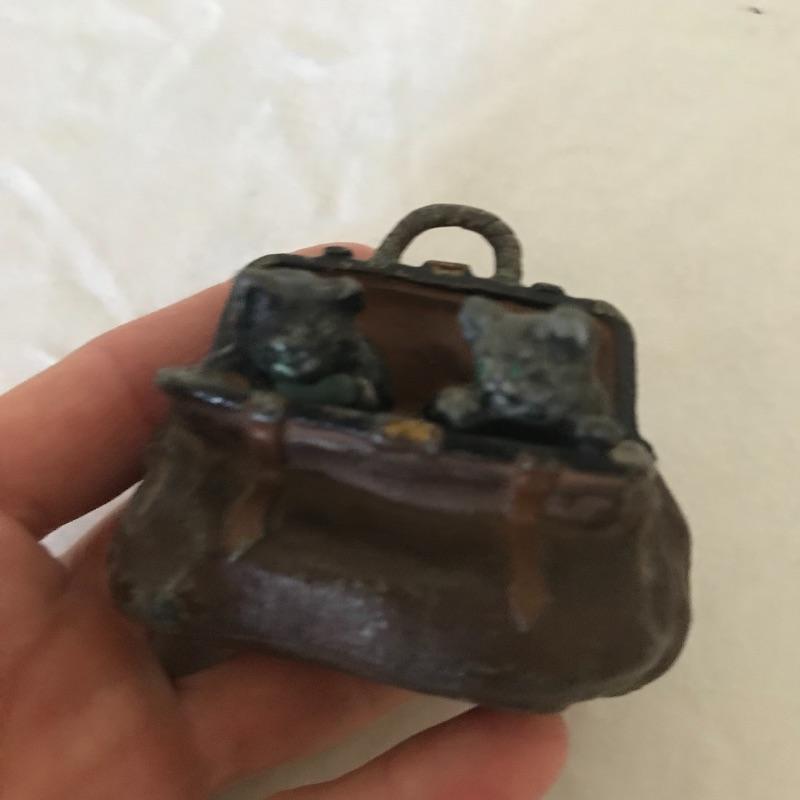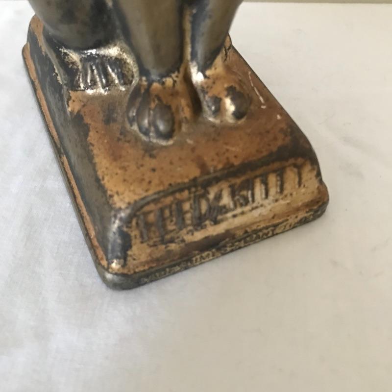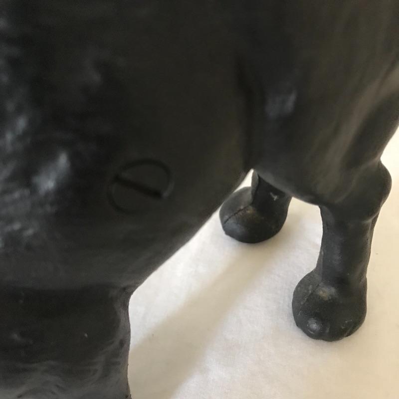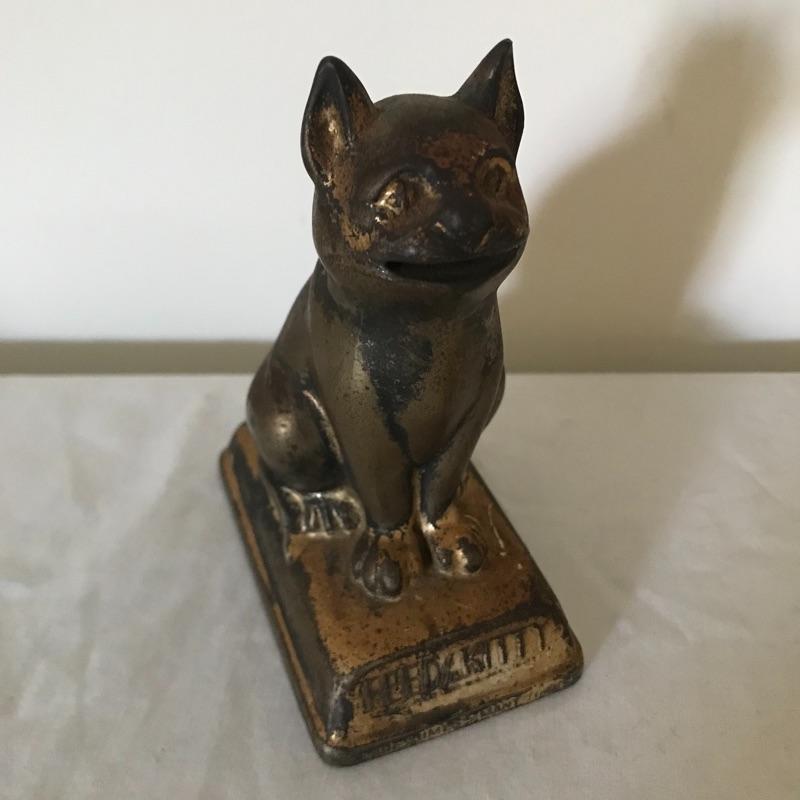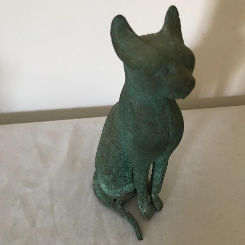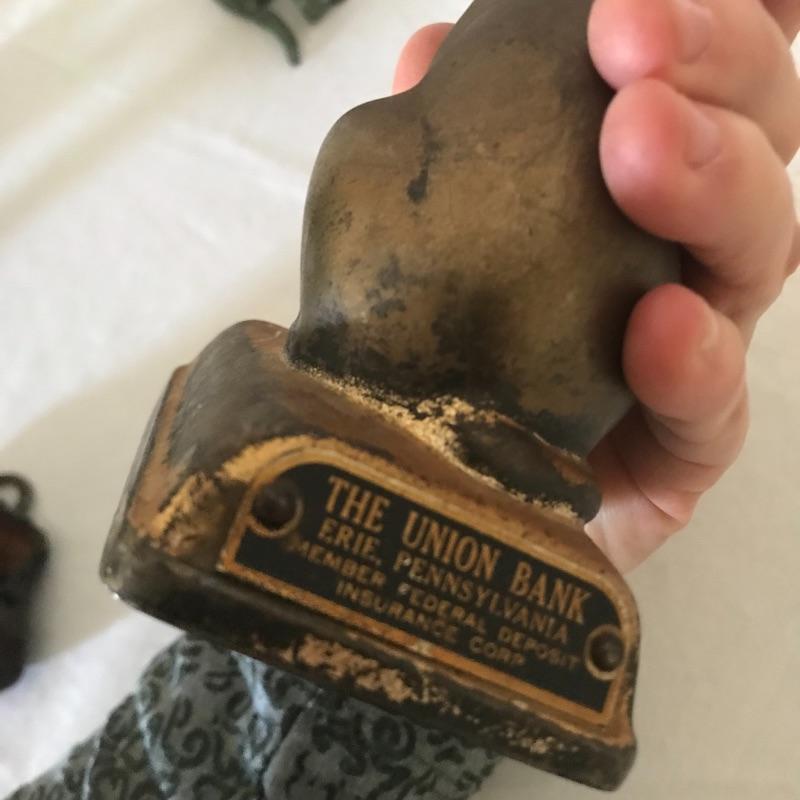 Lot includes four eclectic cat sculptures that all appear to be made of cast iron. Tallest black cat is 11” tall. Gold cat is a bank from The Union Bank in Erie, PA. (No key included.) See pics. Shipping available.