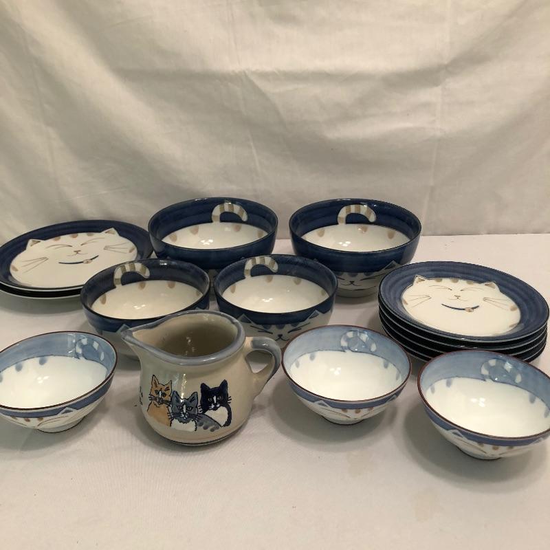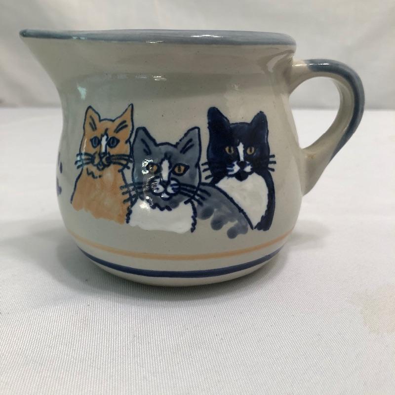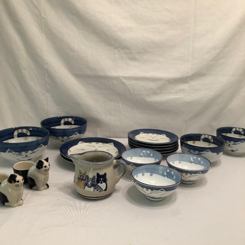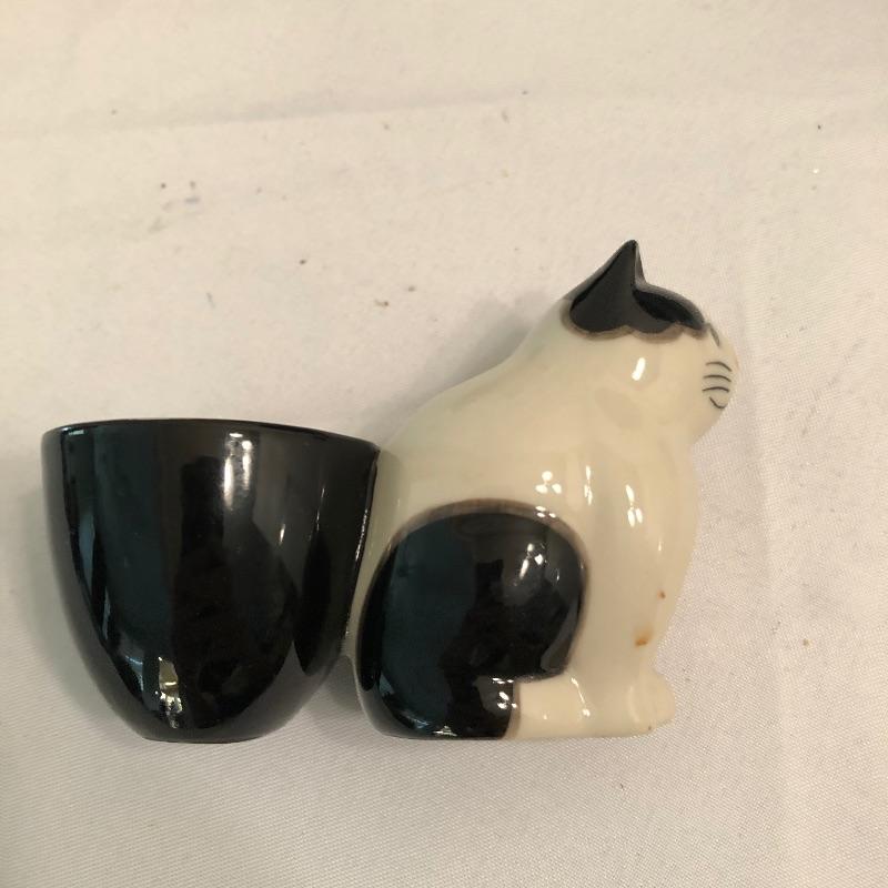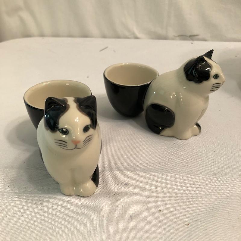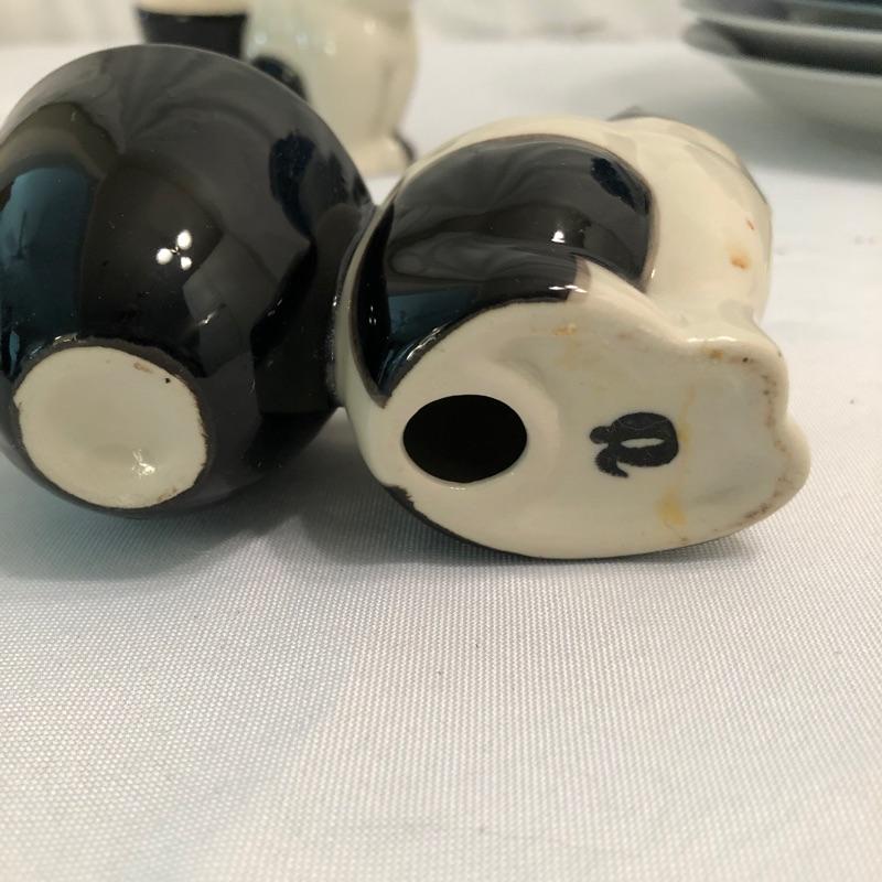 This adorable lot isn’t just for cat lovers, they are so cute! One set includes two salad and five smaller plates and two large and two smaller bowls. A third set of three matching bowls (they look very much alike to the others but they do have different makers marks). Also included is a small pitcher marked USA made and two black and white porcelain cats with black egg cups.