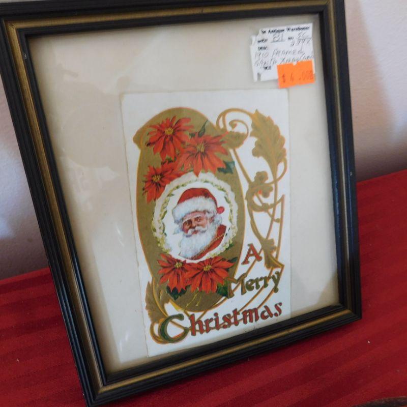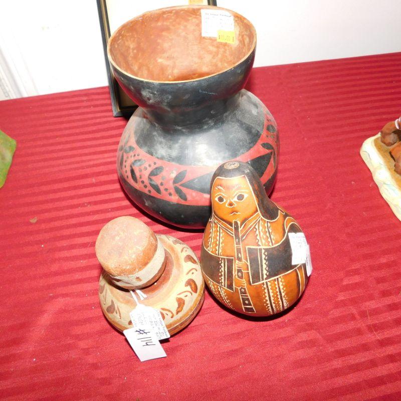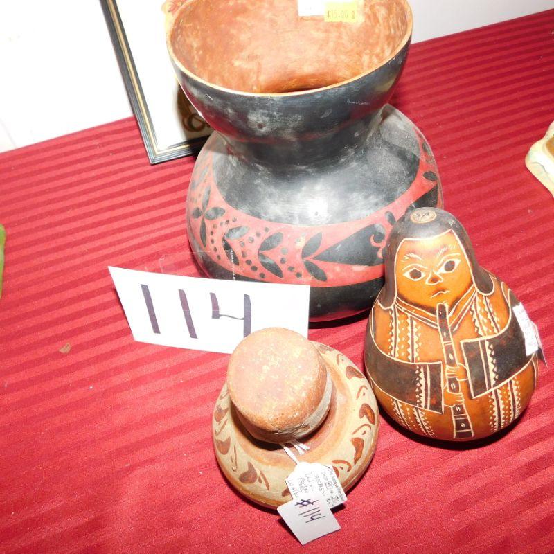 Lot 114 collection of home decor items including painted gourds and clay pottery and Santa vintage Christmas card