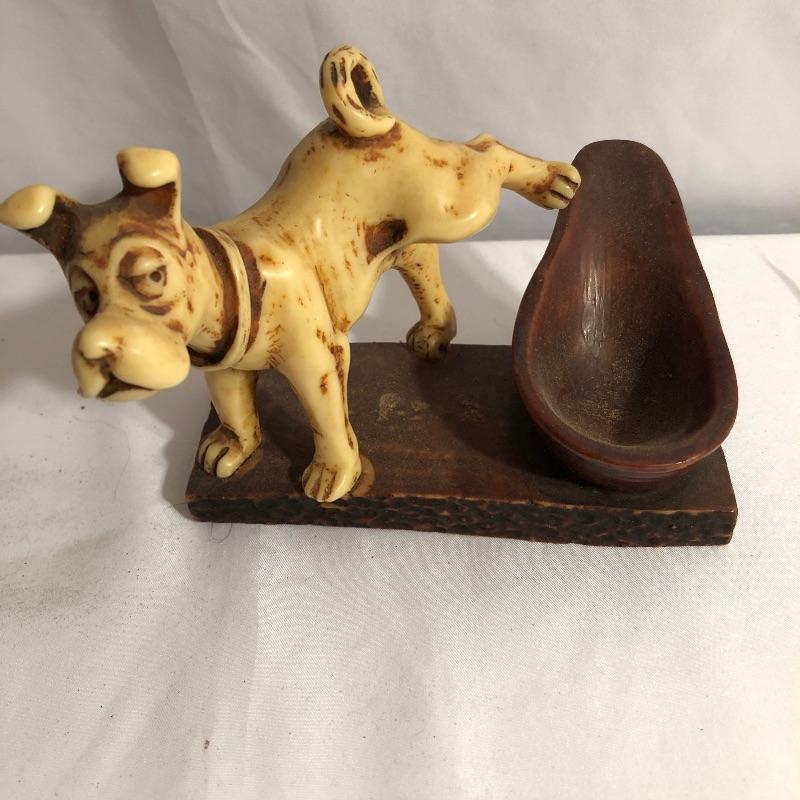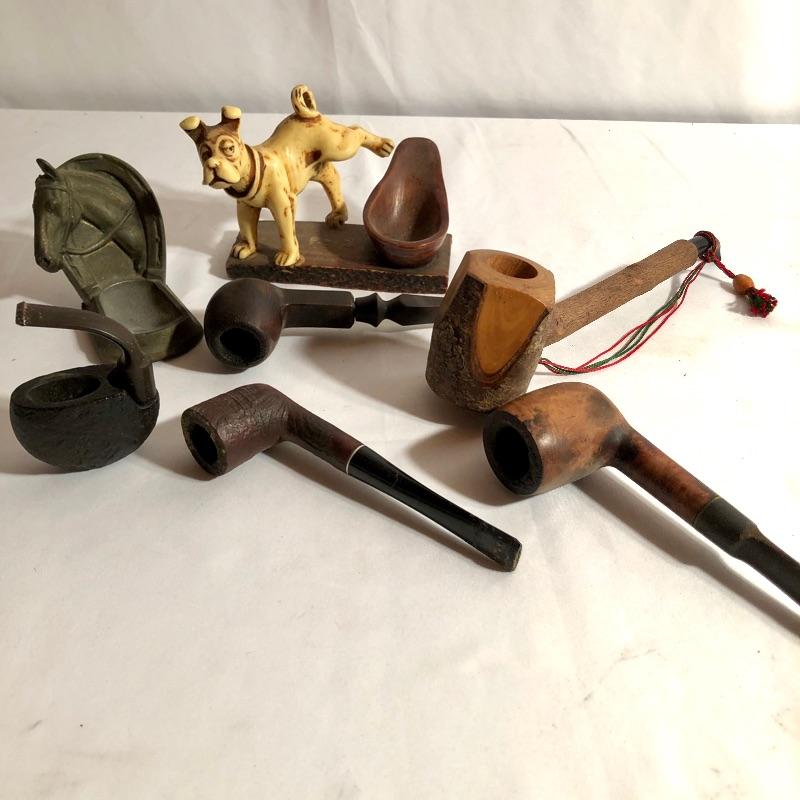A total of five pipes here that includes a Savinelli and other pipes made in Italy and in France. See images for makers marks. Also included are two unique pipe stands. The larger one with the dog is made by Comoy’s of Italy, the other appears to be metal, please note the horse is missing one ear.
