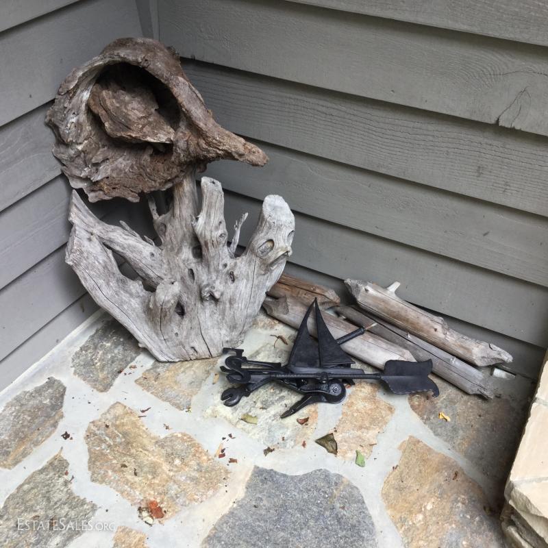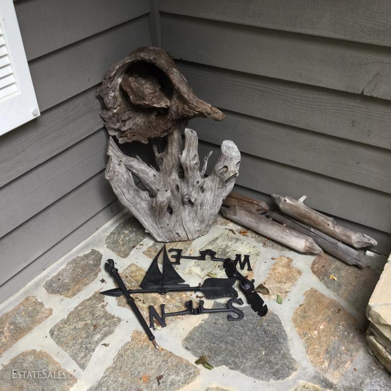 Lot 114 - Flower Pots, Birdfeeder, Driftwood and Weathervane