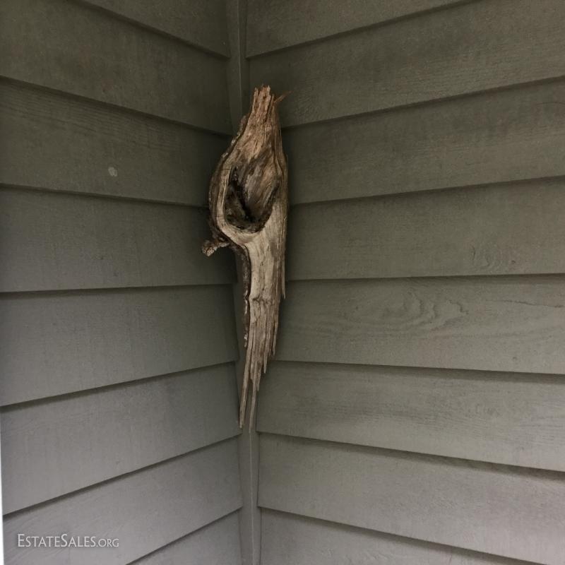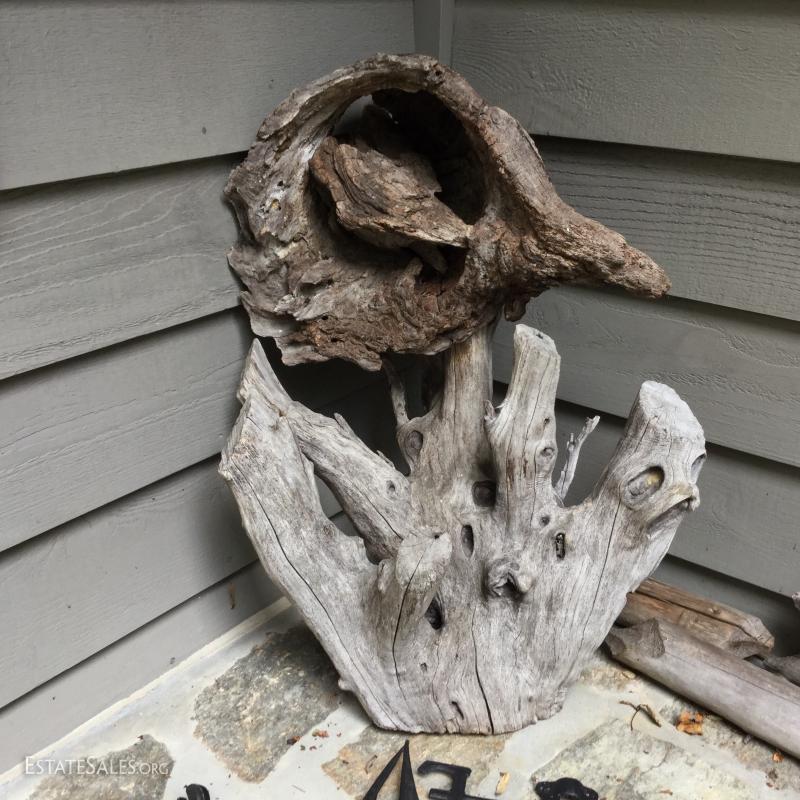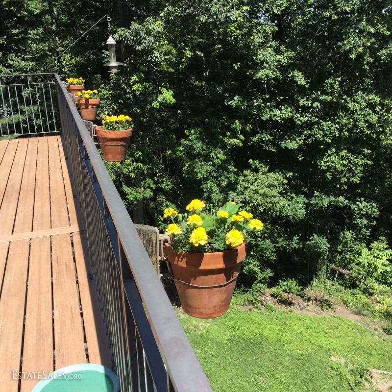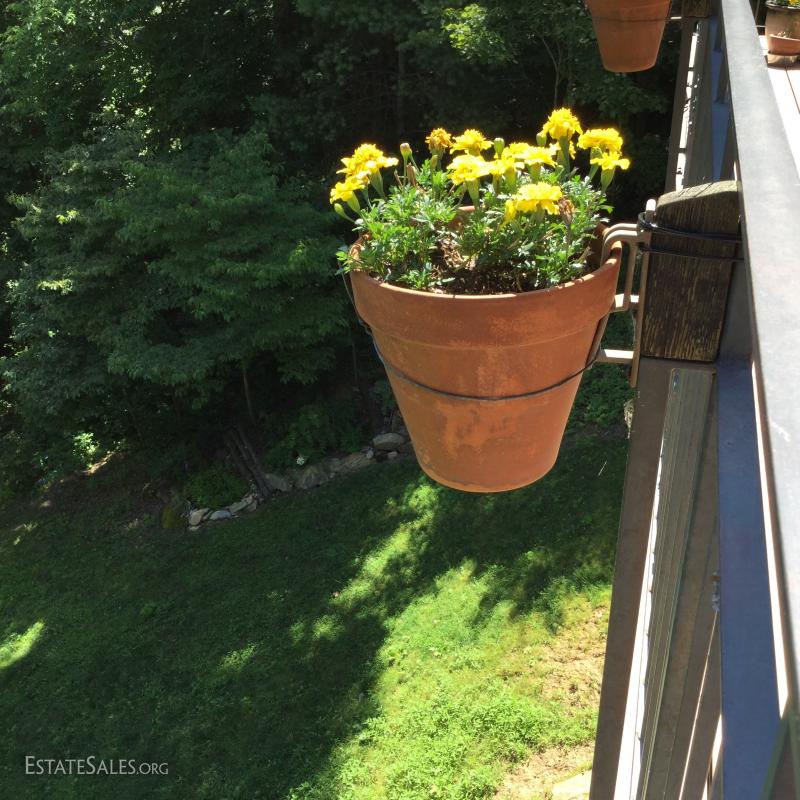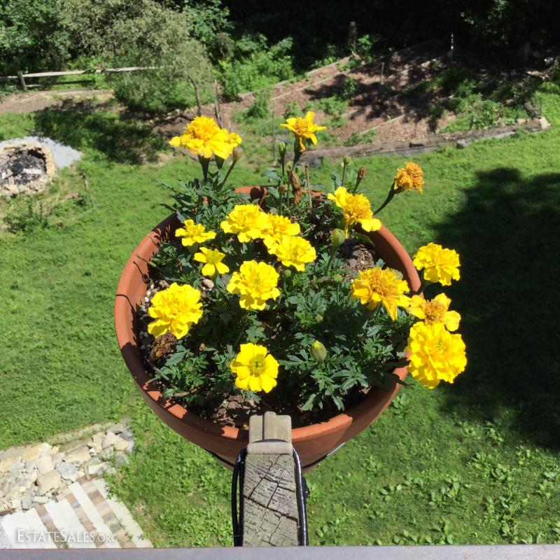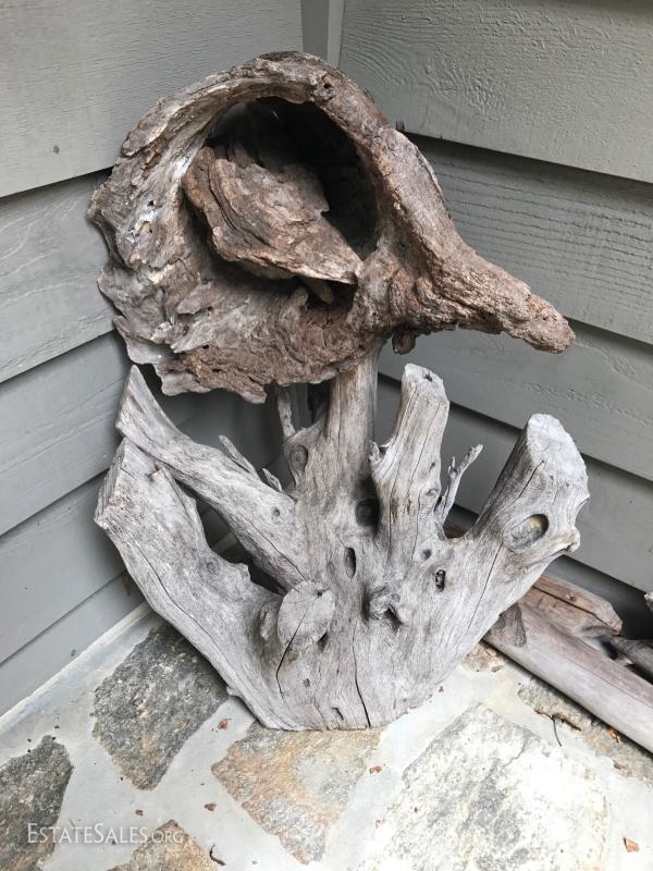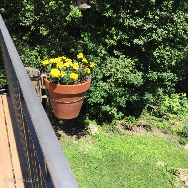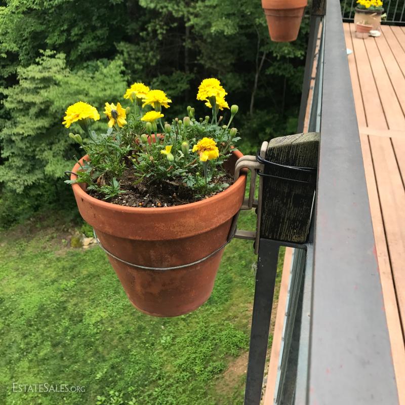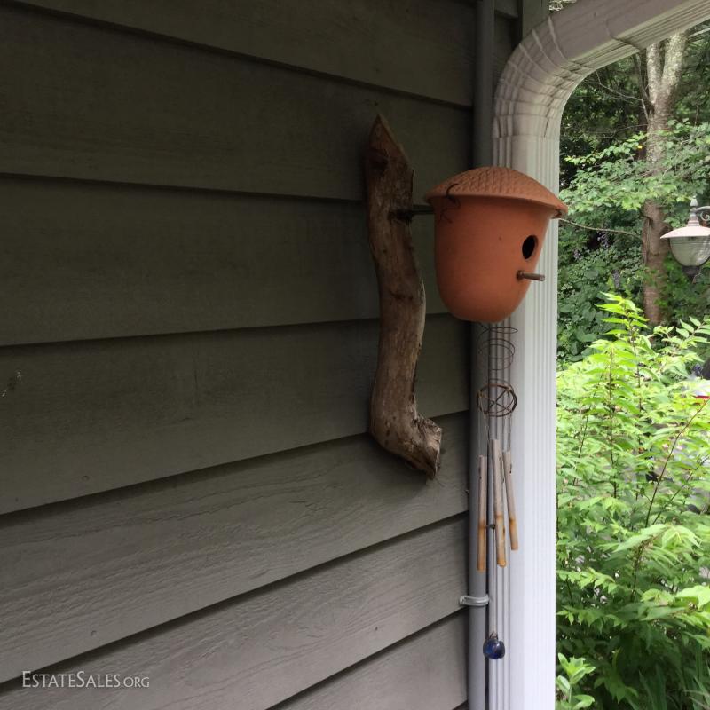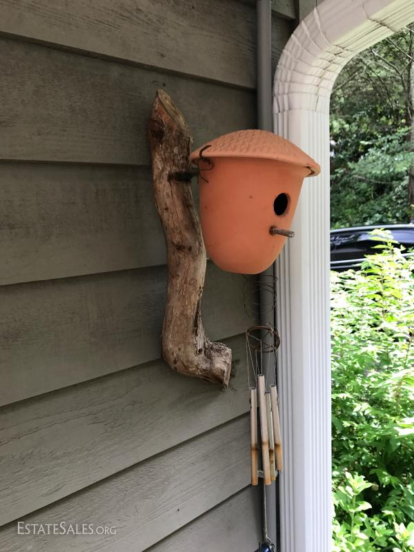 Terra cotta bird feeder, 7.5"h with wind chime. Wood does not come with feeder. Feeder has bracket on back. Four pots with yellow flowers. 8"d x 8"h Pots do NOT come with hangers. Several pieces of weathered wood for garden and an iron weathervane.