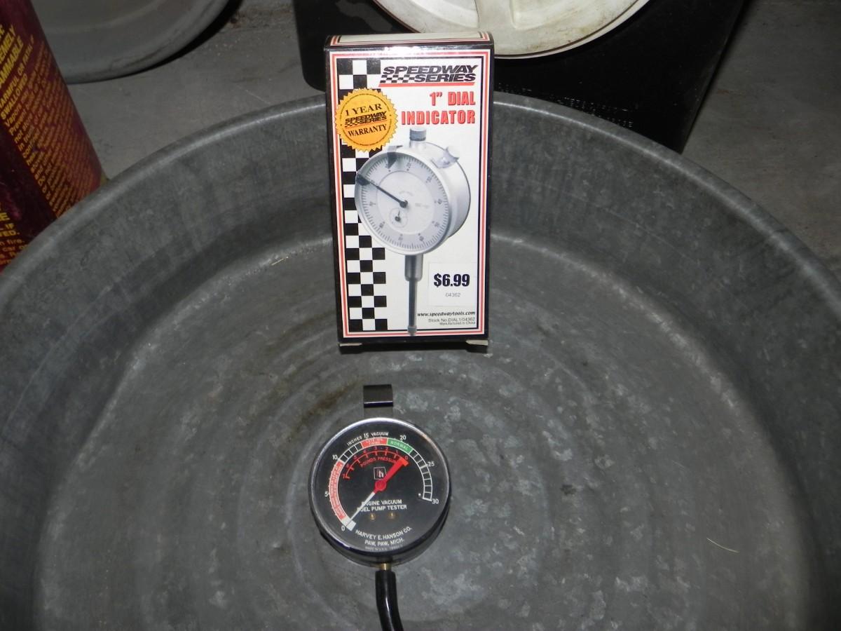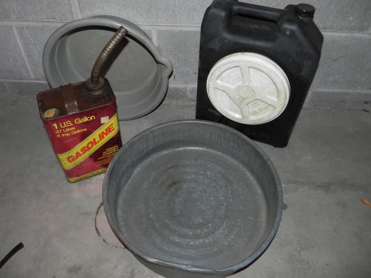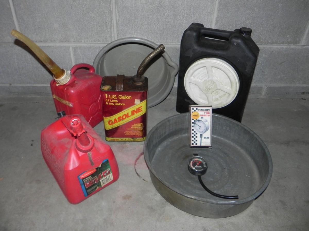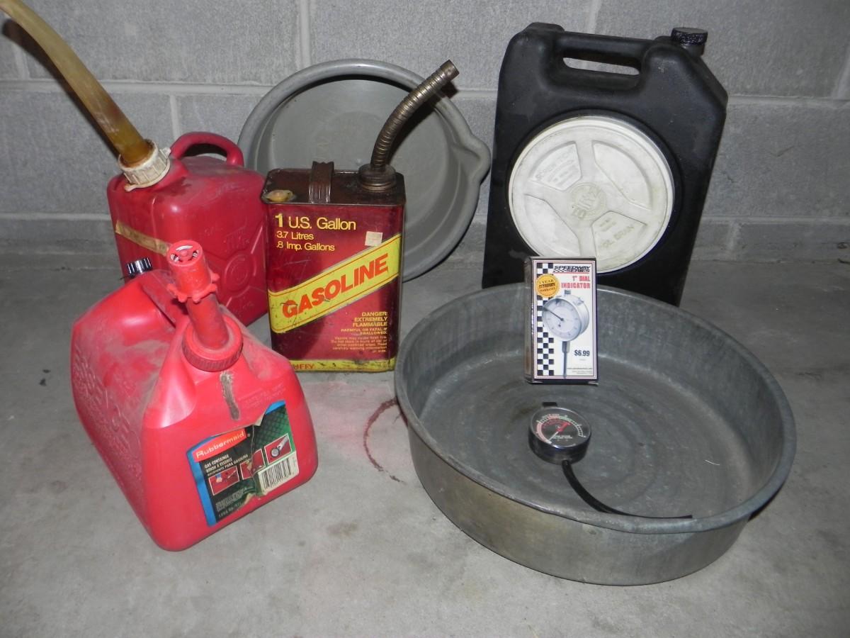 3 GAS CANS, 3 OIL PANS AND 1 GAUGE