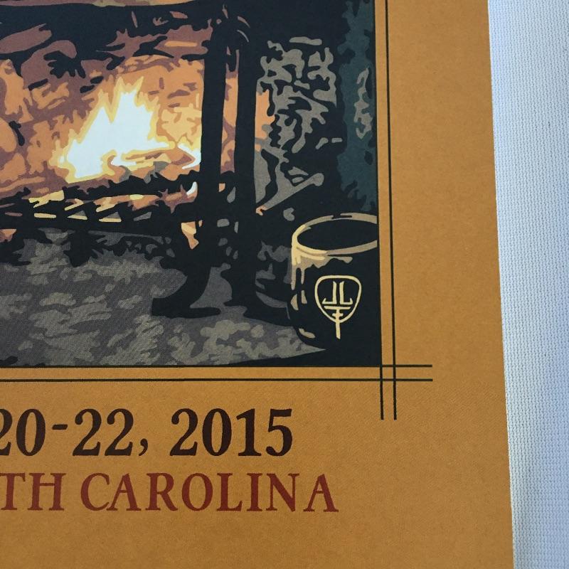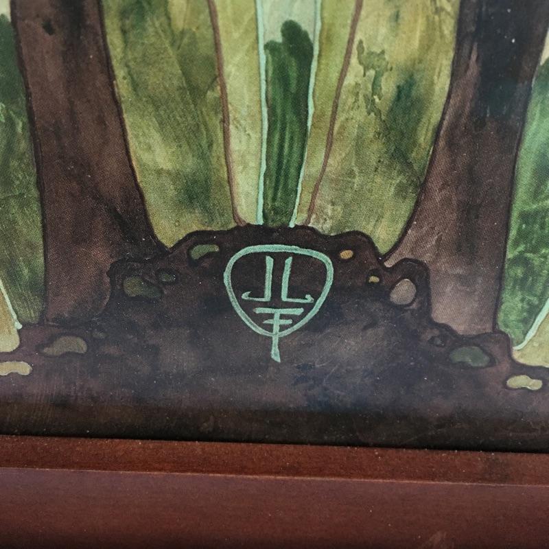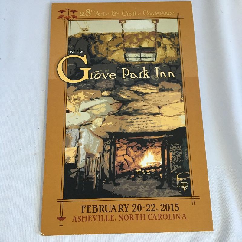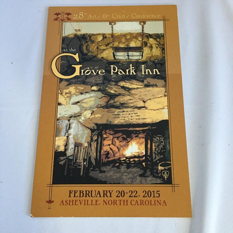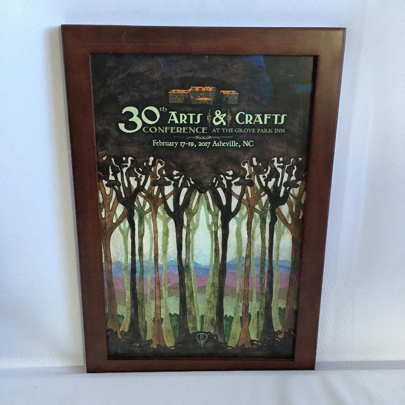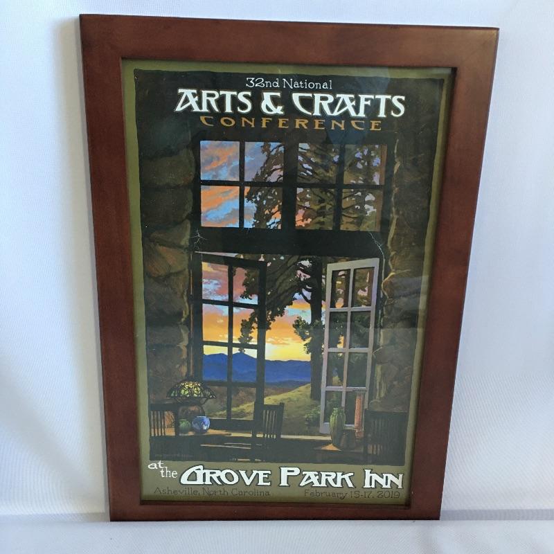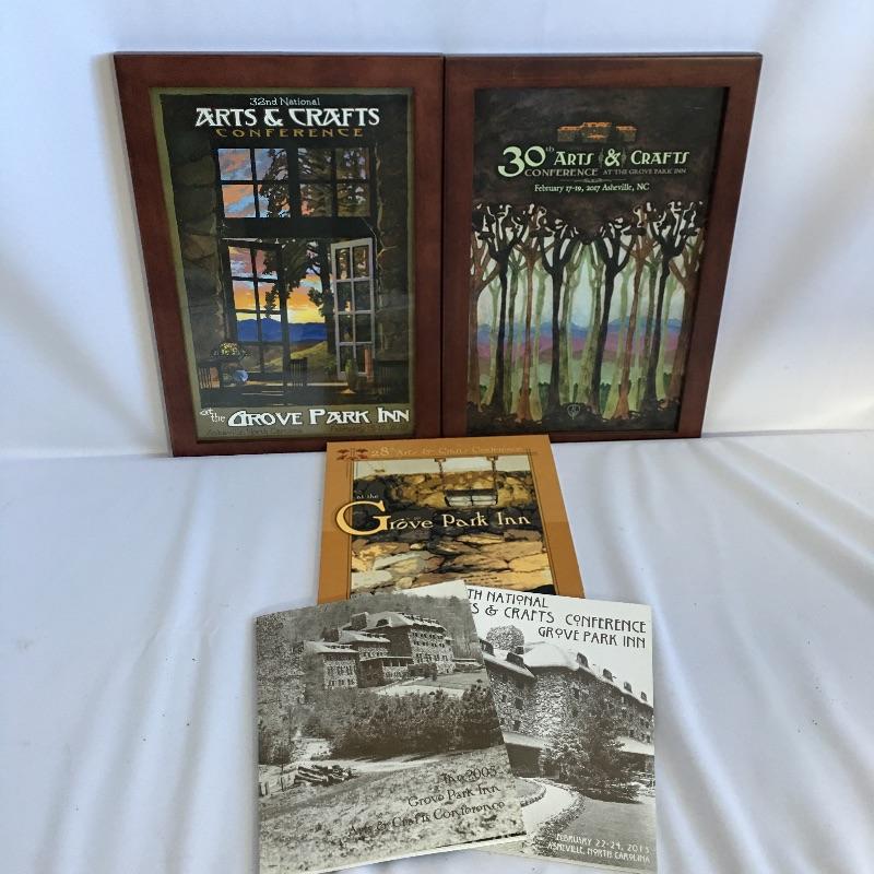 Two prints by Julie Leidel, one is framed and one is on foam board 2017 and 2015 respectively. The other framed poster is a print by Schmuckel from 2019. Three conference magazines from 2005 and 2013 (2 of this one) from the Grove Park Inn Arts & Crafts conference. Both framed prints measure