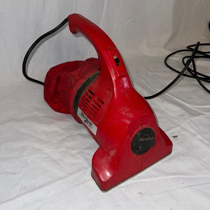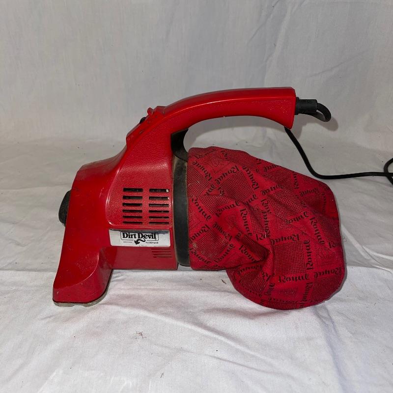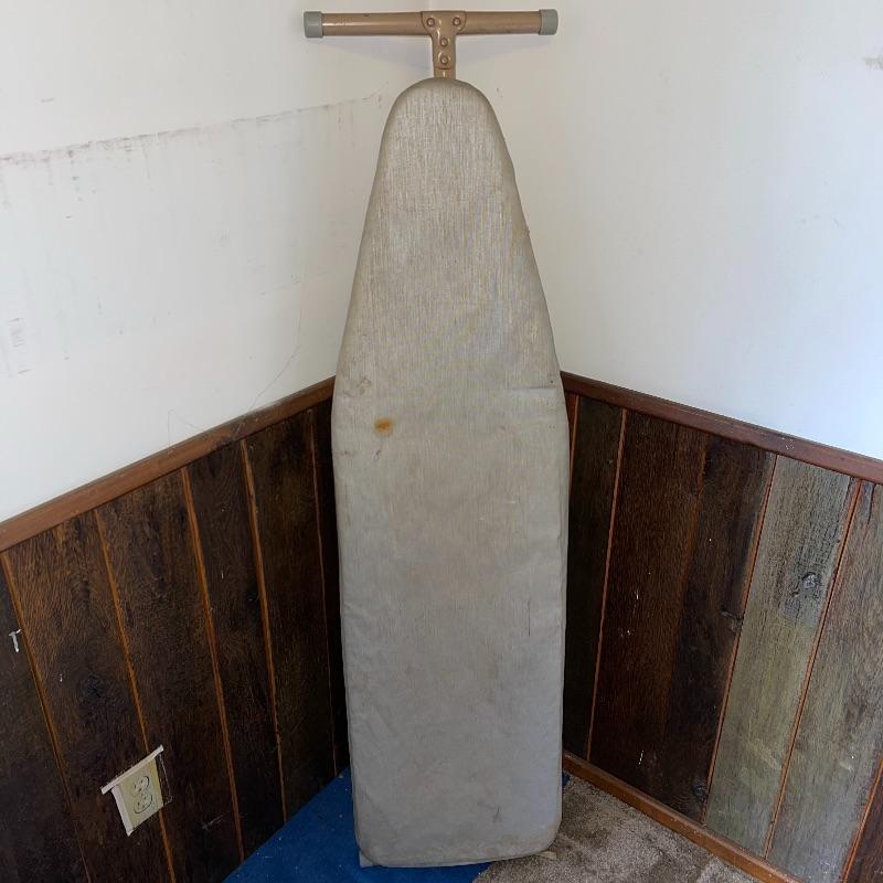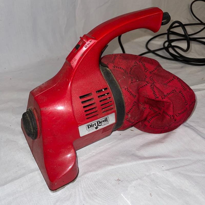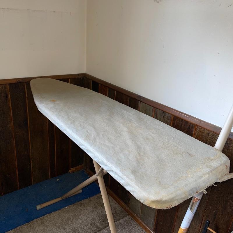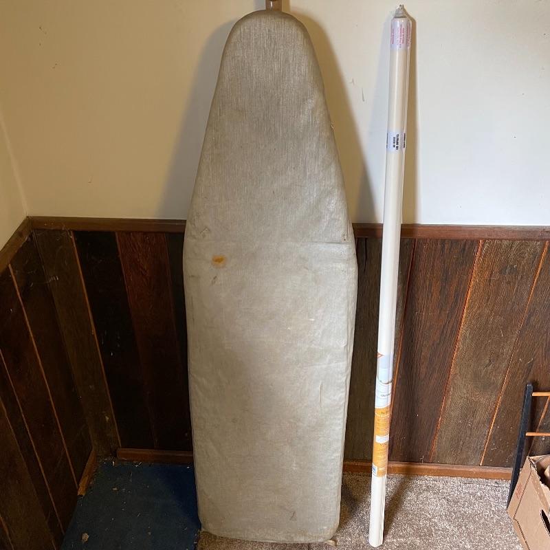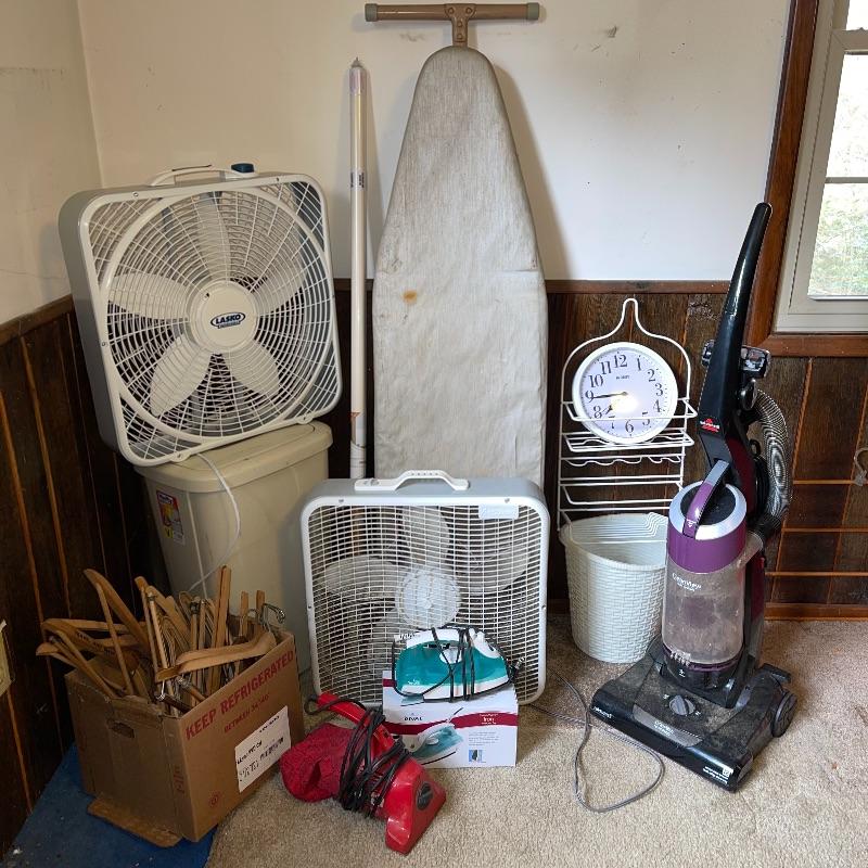 Household essentials which includes, an ironing board, two box fans, wooden hangers, shower rack, a battery wall clock, a bissel vacuum, a dirt devil handheld vacuum, an iron, a pulldown blind sill in wrapping, a lidded plastic trash can, and a small plastic waste basket. Both vacuums, both fans, and the iron turn on when plugged in. Good for some spring cleaning!