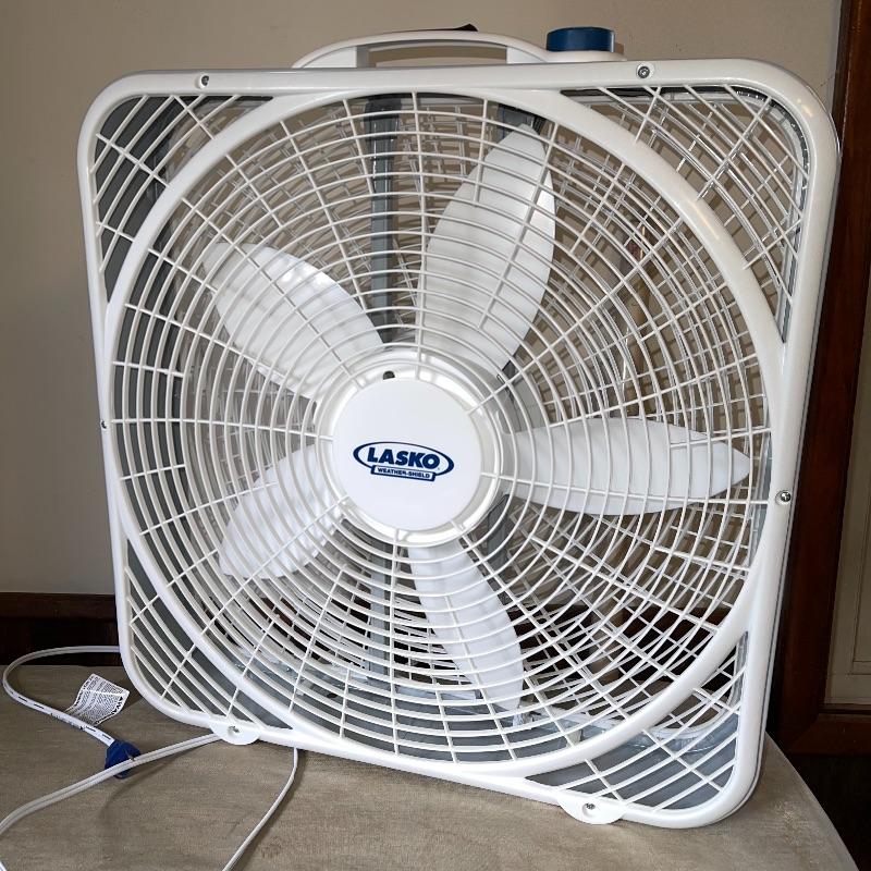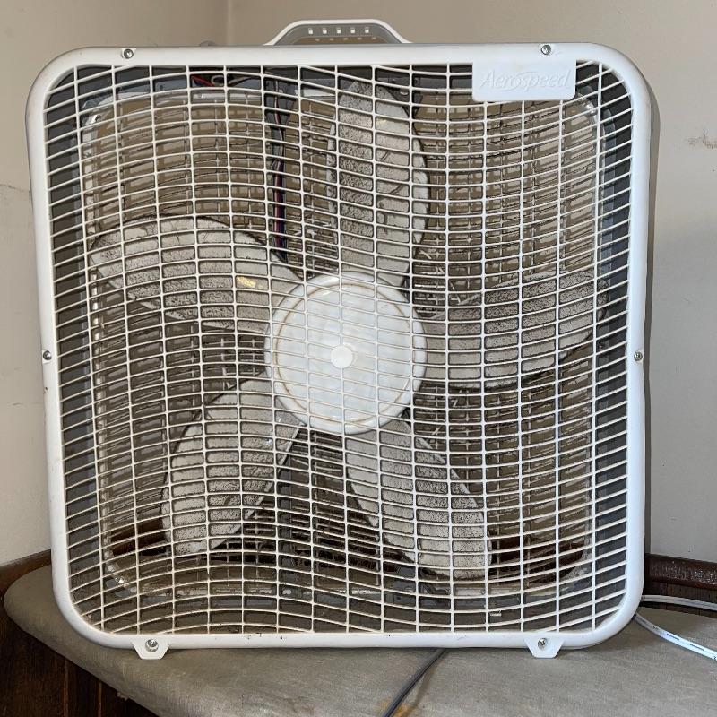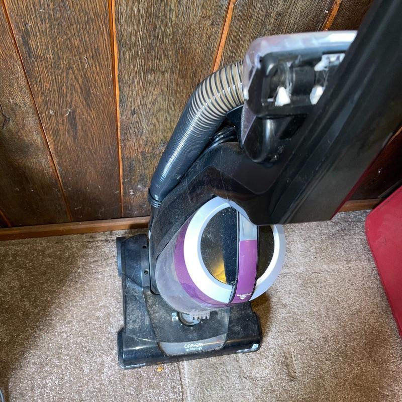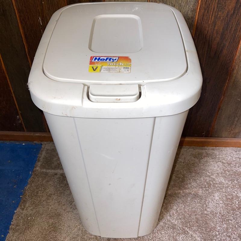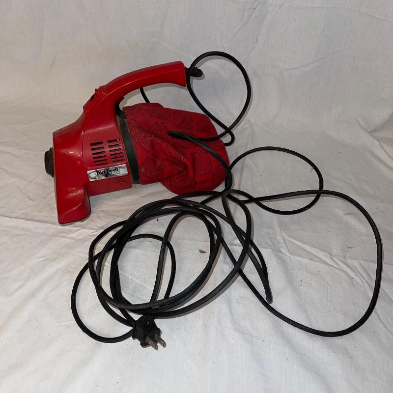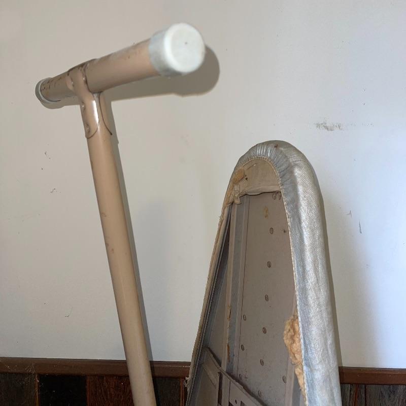 Household essentials which includes, an ironing board, two box fans, wooden hangers, shower rack, a battery wall clock, a bissel vacuum, a dirt devil handheld vacuum, an iron, a pulldown blind sill in wrapping, a lidded plastic trash can, and a small plastic waste basket. Both vacuums, both fans, and the iron turn on when plugged in. Good for some spring cleaning!
