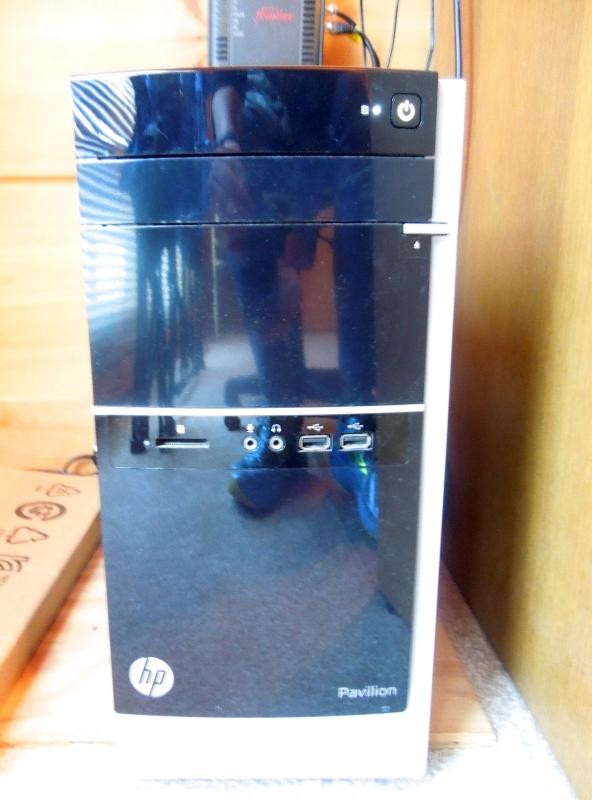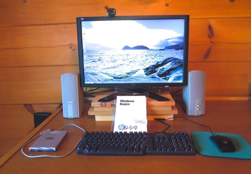 Acer 21" Screen Monitor Moodel X243W; Hewlett Packard Pavilion Tower with DVD (unistalled hard drive). No hard drive. Dell keyboard wired with mouse and mouse pad. Extra HP keyboard. Yamaha wired speakers. Lacie Floppy Disk reader. Microsoft HD camera for Skyping. and APC Surge Protector ES 550.