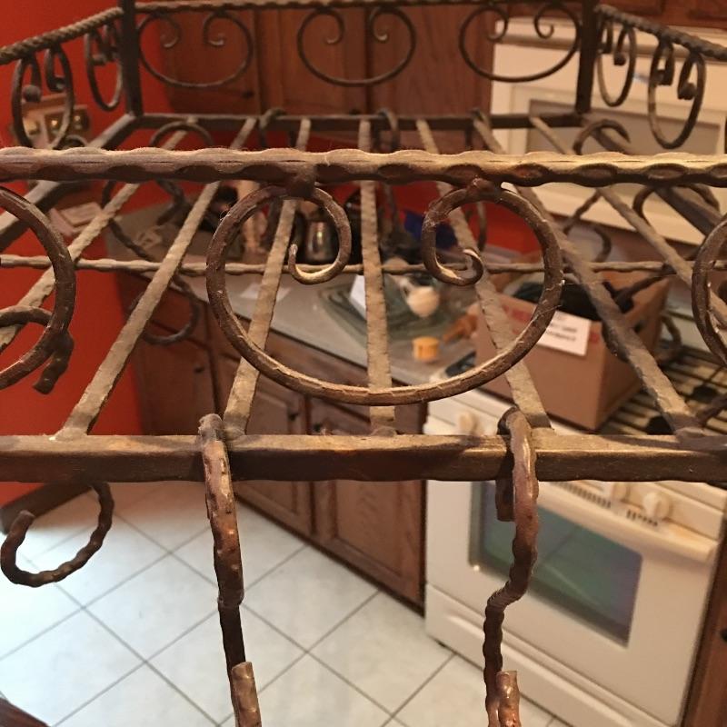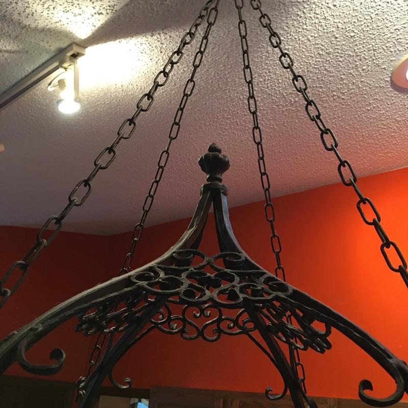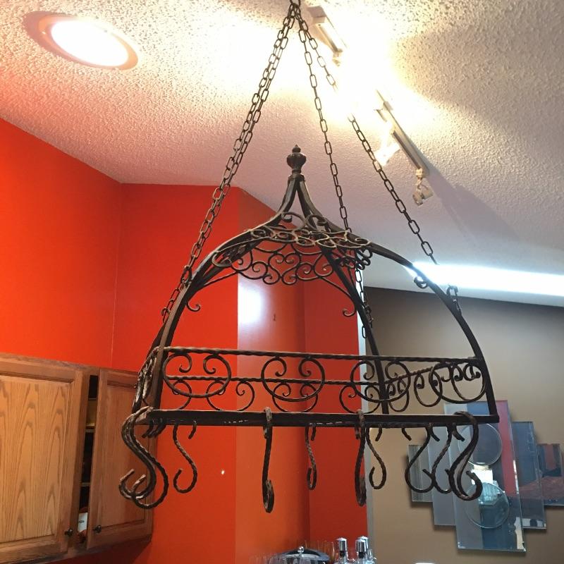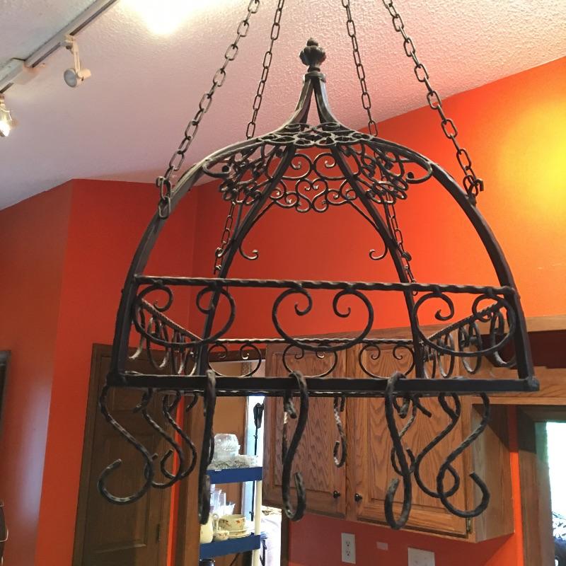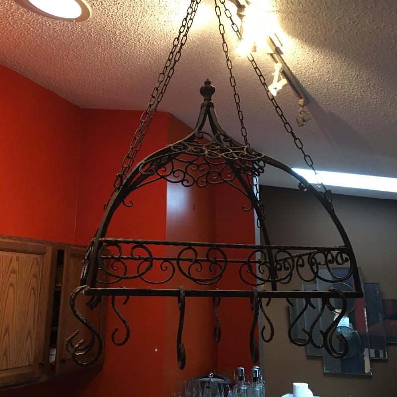What a great way to display your pots and pans and have them right at your fingertips. Rack has shelf with twelve hooks and a adjustable chain to hang up the rack.