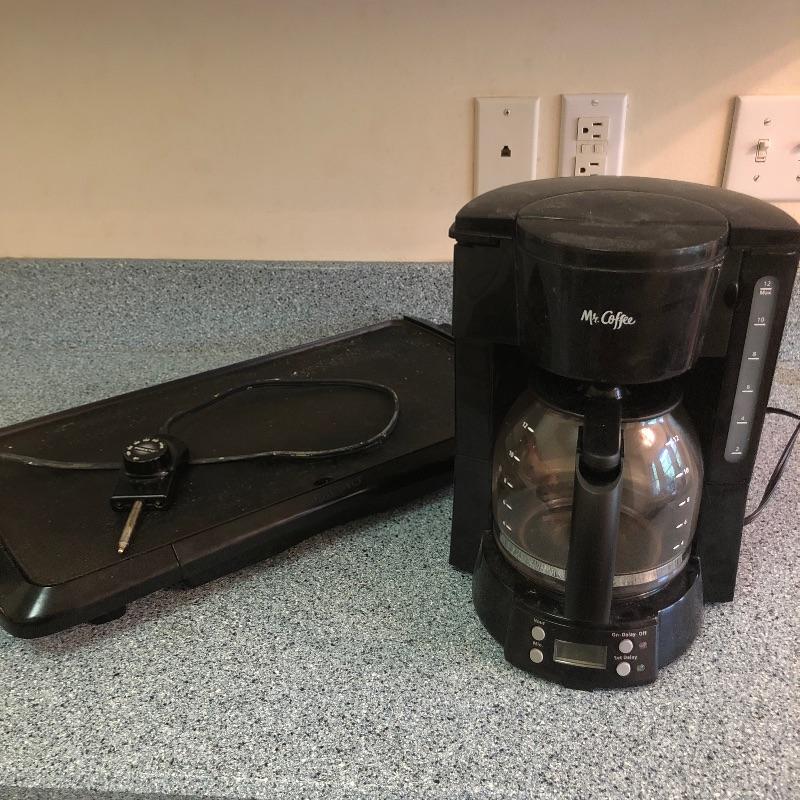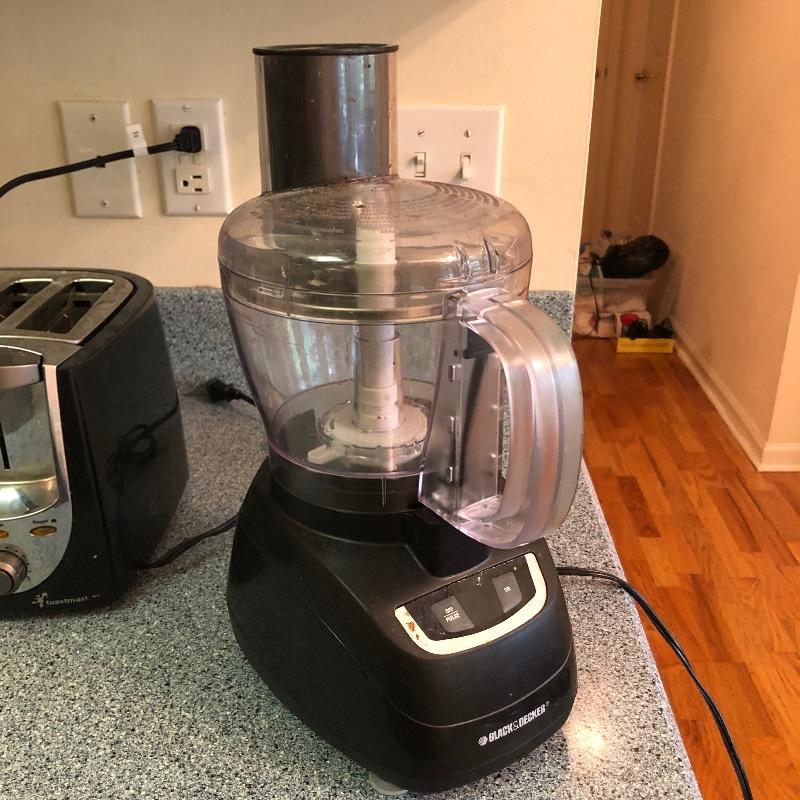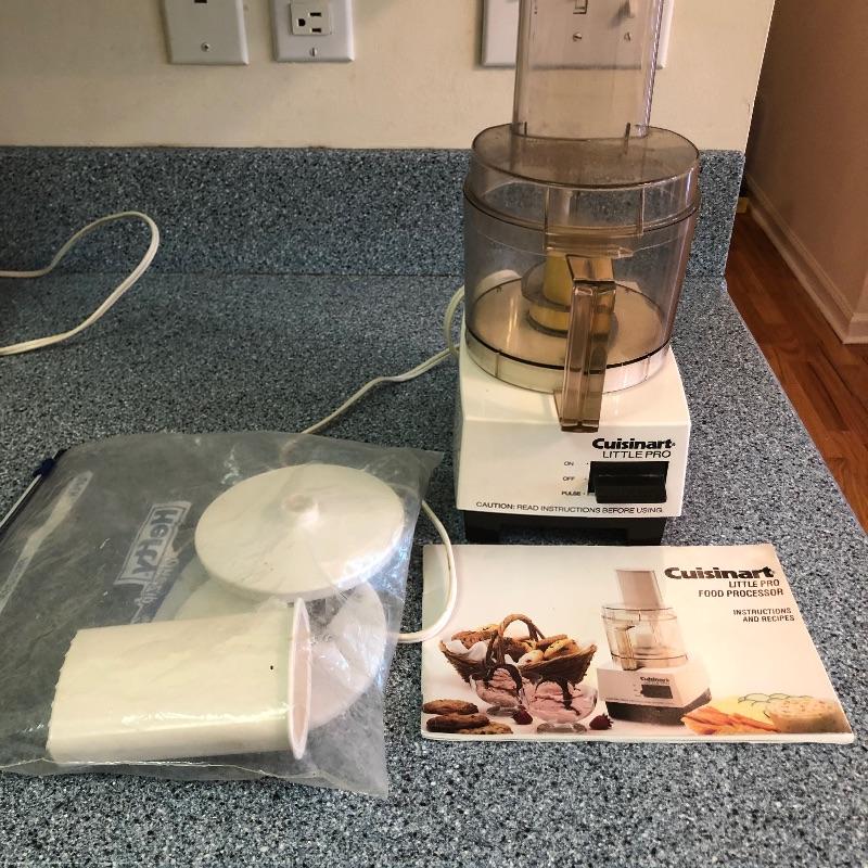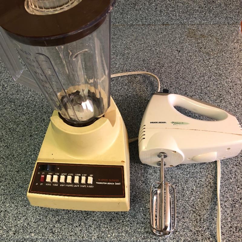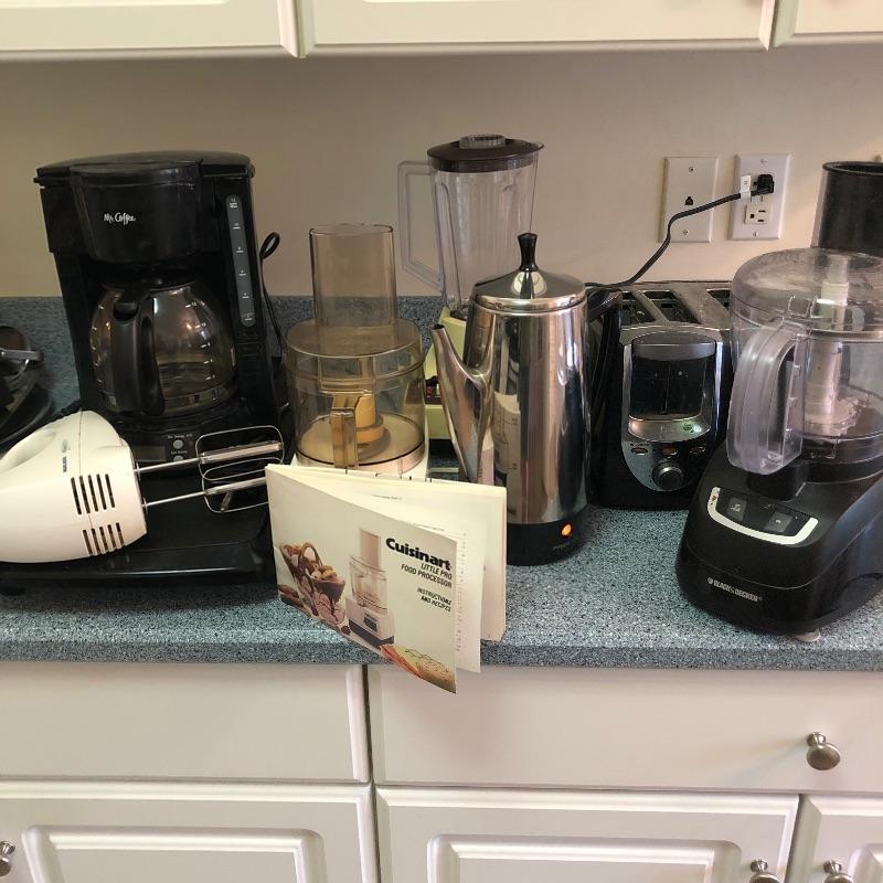 A great starter lot for a new home owner with these 8 appliances. Included are two food processors, the black one is a Black & Decker and the smaller white one is a Cuisinart Little Pro. Also included here is a Black & Decker whisk, Mr. Coffee maker, a Hamilton Beach 14 speed blender, Presto electric skillet, Presto coffee pot and a Toastmast double toaster. All appliances turned on when tested.