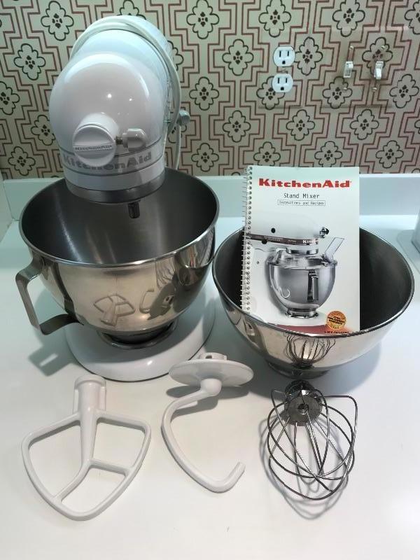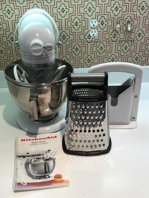Kitchenaid stand mixer comes with instruction manual, two mixing bowls and three beaters. Kitchenaid grater. Bagel slicer