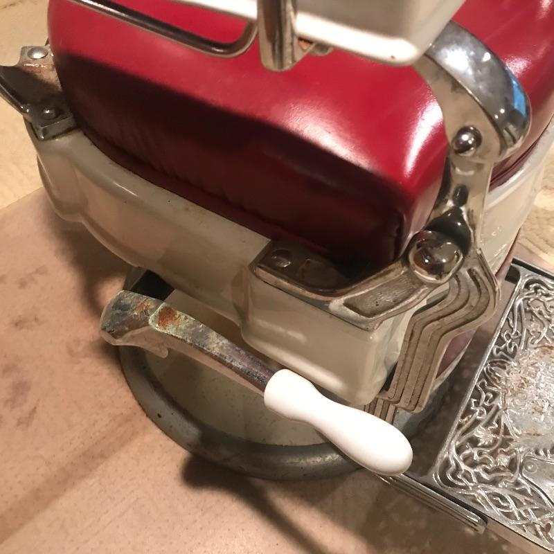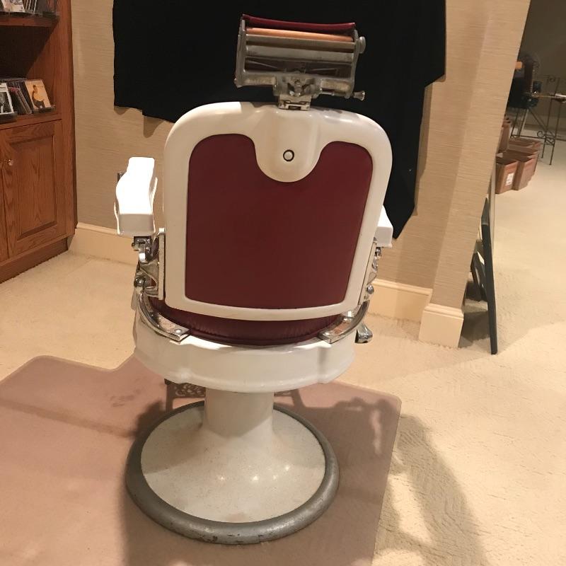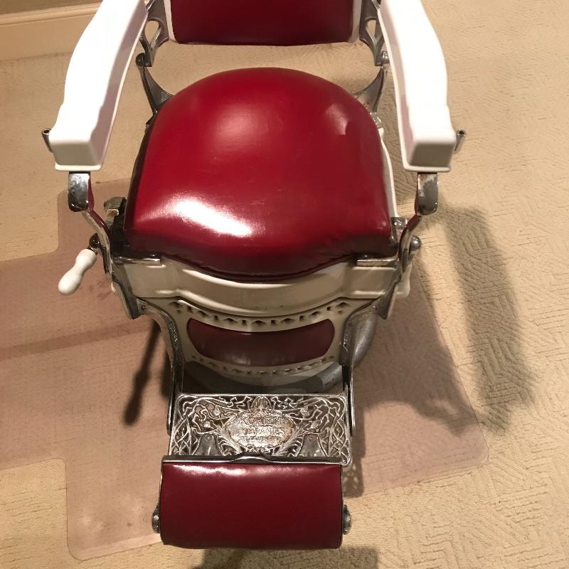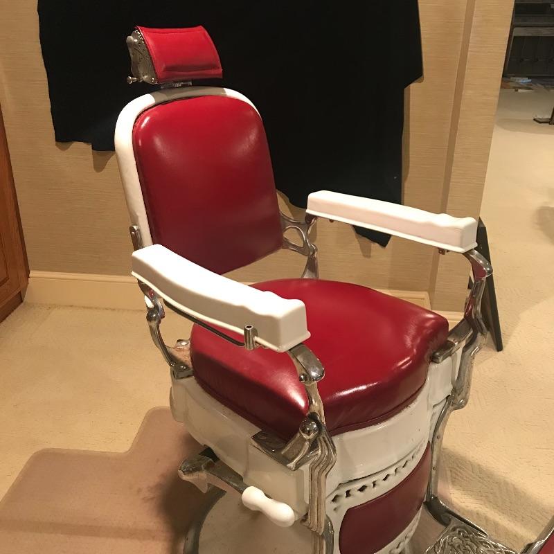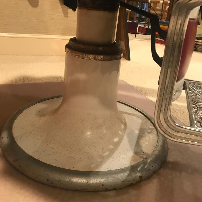 This eye catching red and white vintage barber chair by Koken is a statement piece. Use it in your home or office. It is beautifully kept and in good working order. The hydronic lift still works. Minimal rust spots. See pix. PLEASE bring help moving as our staff can not assist and it is heavy and has to go up a flight of stairs on the outside of the home. Local pick up only.