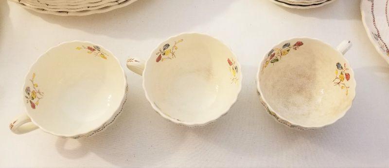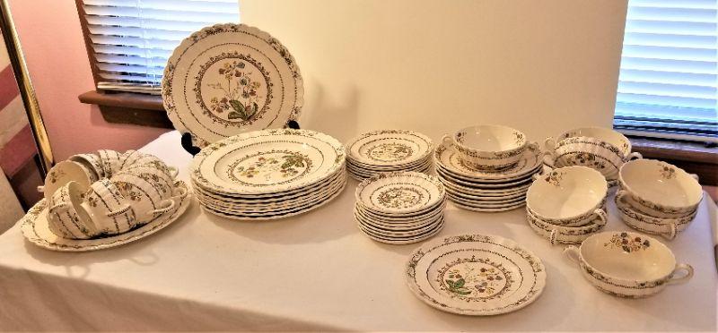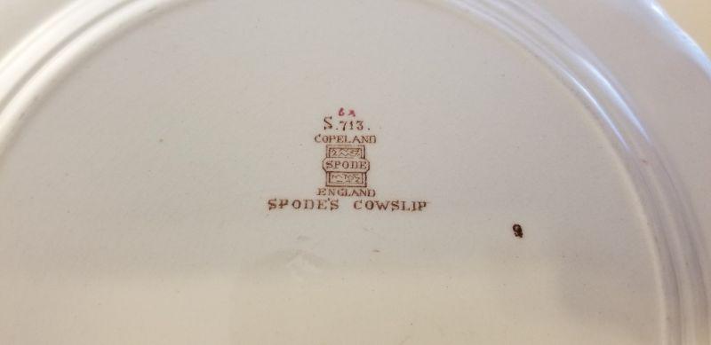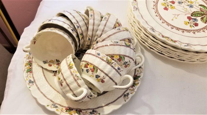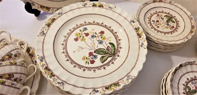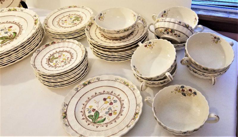 Spode dinnerware in the "Cowslip" pattern. You get all you see here: 10 dinner plates (10.5" across), 9 cream soups with underplates, 9 cups, 8 bread/butter plates, 10 saucers for cups, 1 salad plate. Some of the cream soups craze interior crazing, as shown.