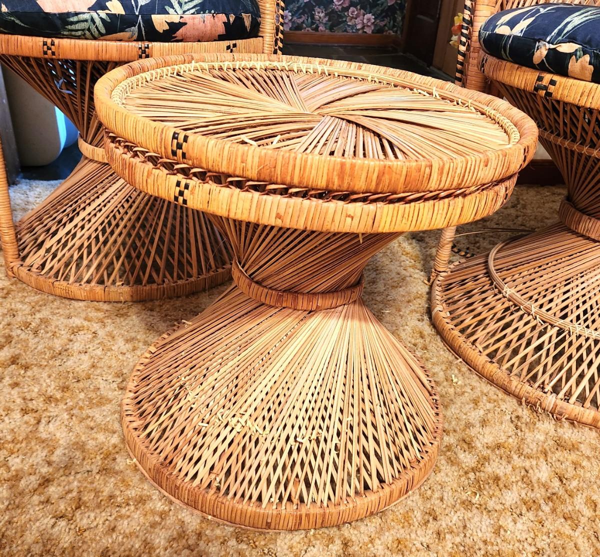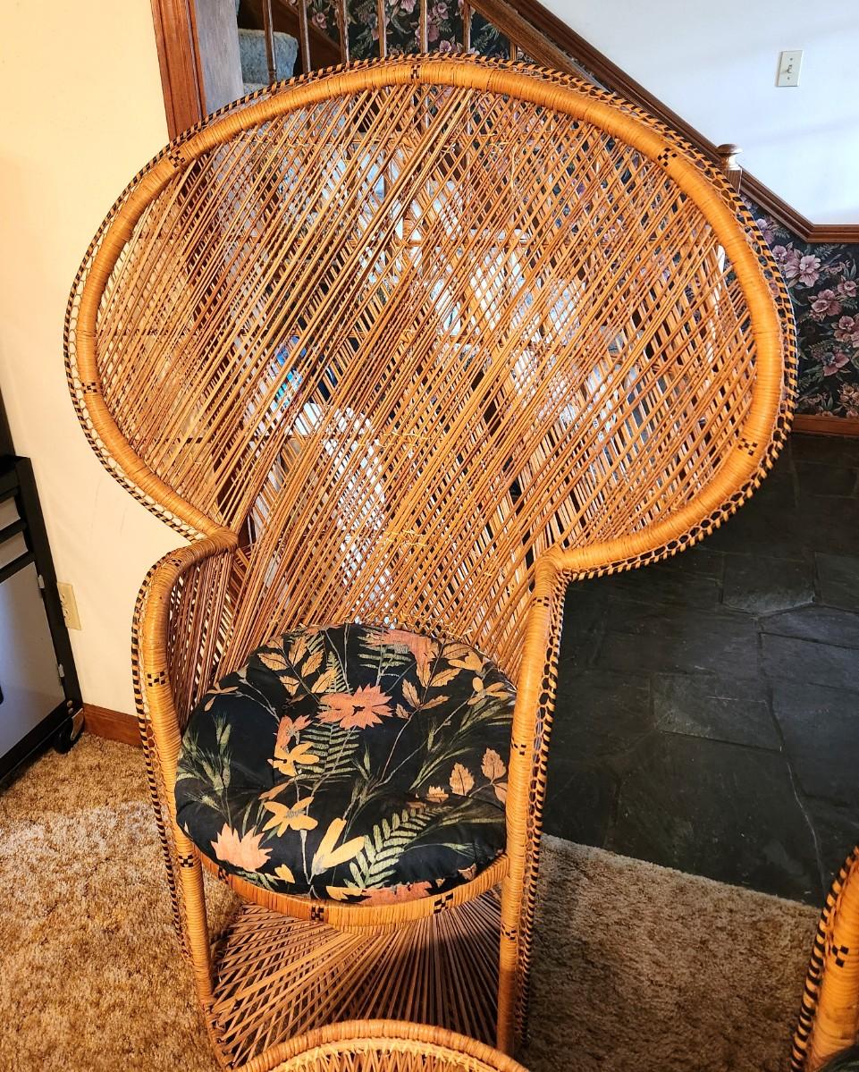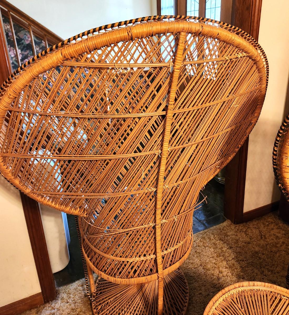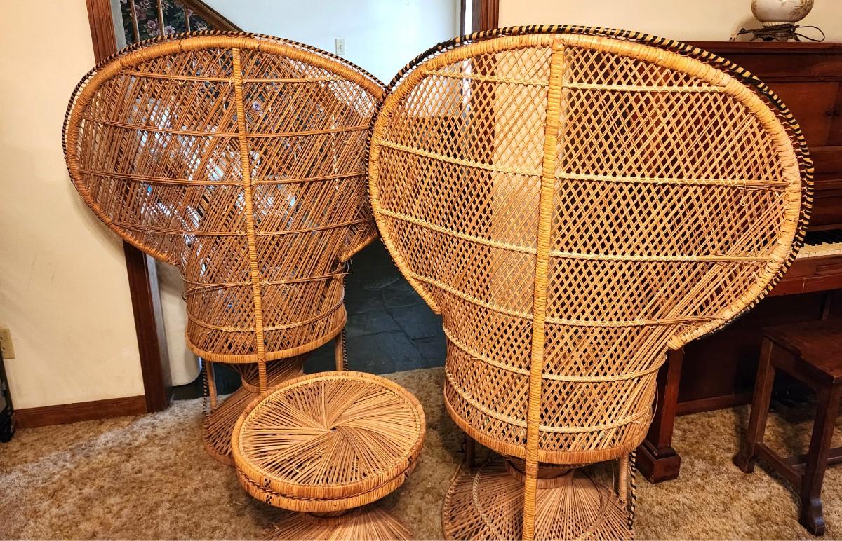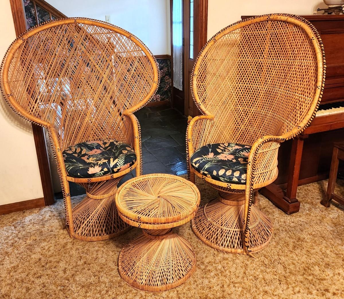 You get all you see here - lot of 2 vintage Peacock chairs w/small table. Note: one of the chairs is more tightly woven than the other (vintage condition). Table is 18" x 18" (no issues). Chairs are 54" tall at tallest point, 38" wide at widest point. Please look closely at the photos.