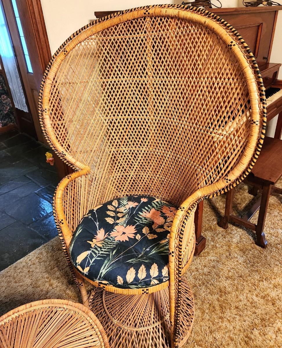Lot #114 Lot of 2 Vintage Peacock Chairs w/small table - BOHO