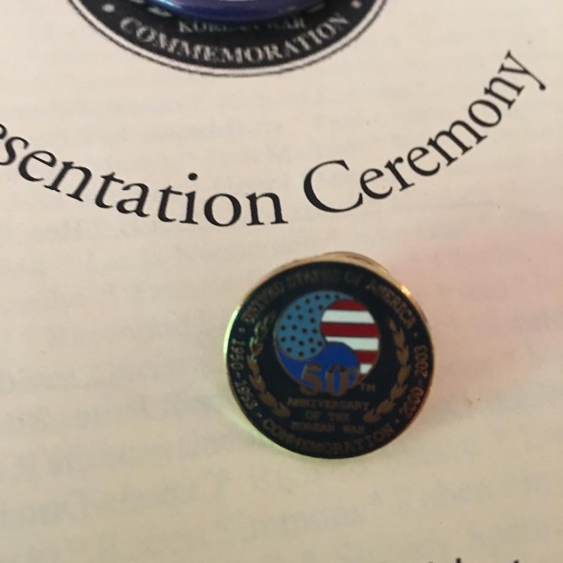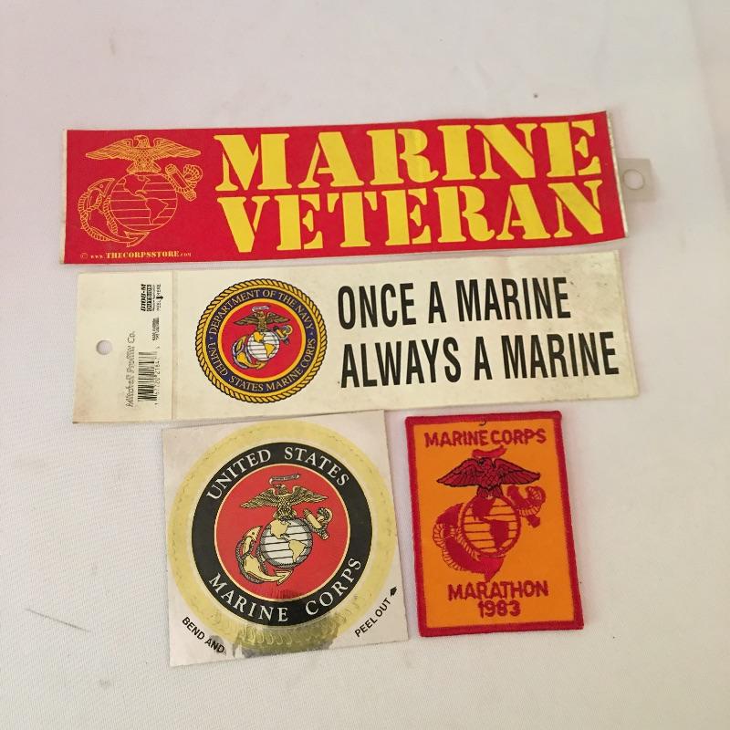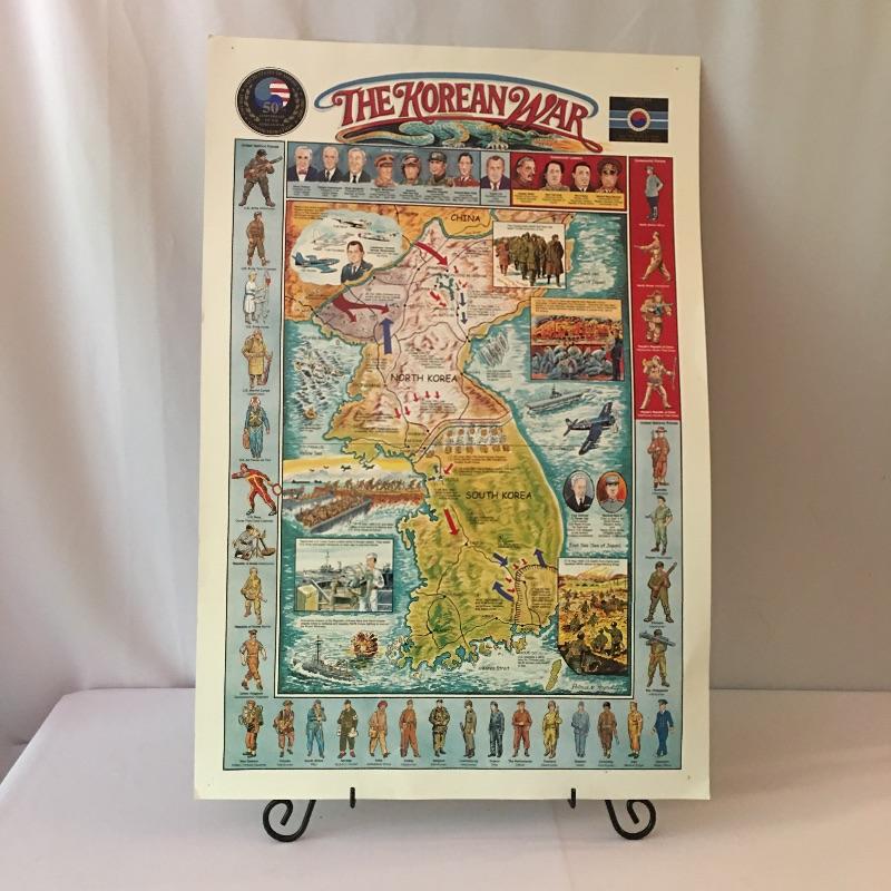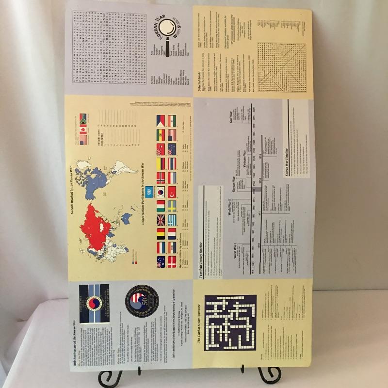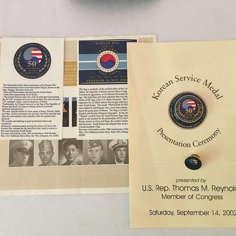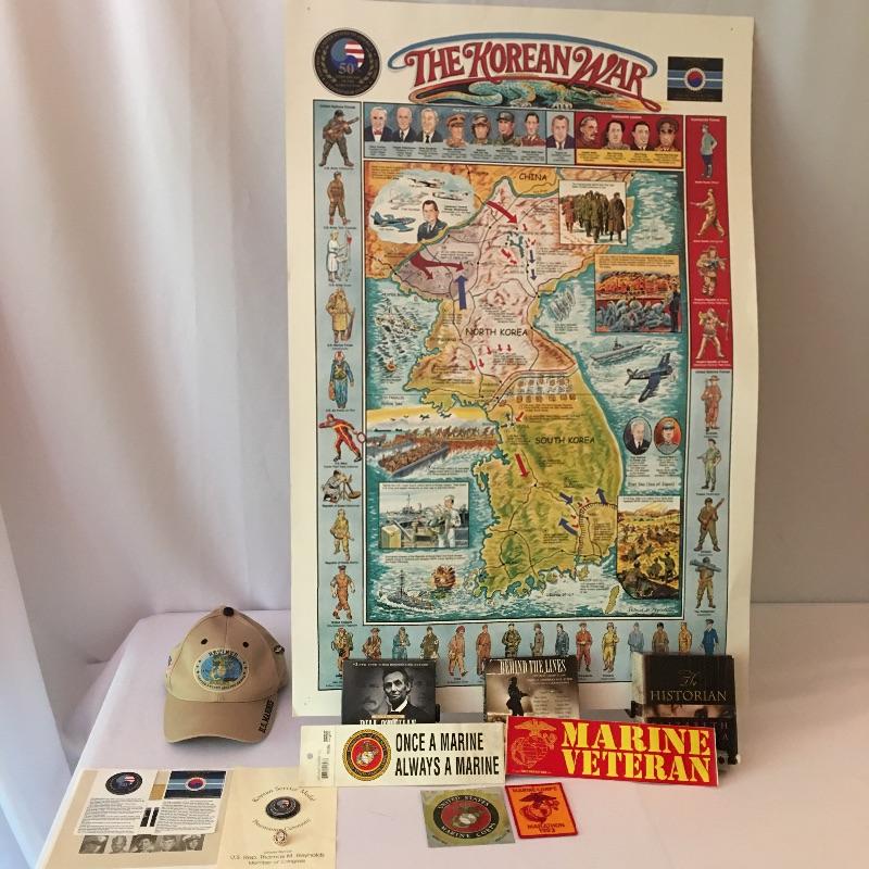 Military array. Lot includes poster on Korean War, USMC hat, bumper stickers and patch, Korean service medal pin and DVDs titled Behind the Lines, Killing Lincoln and The Historian. We thank all those who served.