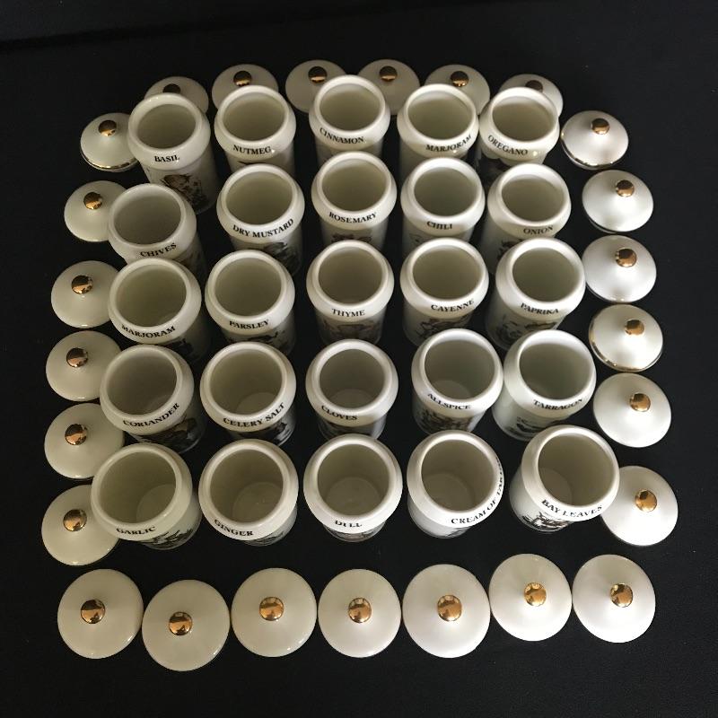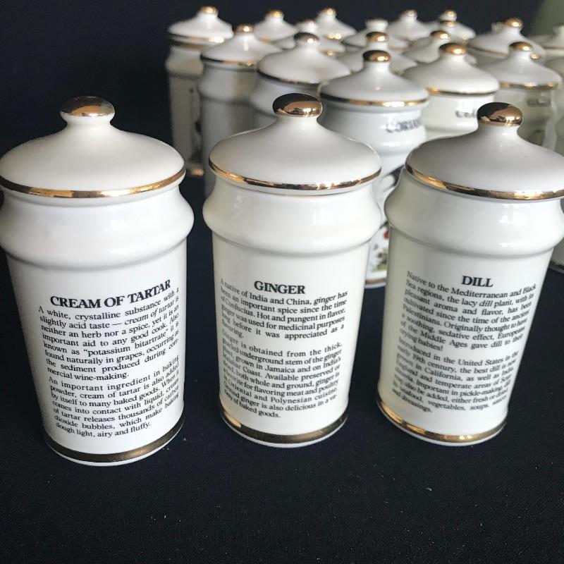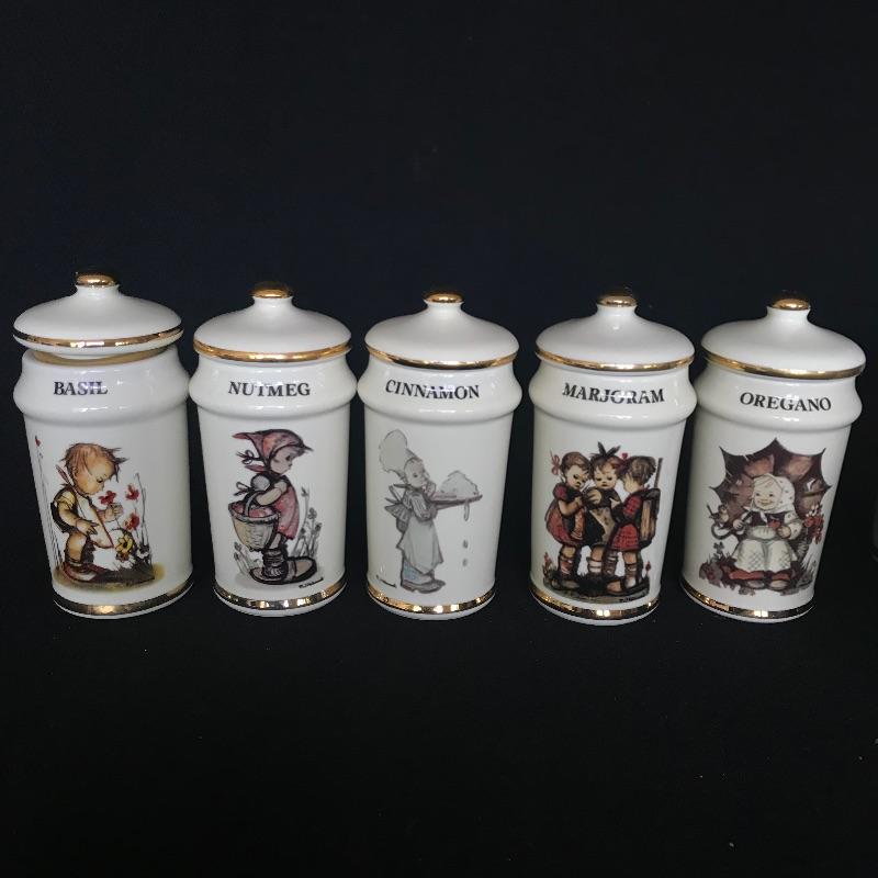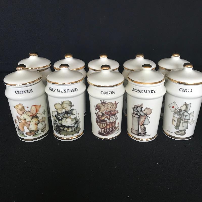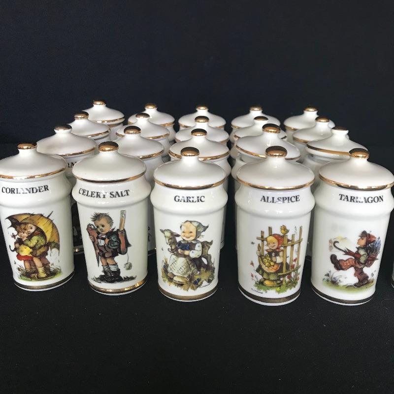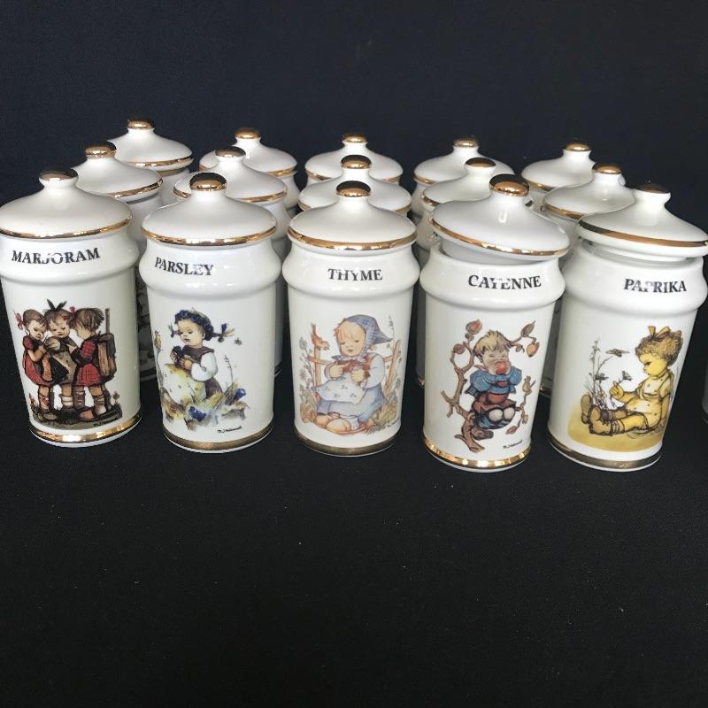 Twenty-five jars of the 1987 MJ Hummel spice collection with gold trim. Each jar has a unique picture and a short piece of history of the corresponding spice. Collection is in amazing condition. See photos. Shipping available.