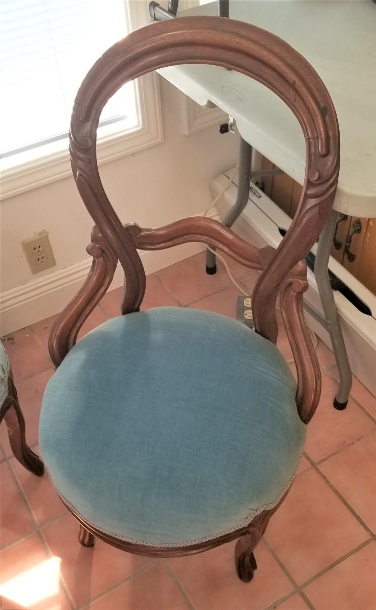 Nice pair of old balloon back parlor chairs - blue velvet upholstery. One has evidence of an old repair to one of the legs. 3 feet tall, 29.5" across, 21.5 deep.