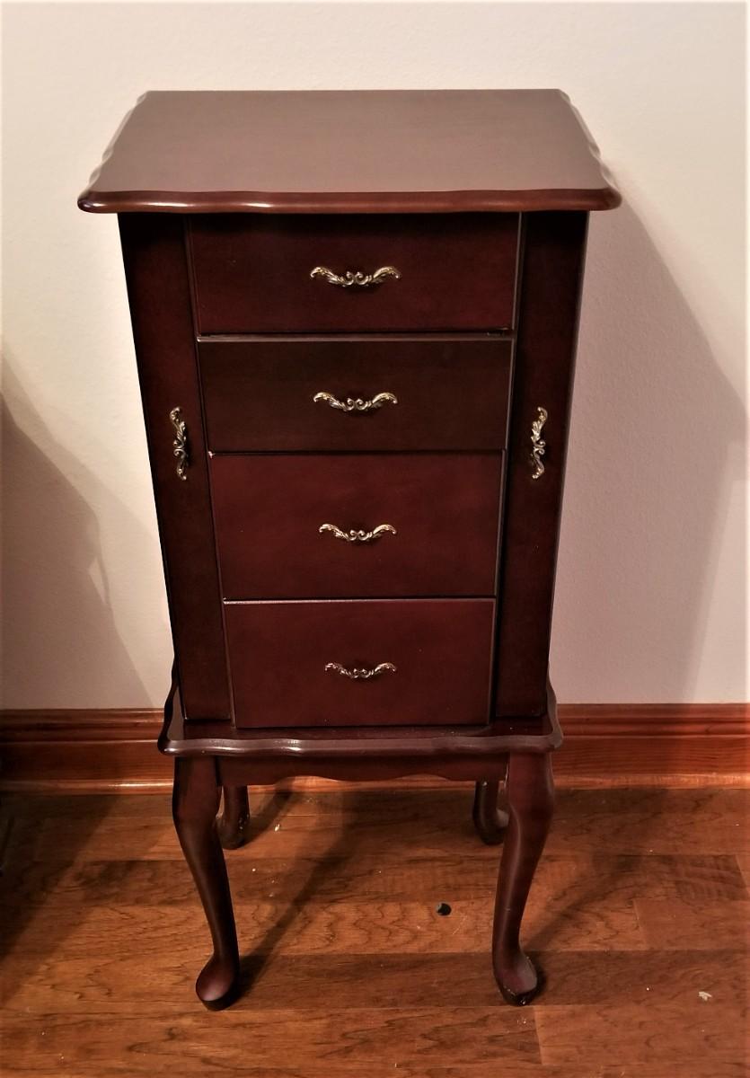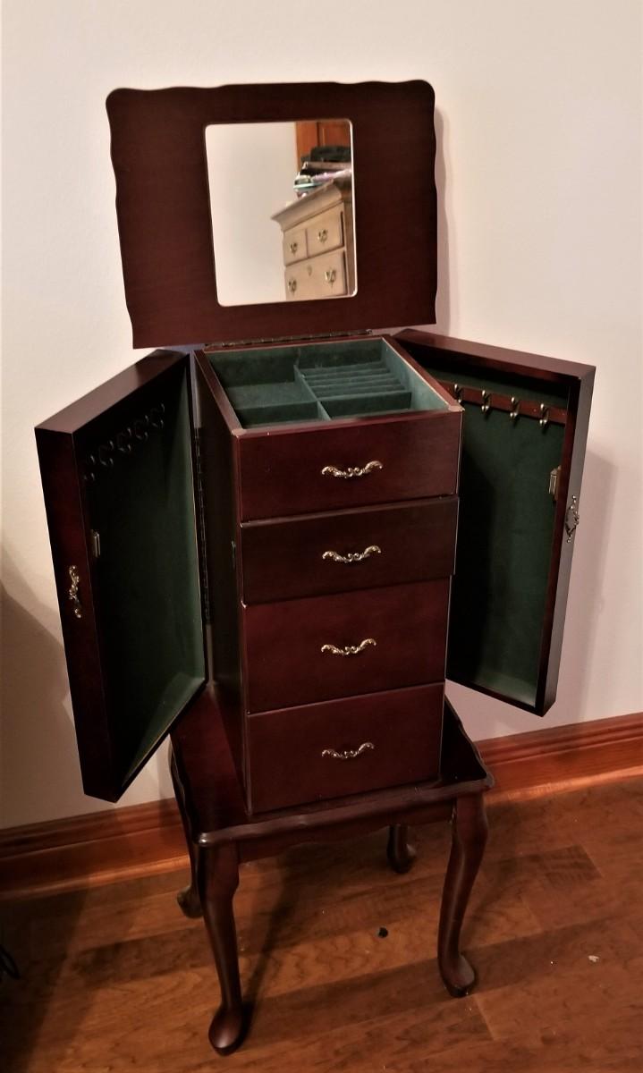 Gently used Queen Anne Style Jewelry Armoire - 15.5" across, 12" deep, 37" tall.