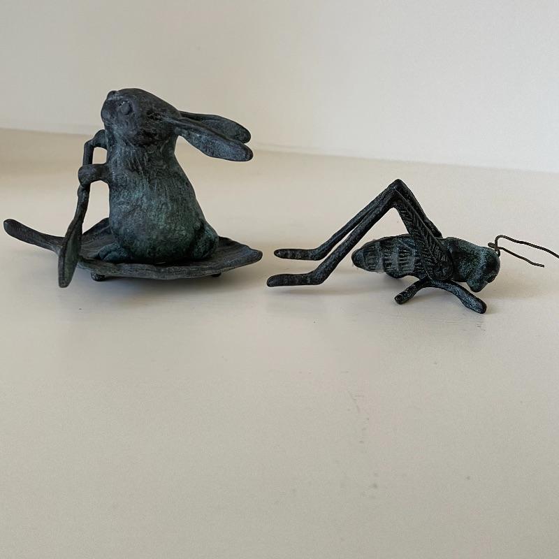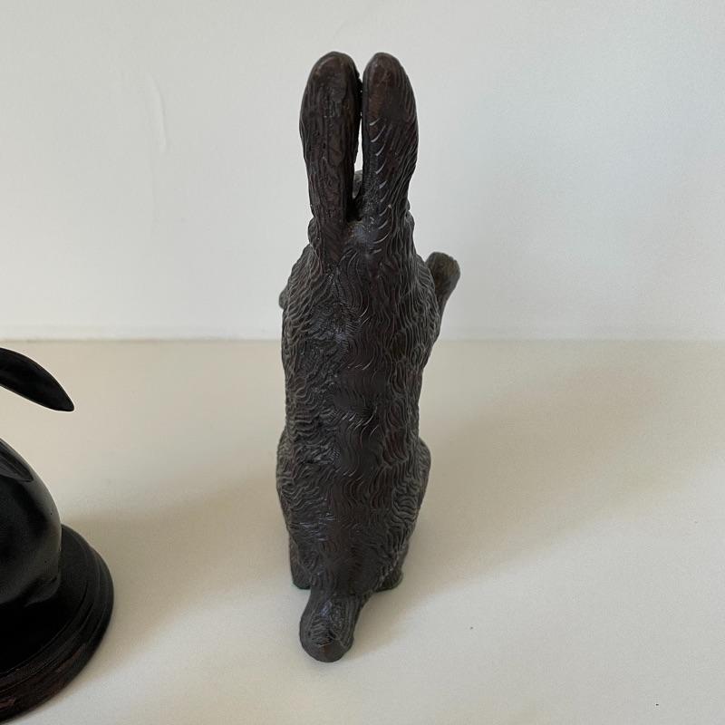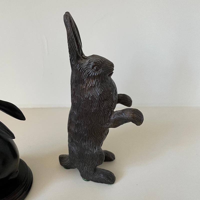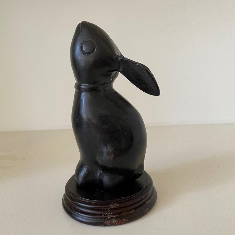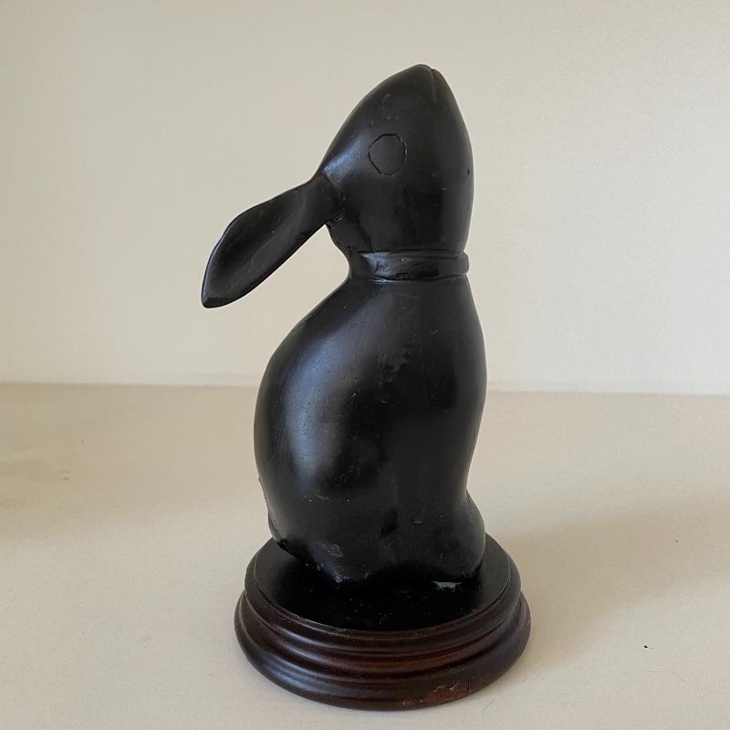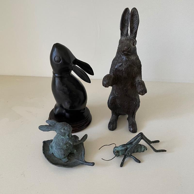 Two metal rabbits, a metal grasshopper and a stone like carved rabbit. These heavy pieces are packed with personality. The black stone-like rabbit has a waxy adhesive keeping it on its wooden stand. The piece is 6.25” tall. See images. Shipping available.