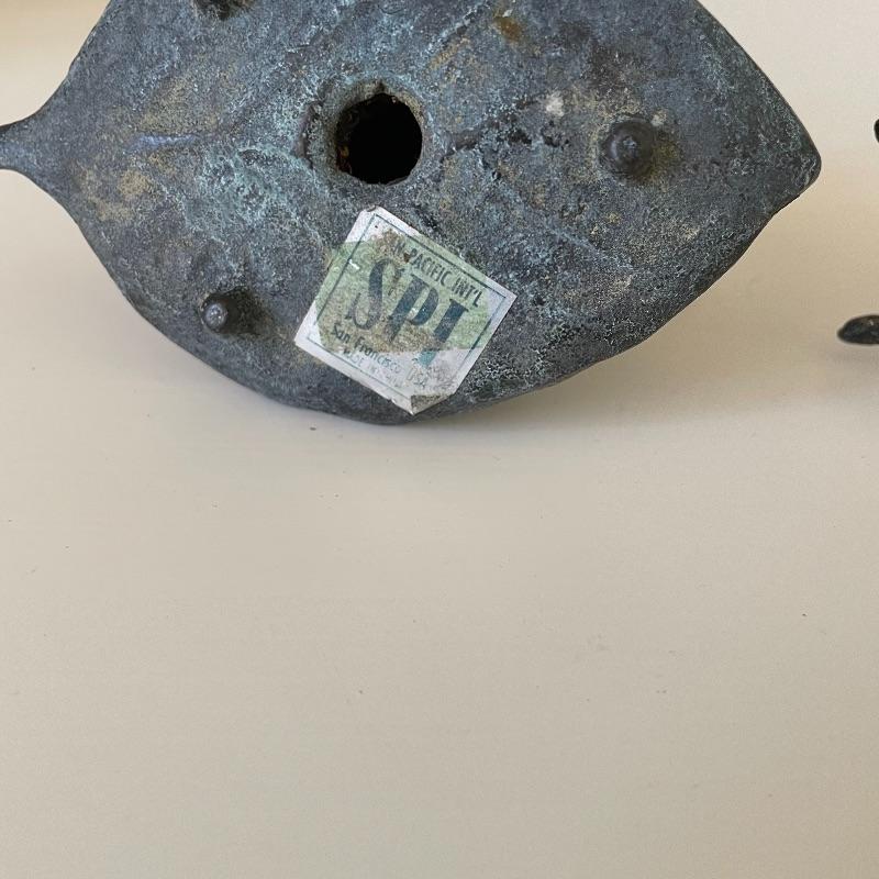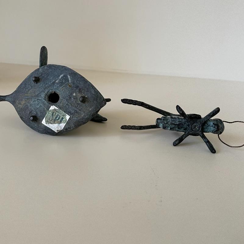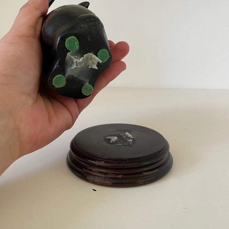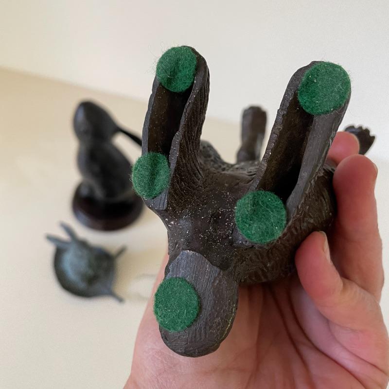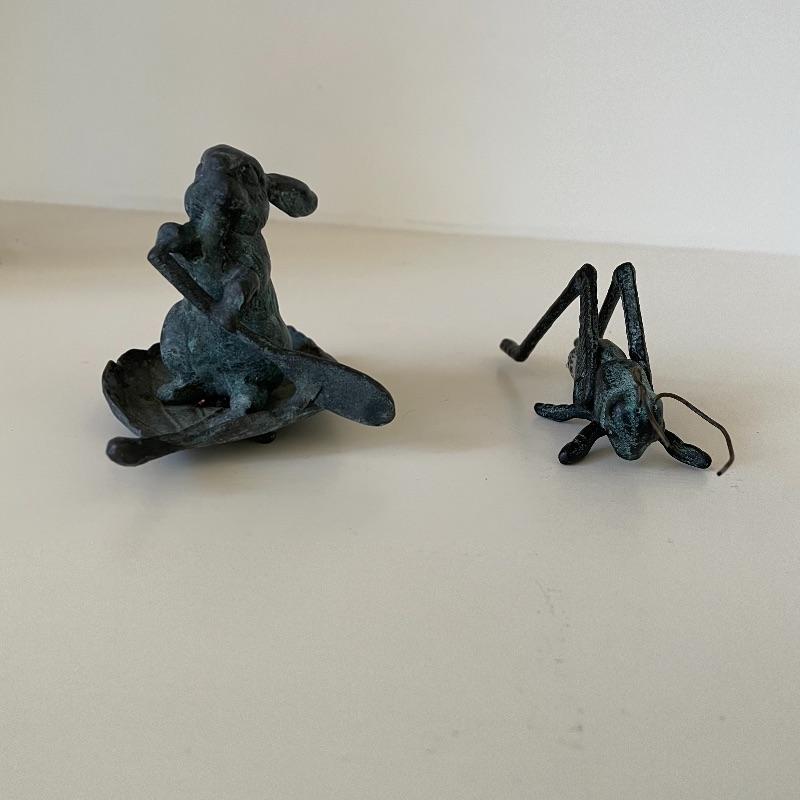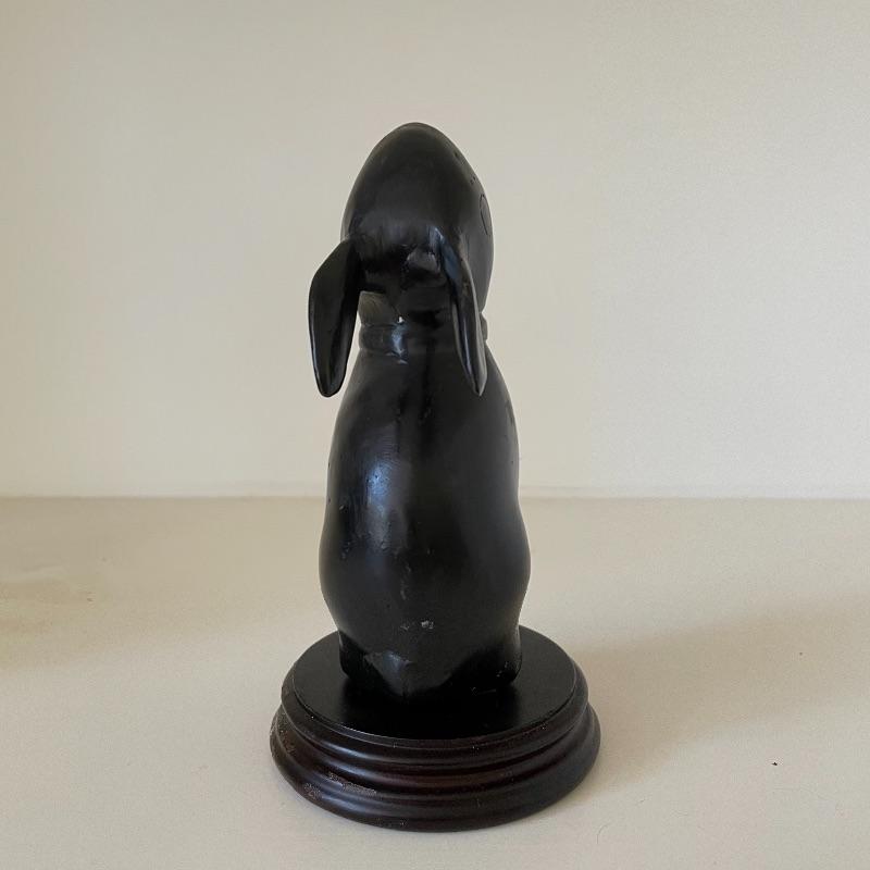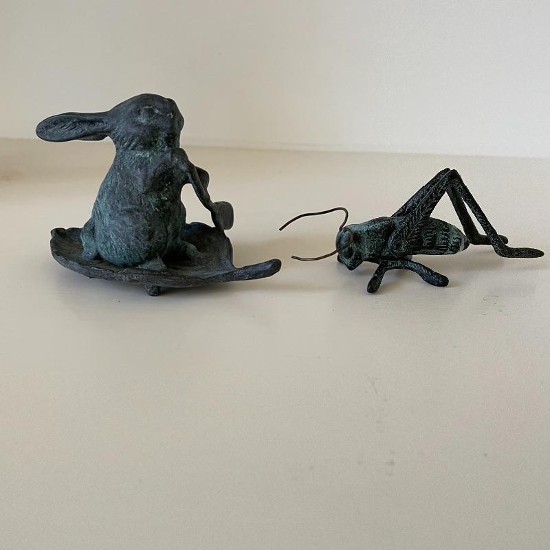 Two metal rabbits, a metal grasshopper and a stone like carved rabbit. These heavy pieces are packed with personality. The black stone-like rabbit has a waxy adhesive keeping it on its wooden stand. The piece is 6.25” tall. See images. Shipping available.