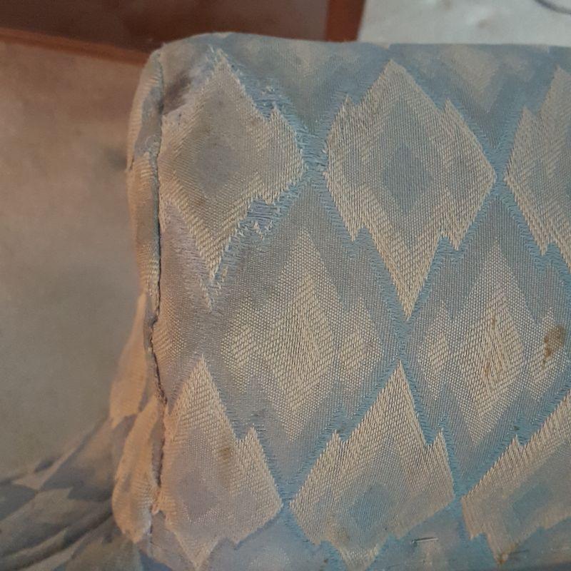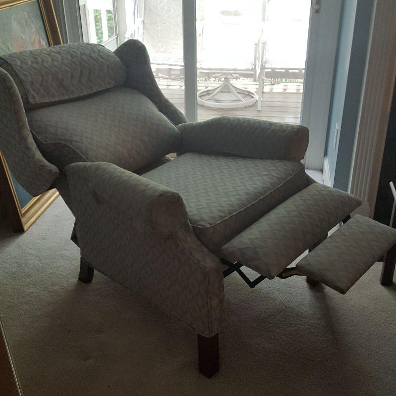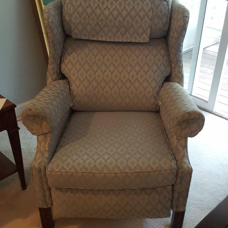Push back and relax in this very comfortable wing back light blue toned recliner. Recliner stands 42in high and is 29 in wide at the top. There is no name brand on it. It's in good condition, worn spots on the arm rest covers. Local pick up only.