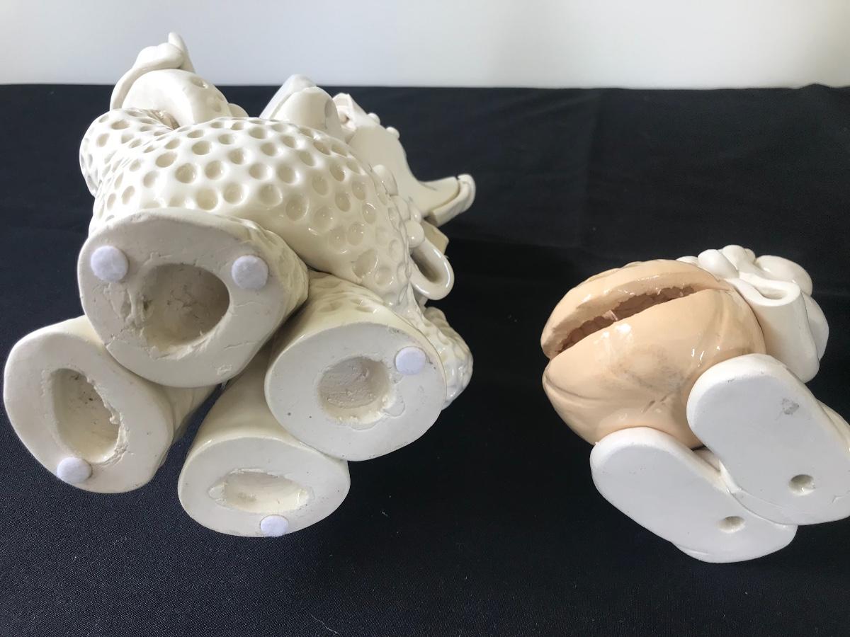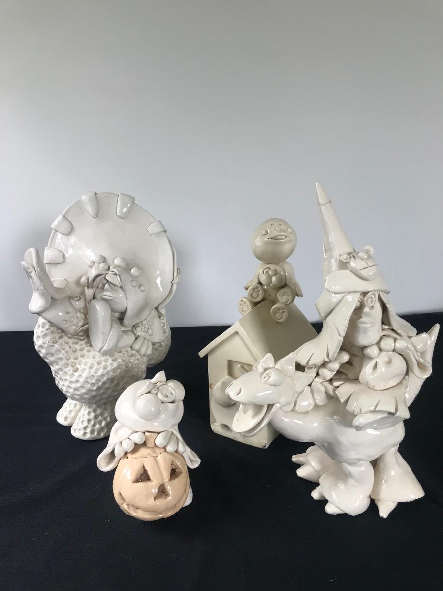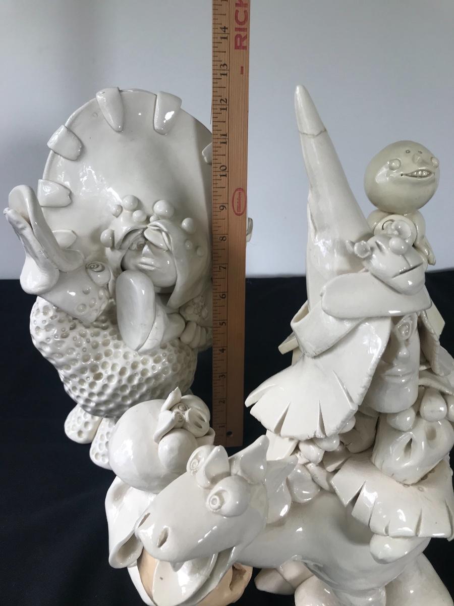 Sculptures come to life in these whimisical characters. Dragon with witch, pig and pumpkin, bird on dog house, and a duck like creature with rider. Some of these do have small chips to the pottery and they are sharp. Please see all pictures for content of the lot, condition of the lot, and measurements if taken. Pictures are the best representation of the items listed and items are untested unless indicated in description. Thank you for looking and have fun bidding!
