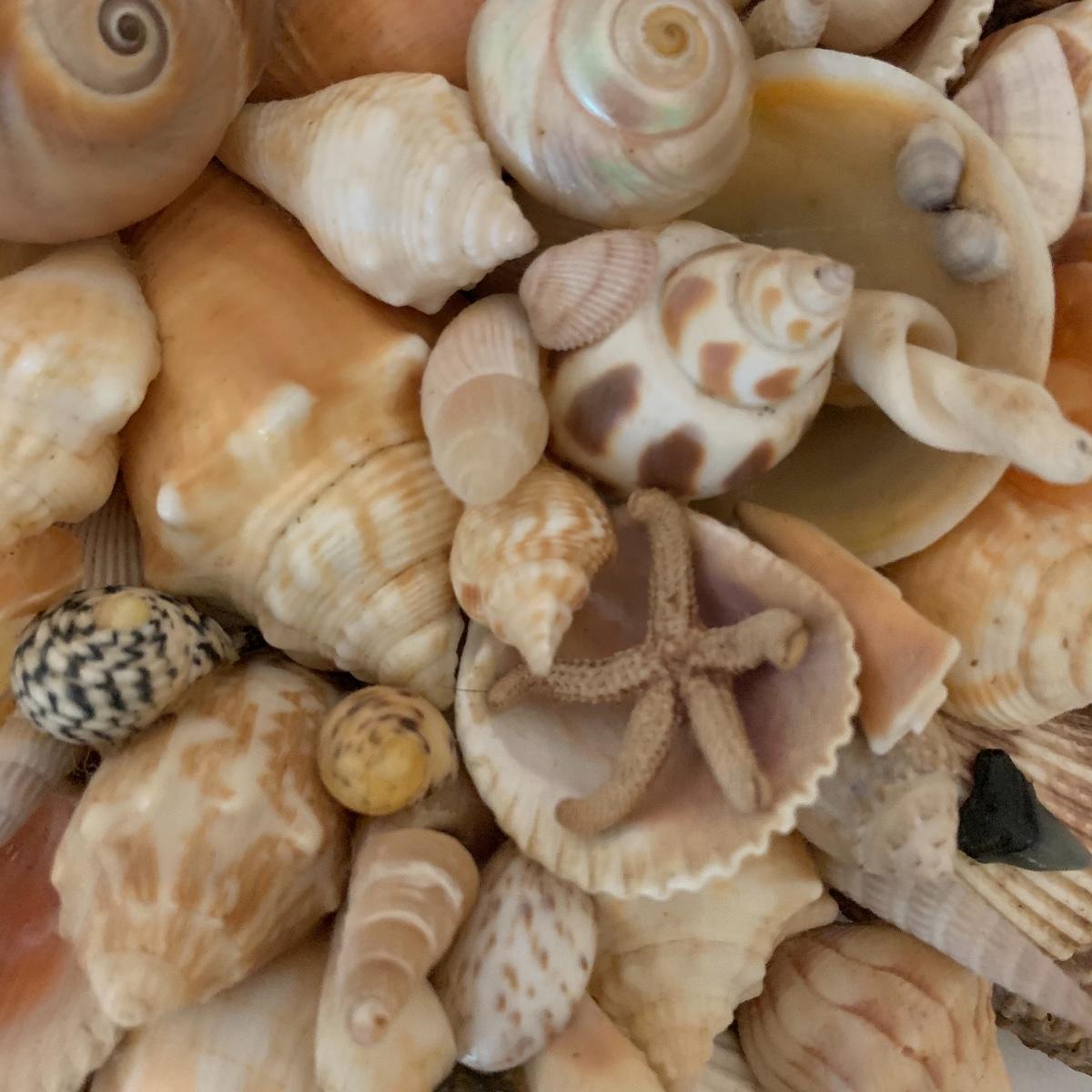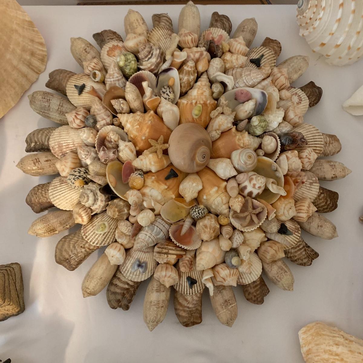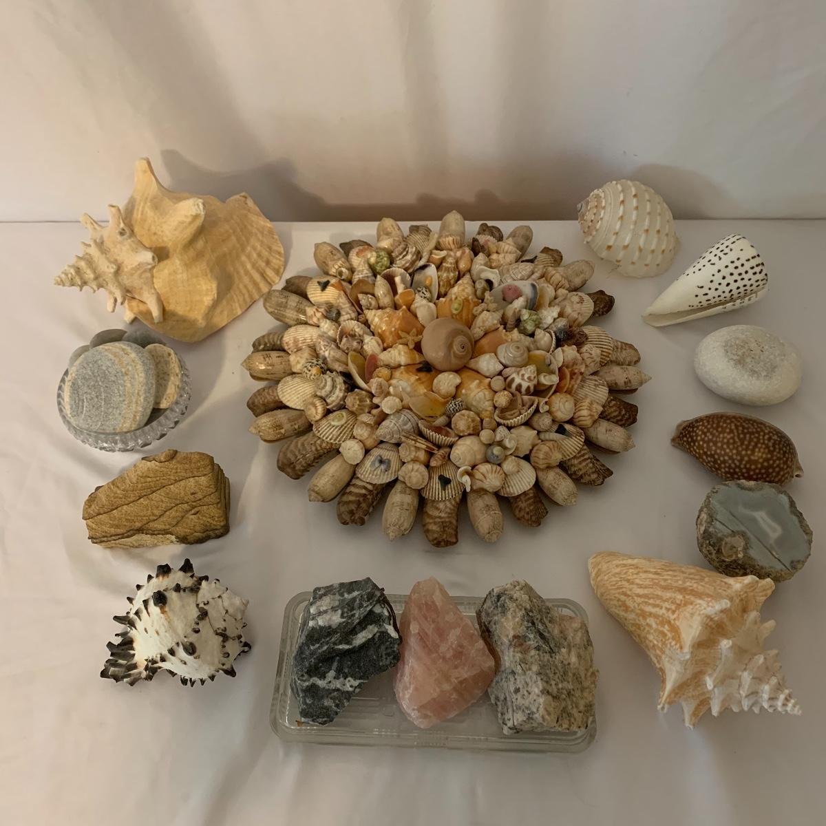 Bring the outdoors indoors with this exquisite shell and stone collection. The center piece of this group is a beautiful circular wall hanging featuring many types of shells and starfish. A few of the shells on this piece need to be reglued. The rest of this lot are assorted shells and stones. Also included are a glass bowl and tray to display these special finds. Shipping available