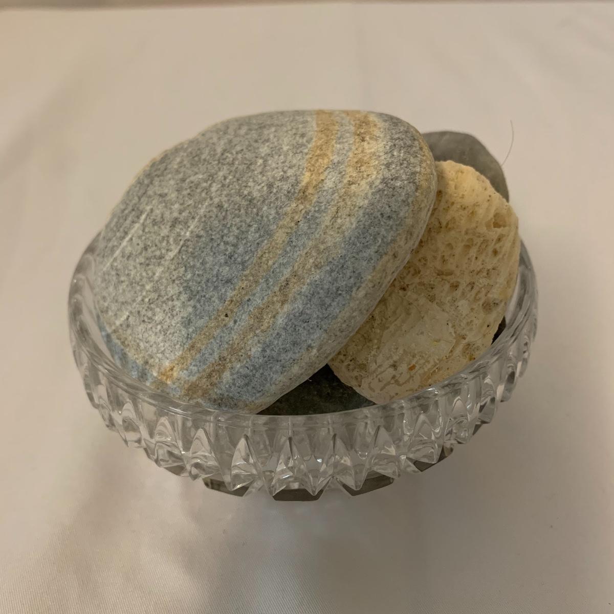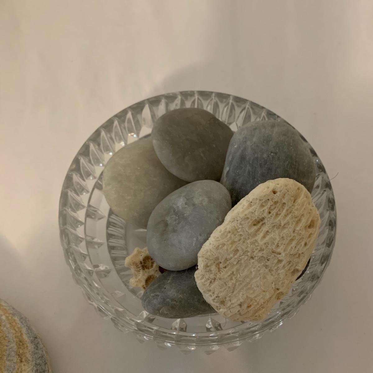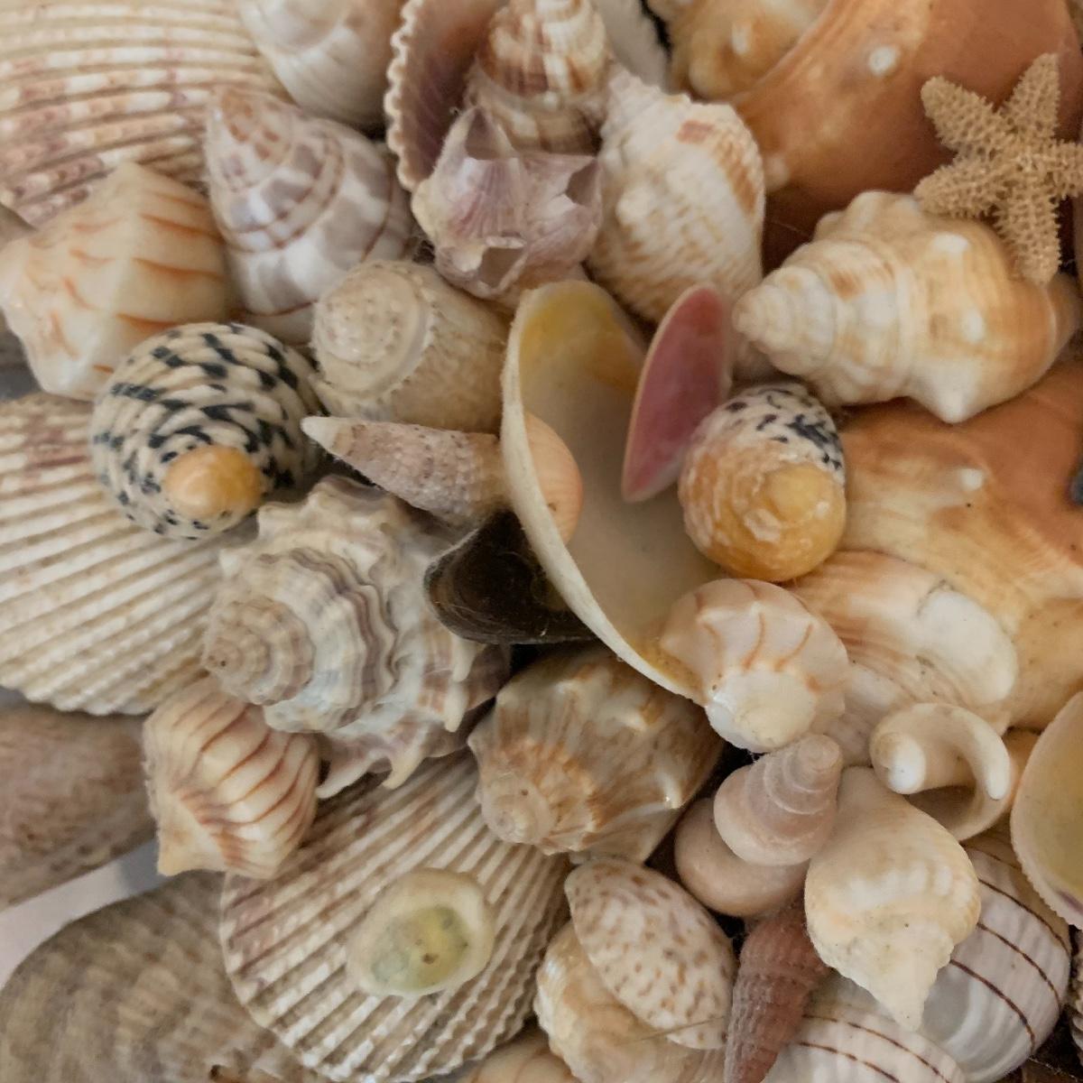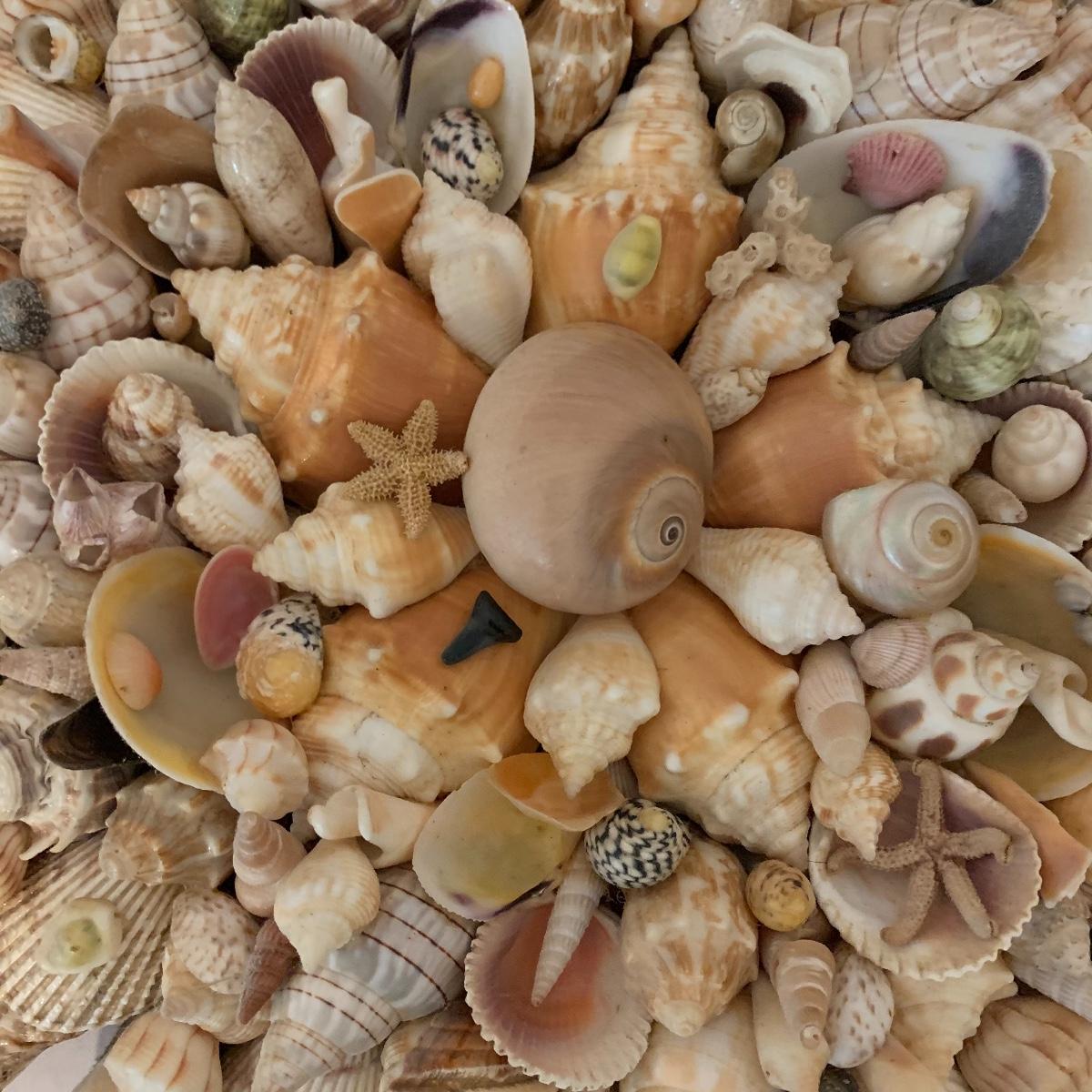 Bring the outdoors indoors with this exquisite shell and stone collection. The center piece of this group is a beautiful circular wall hanging featuring many types of shells and starfish. A few of the shells on this piece need to be reglued. The rest of this lot are assorted shells and stones. Also included are a glass bowl and tray to display these special finds. Shipping available