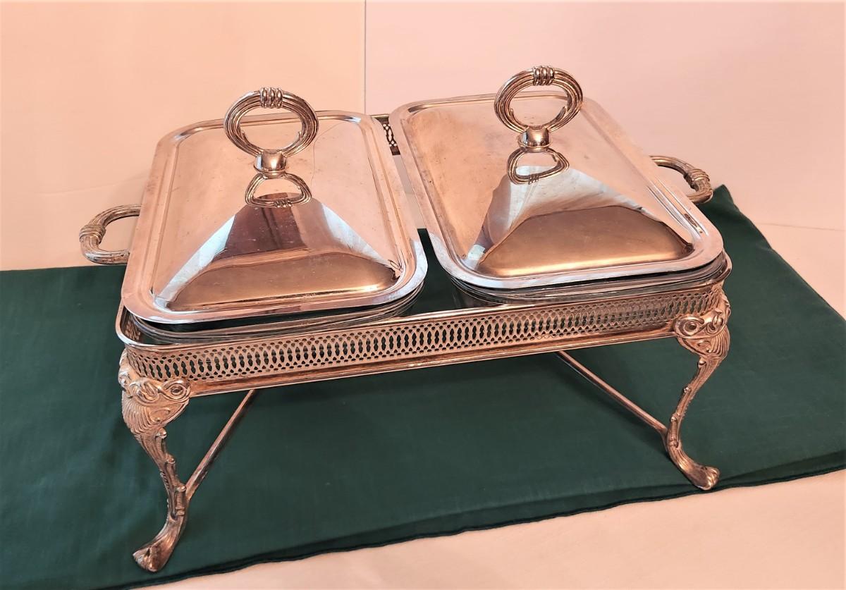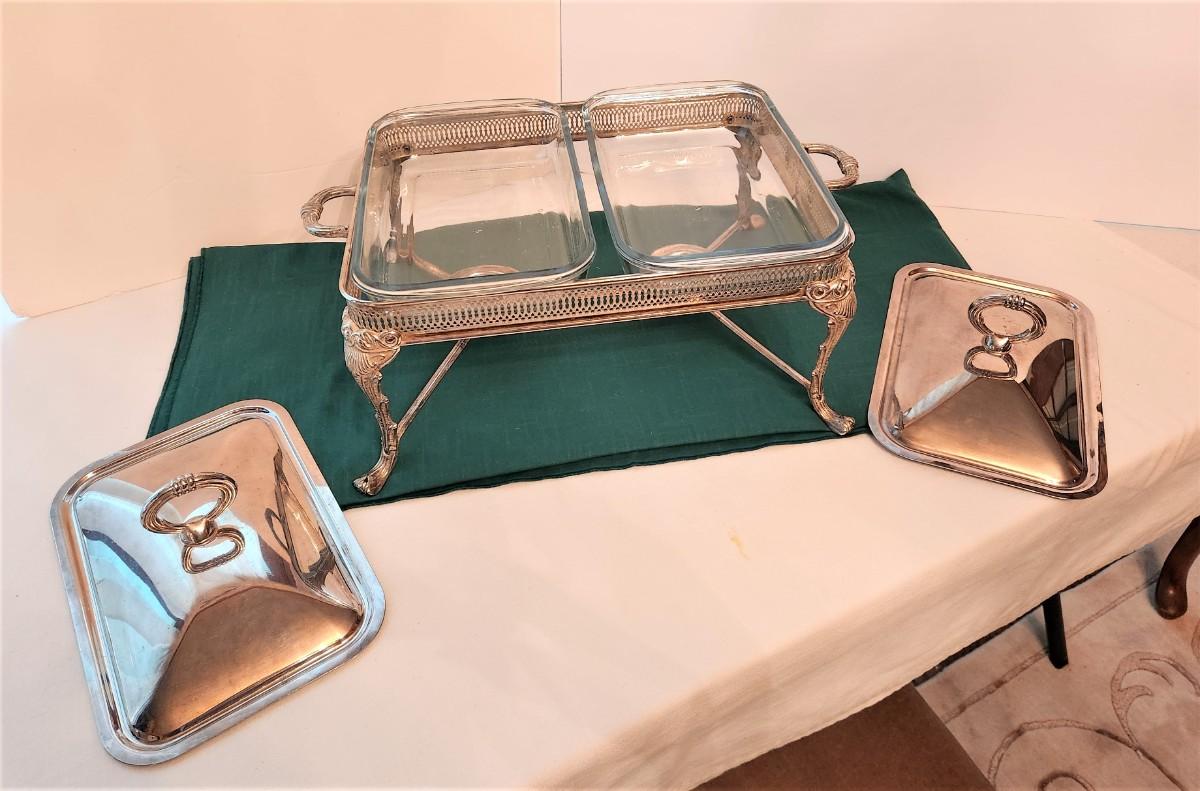 Silverplate Buffet Serving set - two dishes - holders for sterno beneath. Dishes measure 11.5" x 7", piece stands 7" tall, 16" across handle to handle, 10" deep. The holidays are coming!! Good gently used condition.