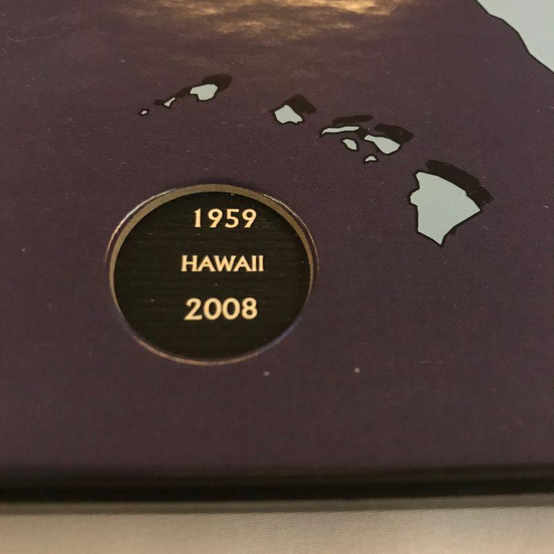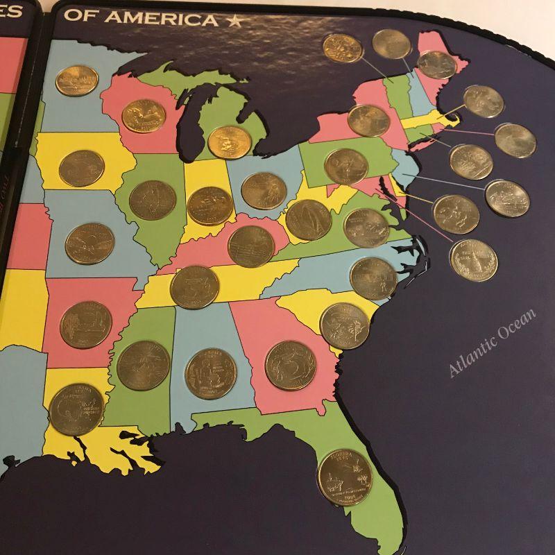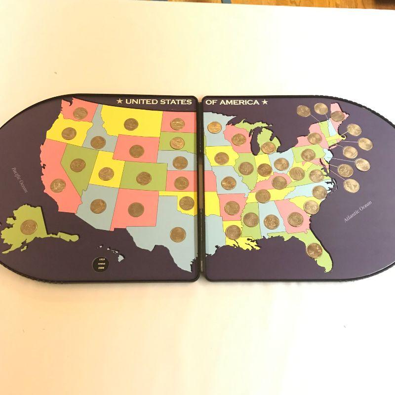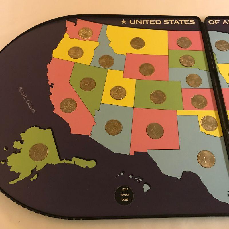 State Quarter Map Set. Includes all coins but the Hawaii quarter. Please note, this item will not fit in a flat rate box and will need to be shipped via UPS. Please call 828-252-6930 with dimensions for a shipping quote prior to bidding.