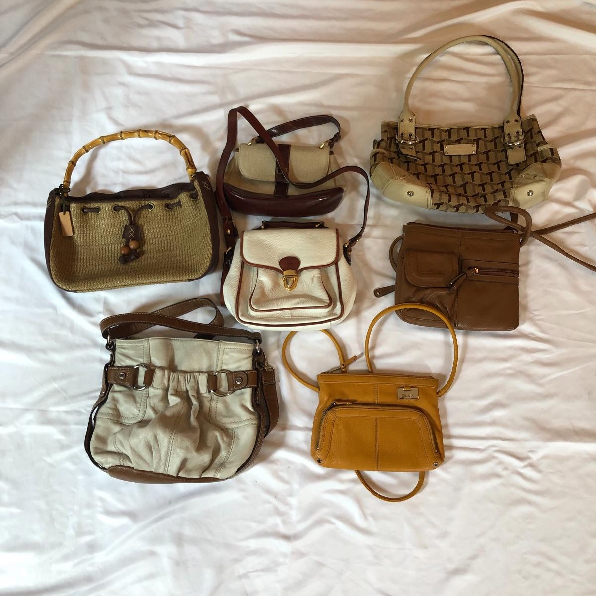 This collection of purses will give you a purse for everyday of the week. Lot includes four Tignanello purses with three being leather and one fabric and leather. Also includes three Etienne Aigner purses in leather, woven fabric and fabric. Largest purse measures 2.25” x 13” x 12”.