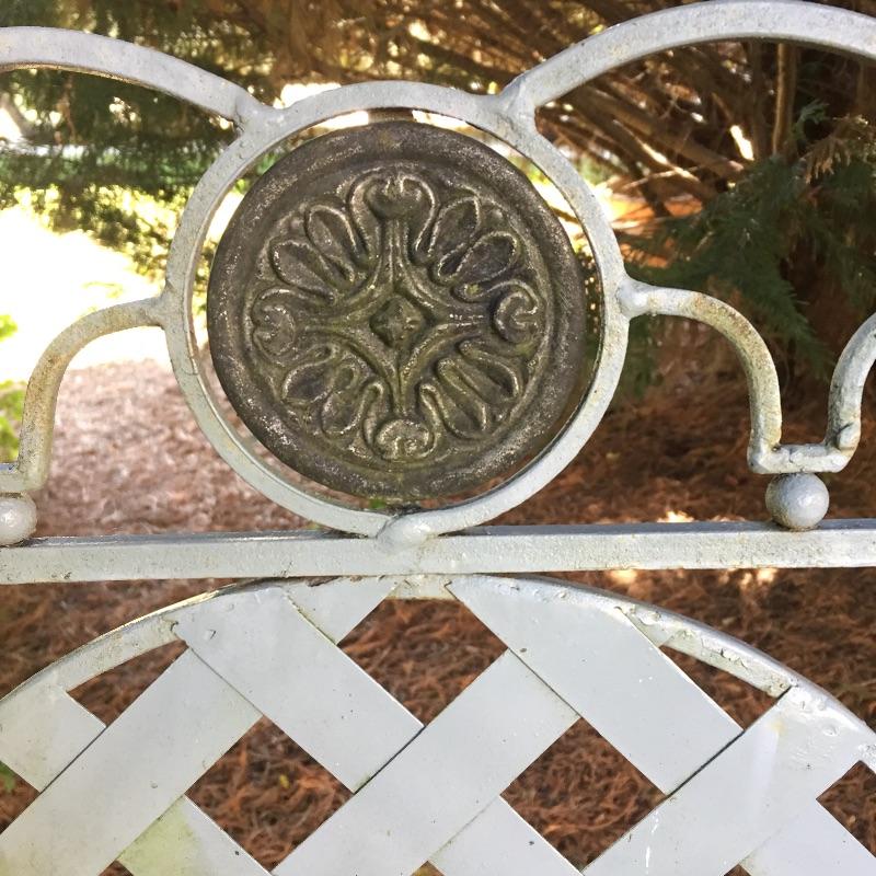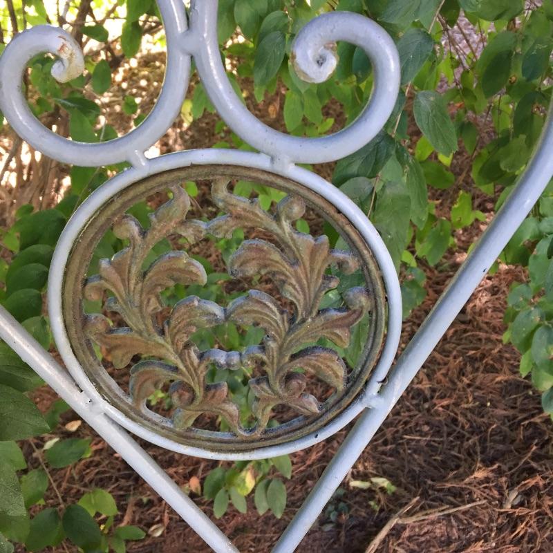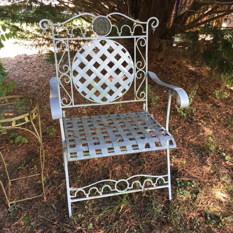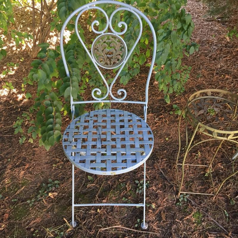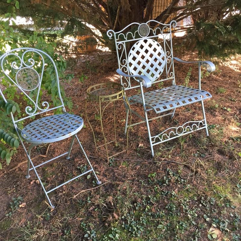 Two lovely blue painted vintage chairs with accents are accompanied by a metal plant stand. Both are good heavy chairs and each have their own unique accent piece within, giving them even more charm. The smaller of the chairs folds up and the larger should, but needs oil. Larger chair measures 19” x 24” x 37” with a 16” seat height.