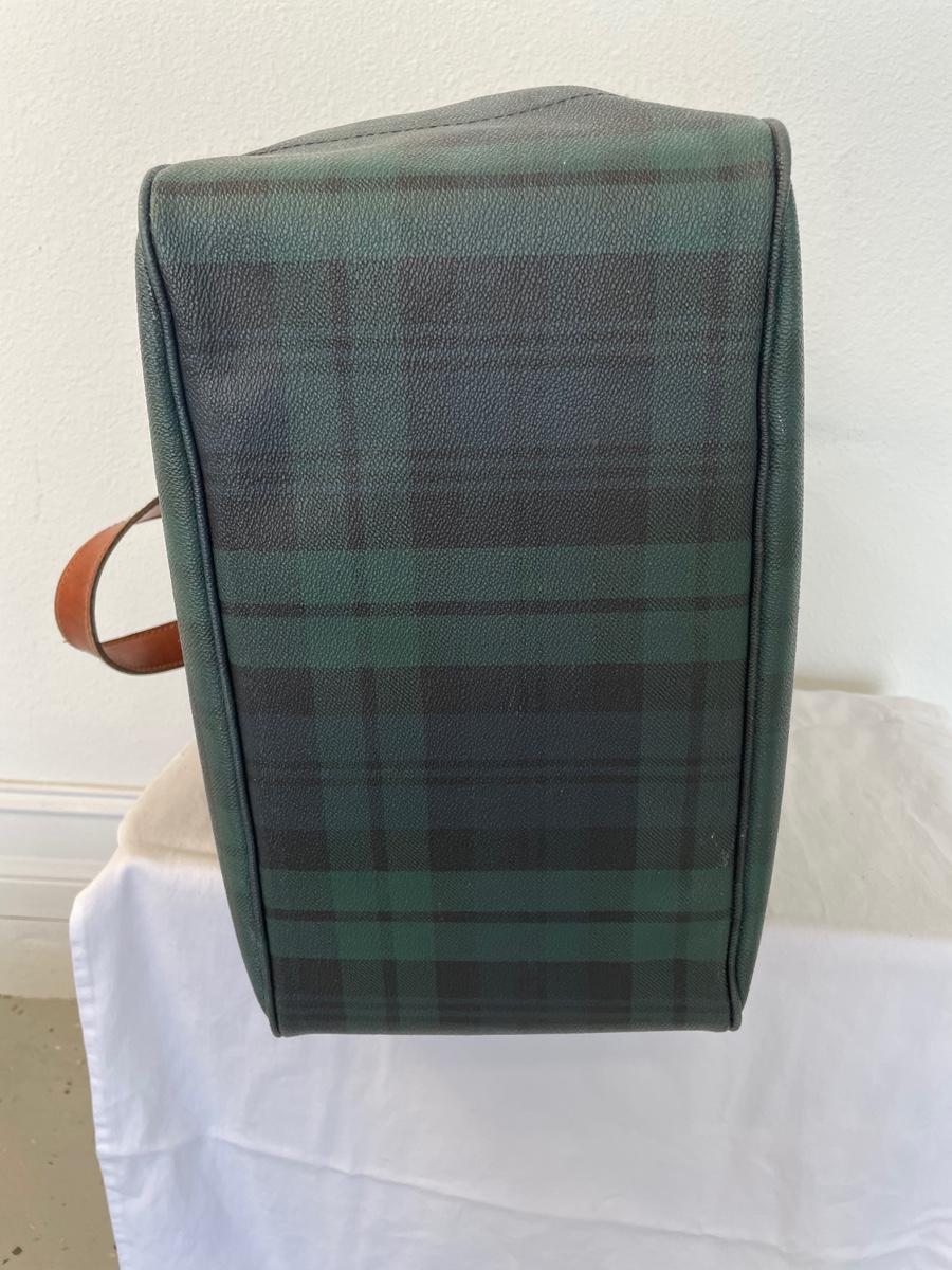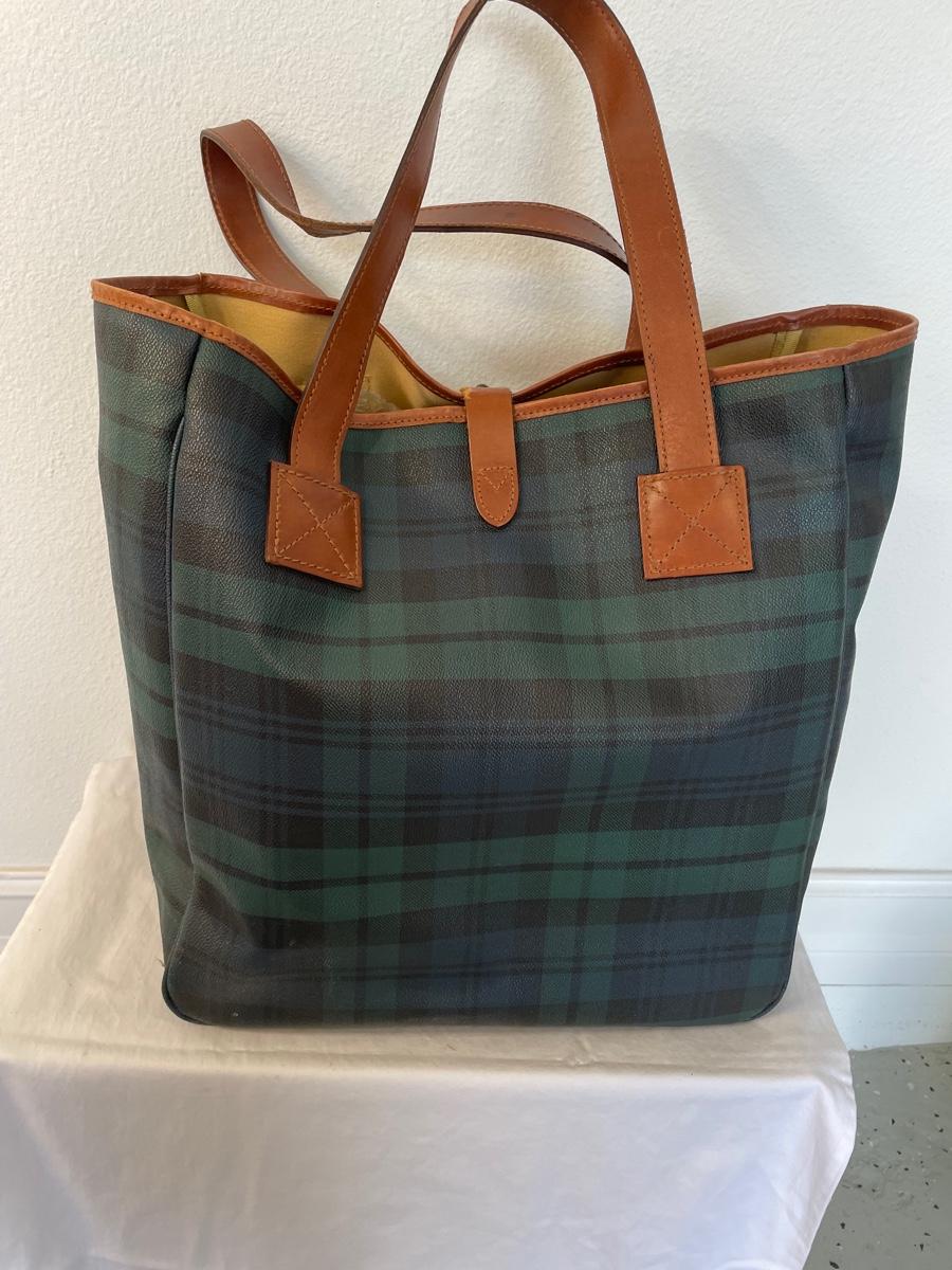 Reserve is $30 Coated canvas in black watch plaid pattern. Leather trim and handles. Very good condition. 14" tall X 13" wide X 6" deep