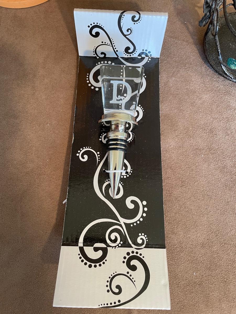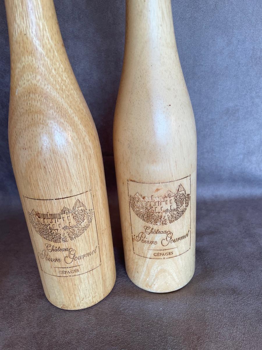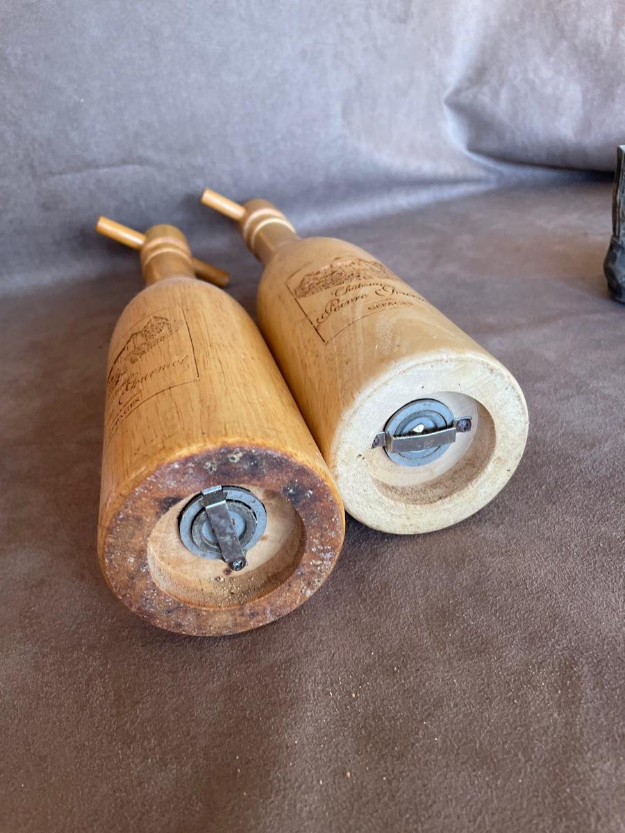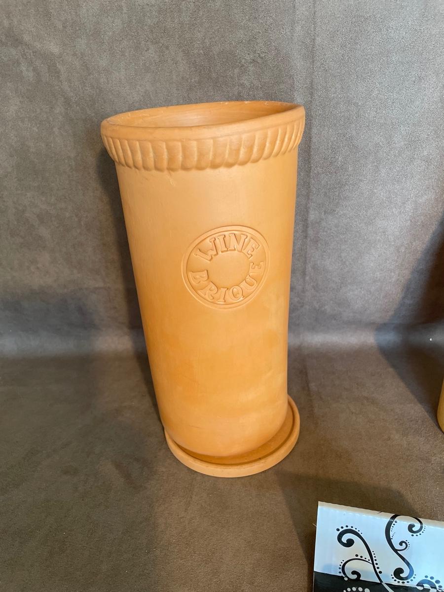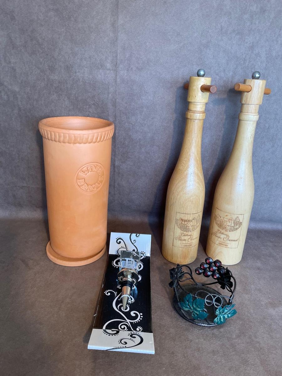 Terra cotta wine cooler and coaster, wine bottle stopper, metal bottle coaster and a pair of wine-themed salt and pepper grinders