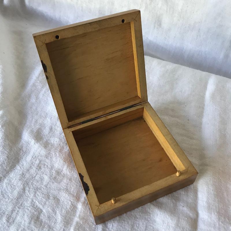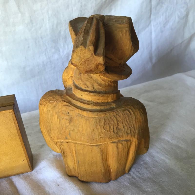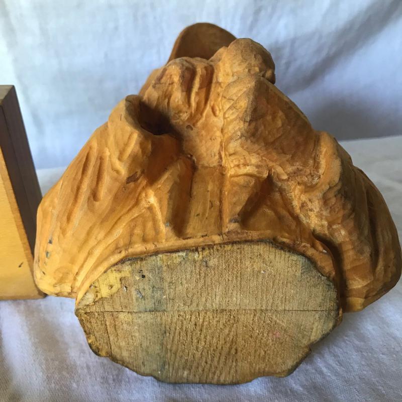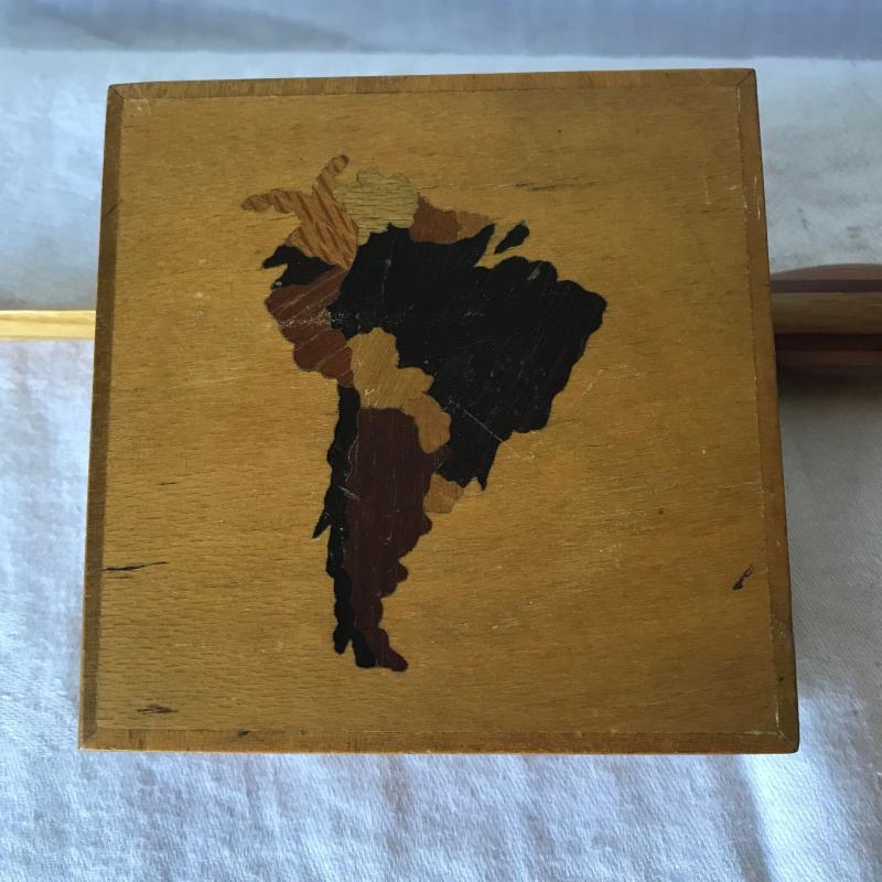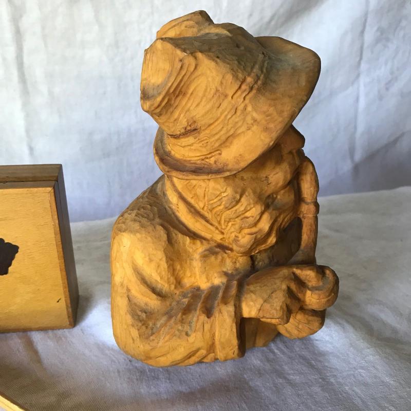 Lot includes three wooden pieces. One is the head and bust of a man smoking a pipe(6” x 5” x 8”) one is a box with Africa inlaid on the front and one is a letter opener (tip is chipped). No shipping