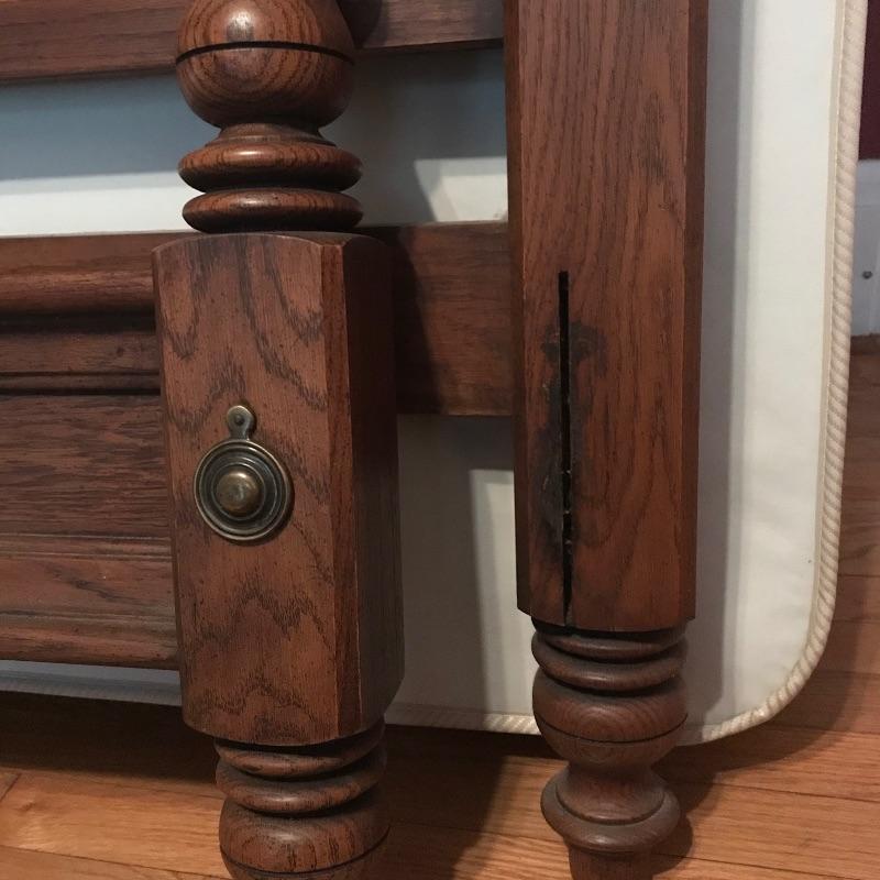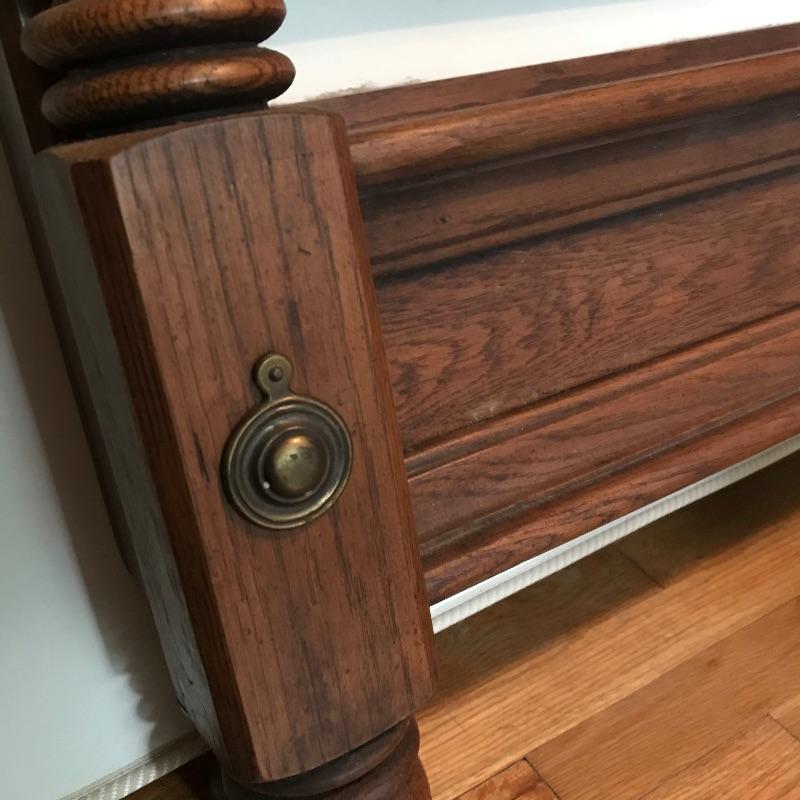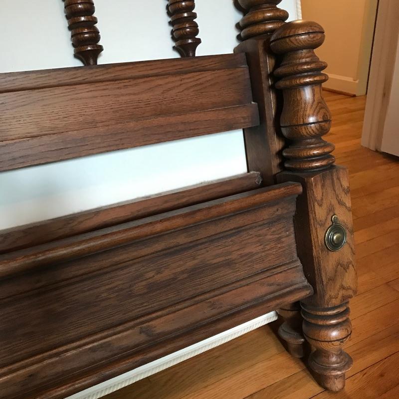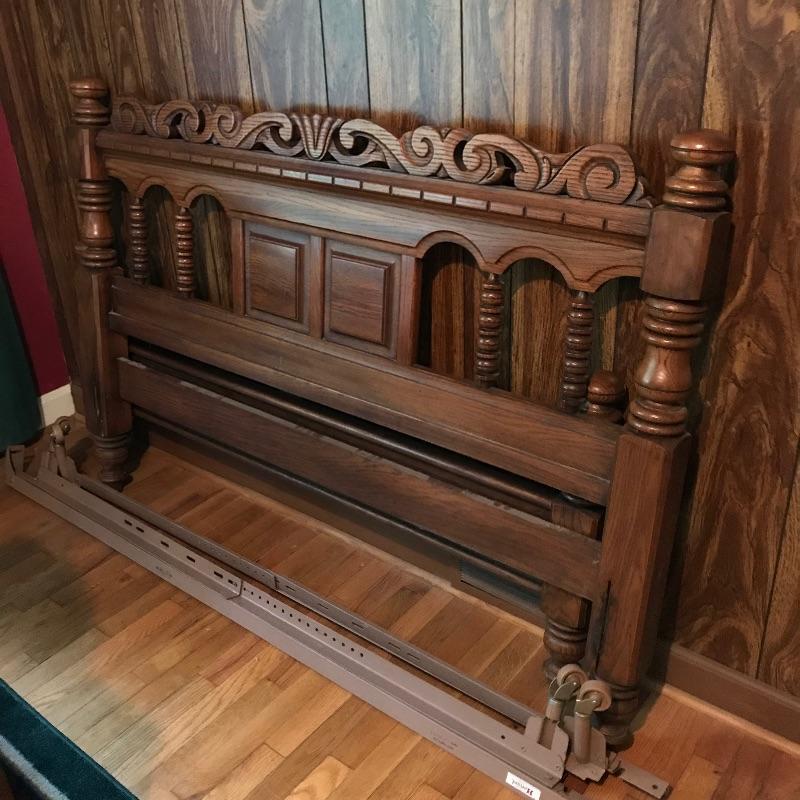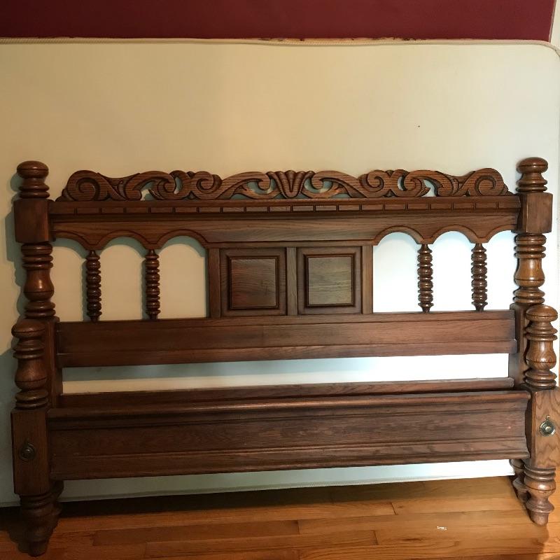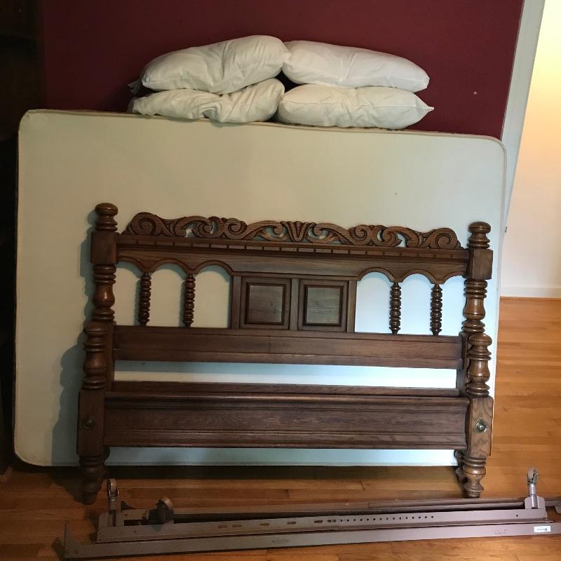 Stunningly crafted solid wood head and footboard. This bed has beautiful details throughout from the brass accents to the symmetry. The wood needs cleaning, but is overall in amazing condition. The headboard measures approximately 60” x 3.5” x 41”. Bed is complete with rolling metal frame. The frame doesn’t appear to attach to the head or footboard, there are slats for a vertical metal frame. Winning bidder may choose to take the matching mattress, box springs and four pillows if they so choose. Local pick up only.