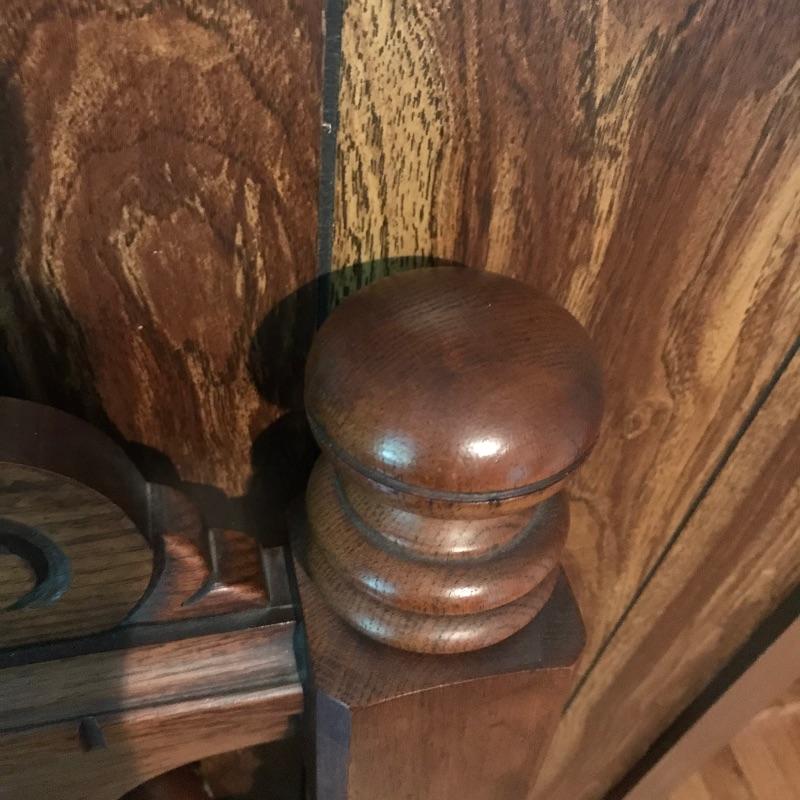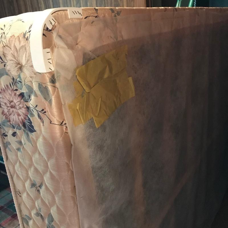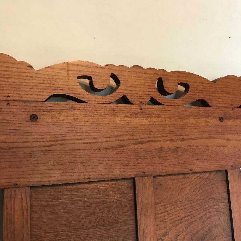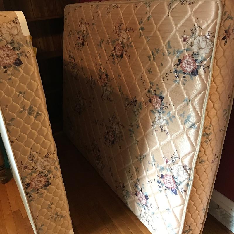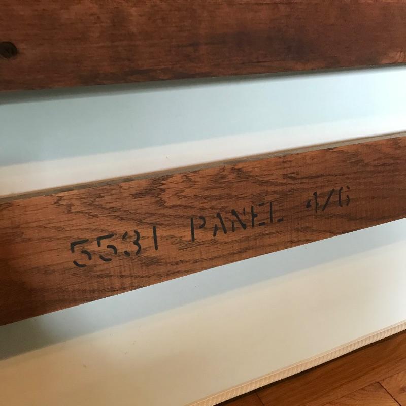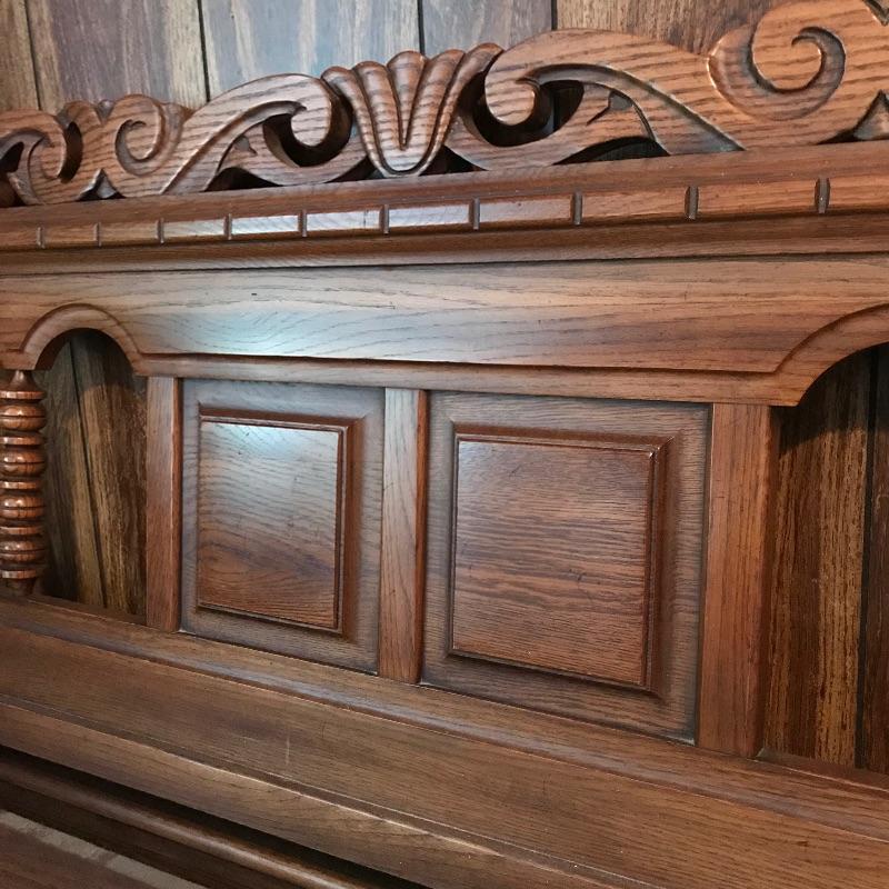 Stunningly crafted solid wood head and footboard. This bed has beautiful details throughout from the brass accents to the symmetry. The wood needs cleaning, but is overall in amazing condition. The headboard measures approximately 60” x 3.5” x 41”. Bed is complete with rolling metal frame. The frame doesn’t appear to attach to the head or footboard, there are slats for a vertical metal frame. Winning bidder may choose to take the matching mattress, box springs and four pillows if they so choose. Local pick up only.