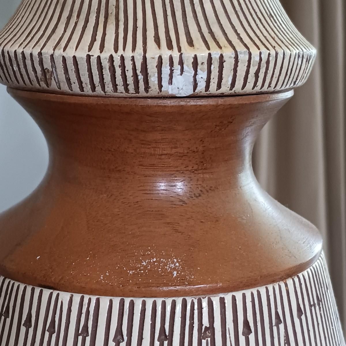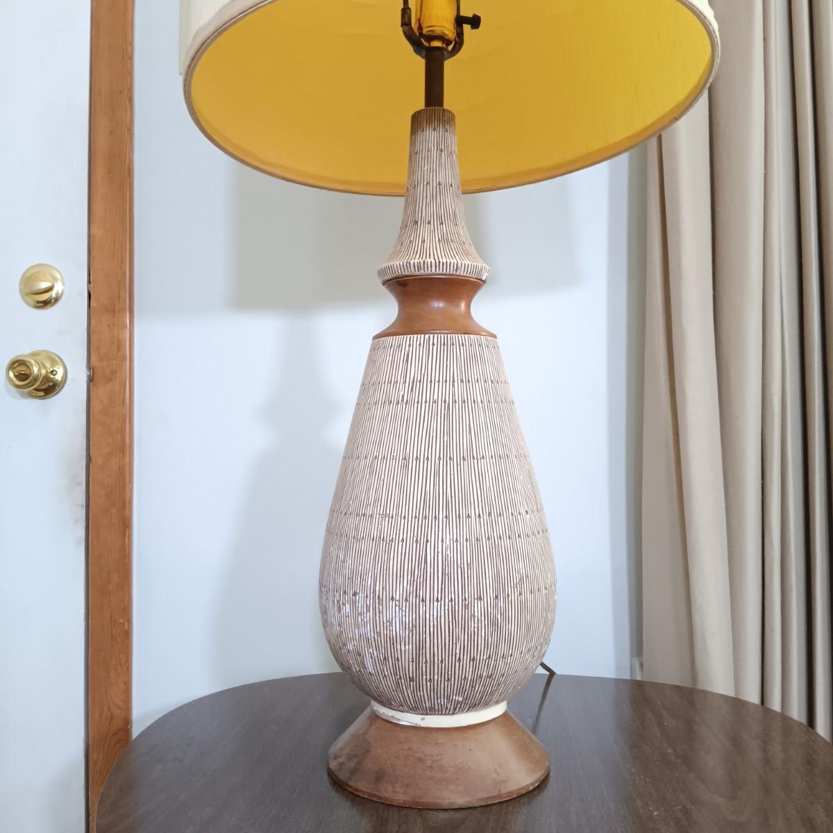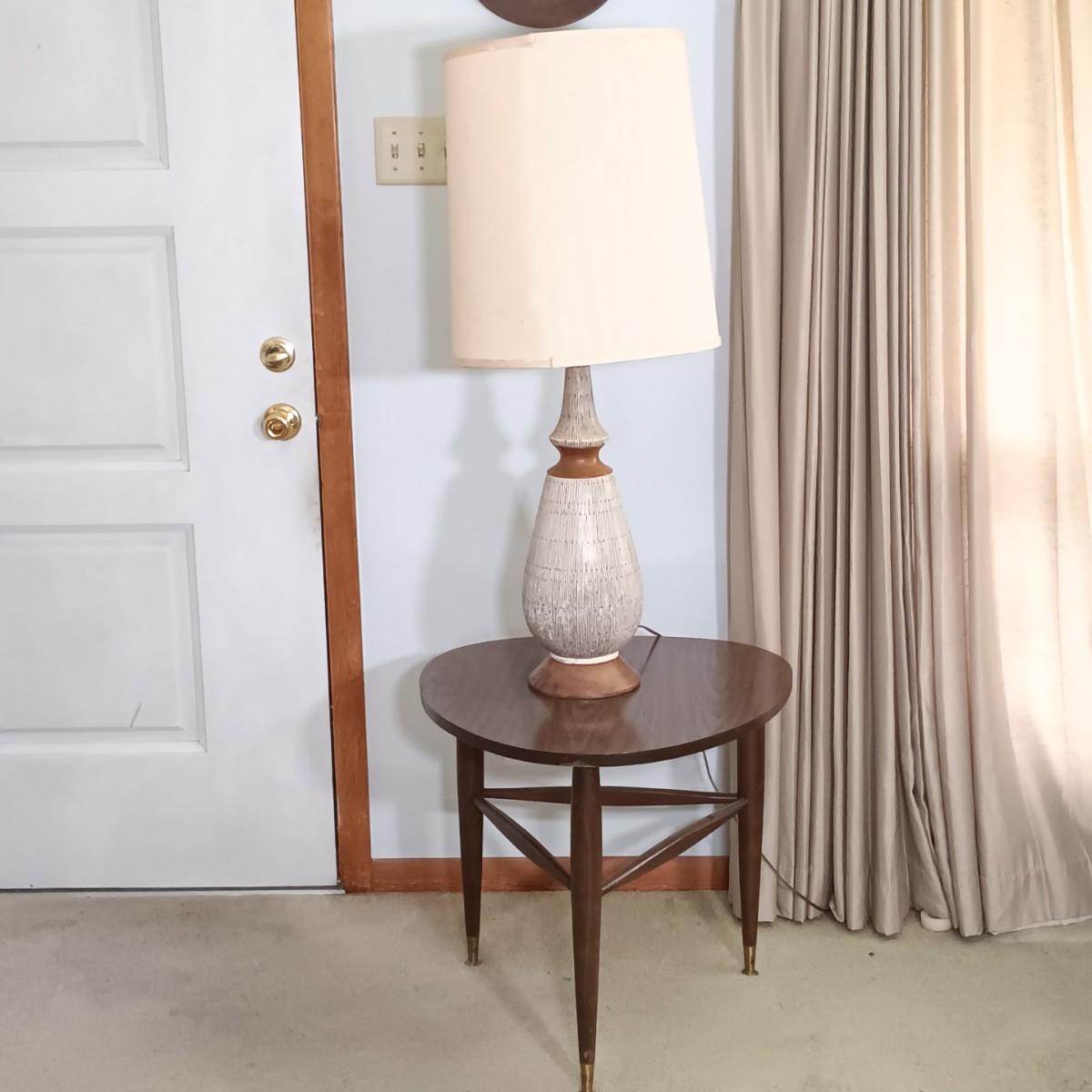 LOT 3: Mersman Guitar Pick Formica End Table w/ F.A.I.P. Chalkware and Wood Lamp