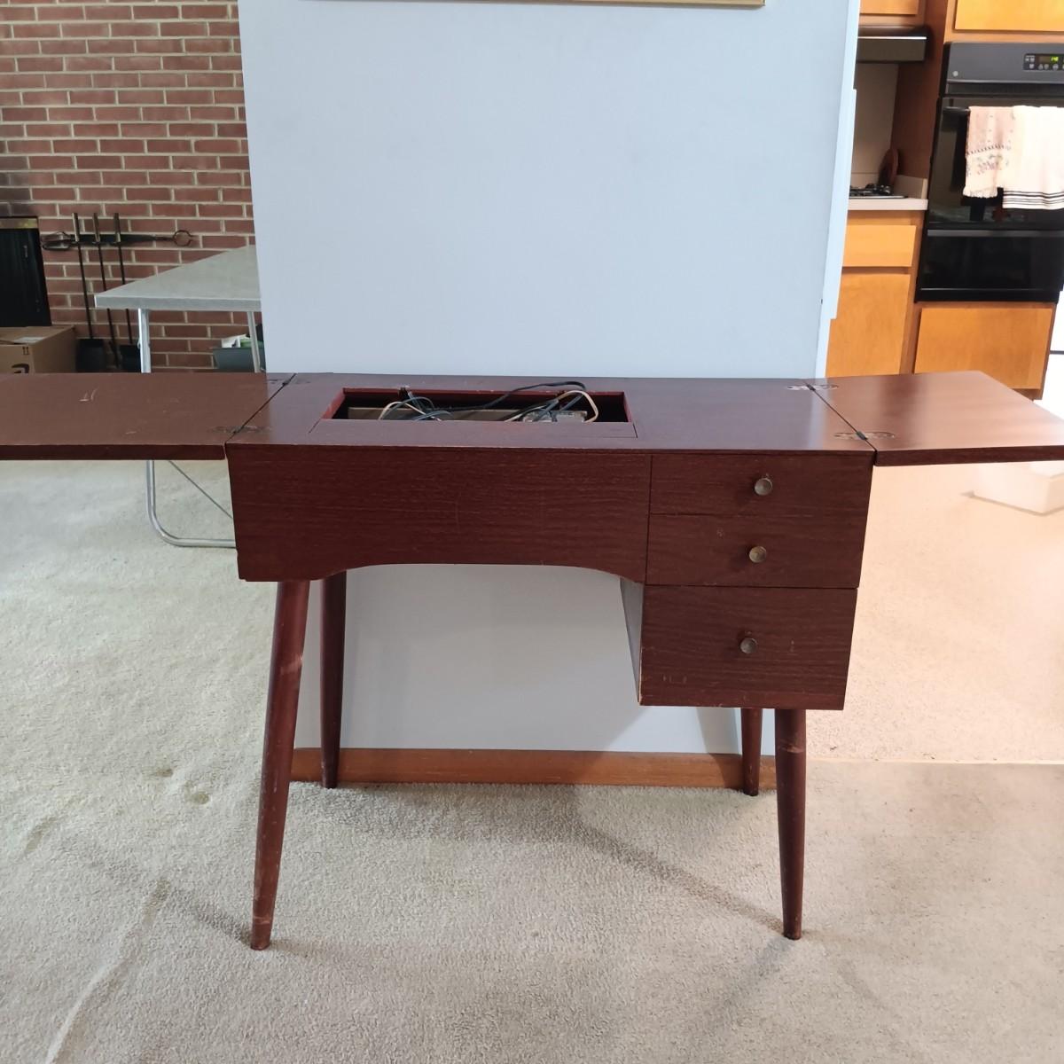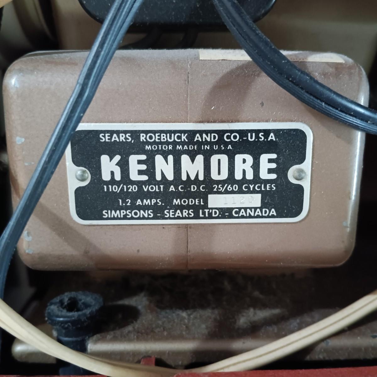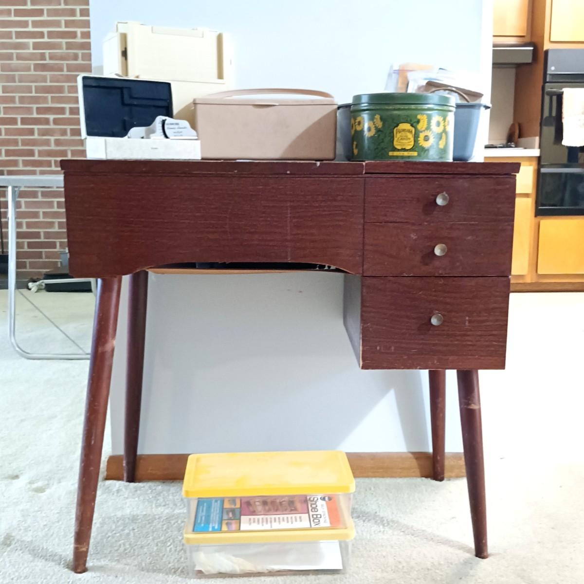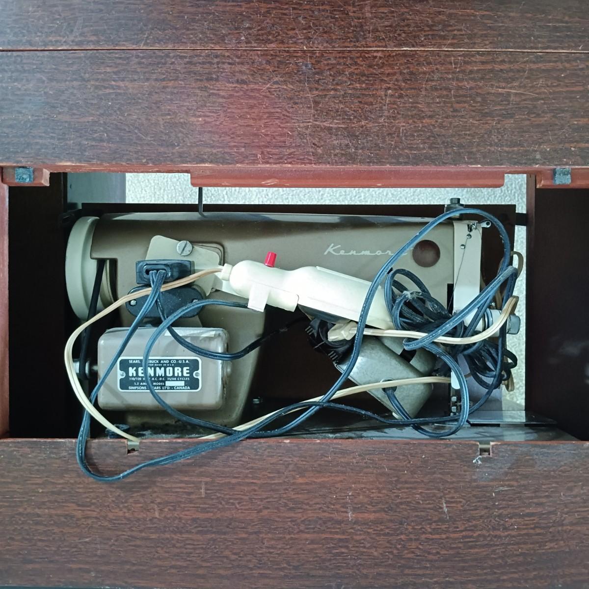 LOT 10: MCM Sewing Cabinet with Kenmore 1120 Sewing Machine, Plastic Thread Caddy, Sewing Notions & More